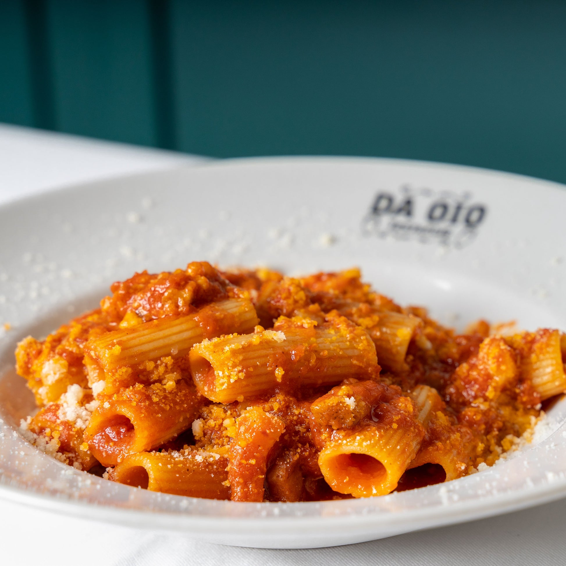 2 Portionen Pasta alla Pajata: Getrocknete Nudeln, fertige Pajata-Sauce, Pecorino Romano DOP.