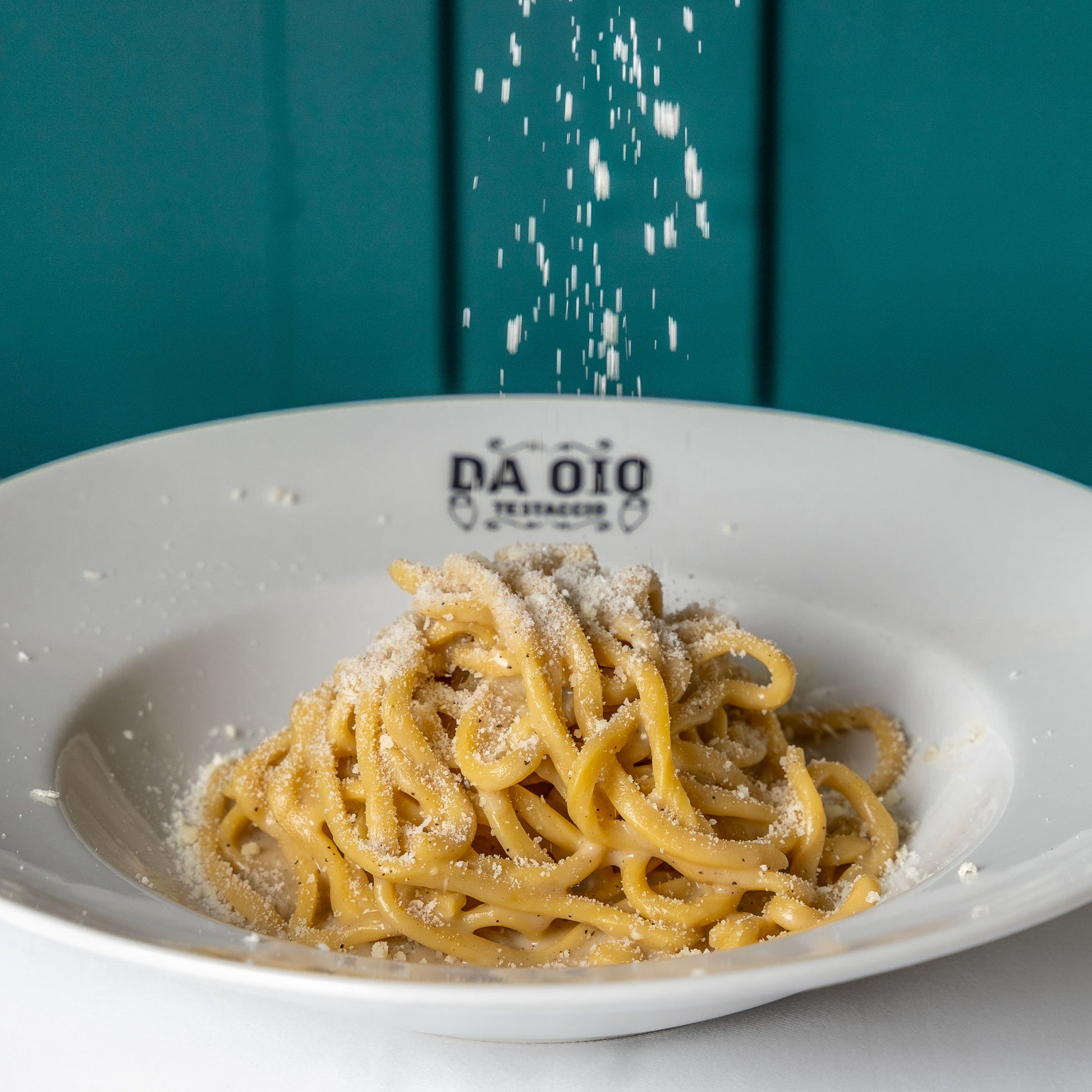 Römisches Vorspeisen-Set für 4 Personen . Carbonara , Amatriciana , Cacio e Pepe , Rigatoni alla Pajata – alles Spezialitäten nach dem traditionellen Rezept der historischen römischen Taverne Da Oio in Testaccio . Wählen Sie Ihre Favoriten und genießen Sie sie direkt zu Hause! 100 % handwerkliche und frische Produkte, in wenigen Minuten fertig!