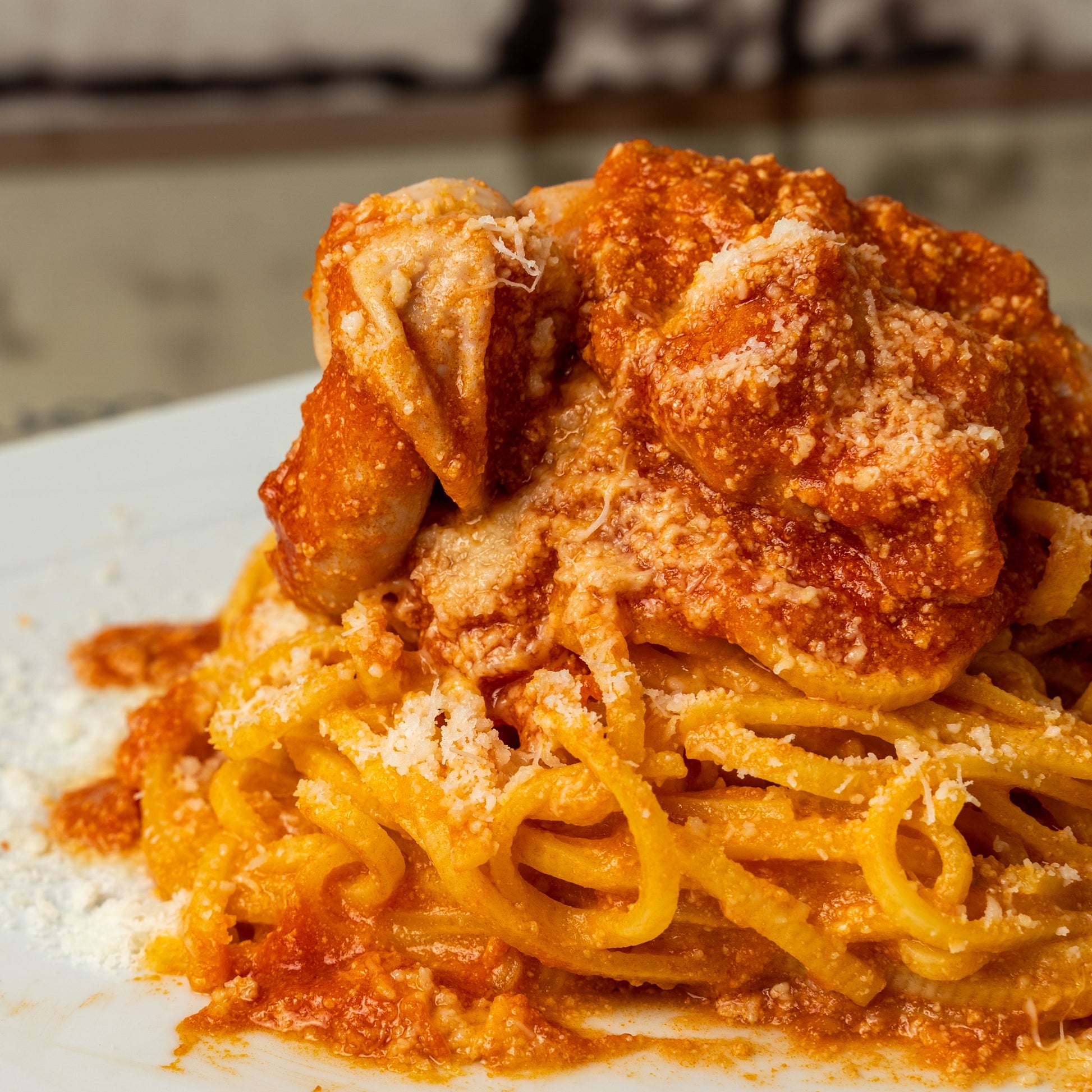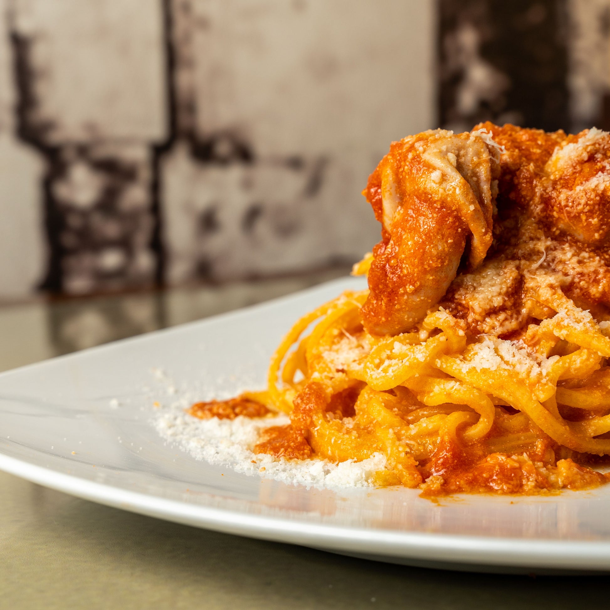 Frische Tagliolini-Nudeln, Pajata- und Nodini-Sauce, geriebener Pecorino-Käse.