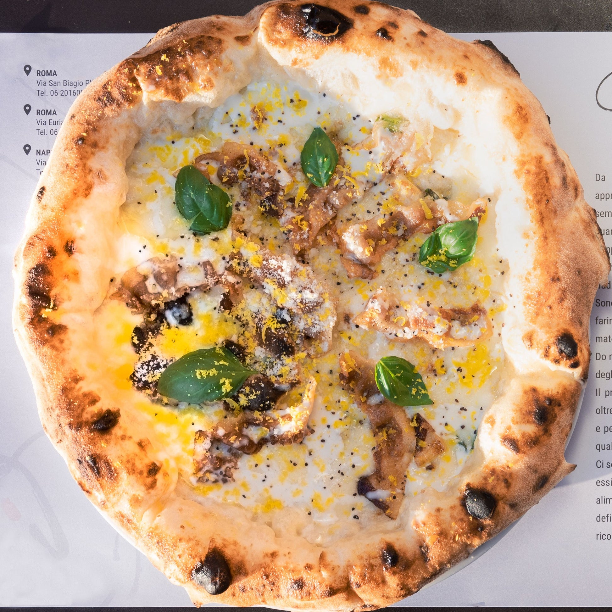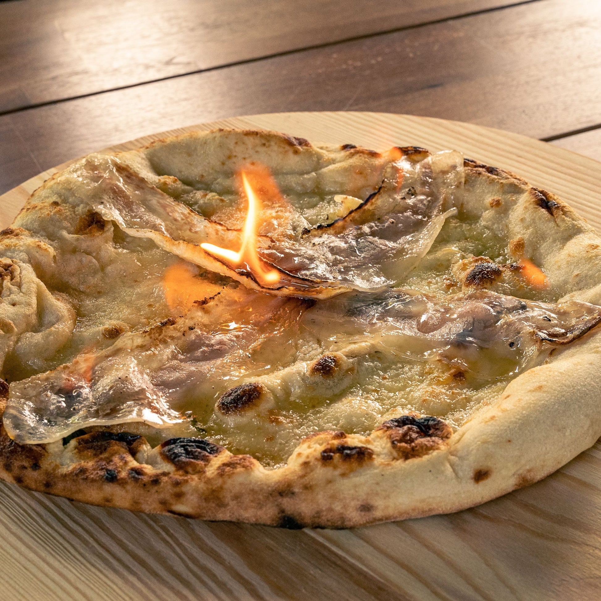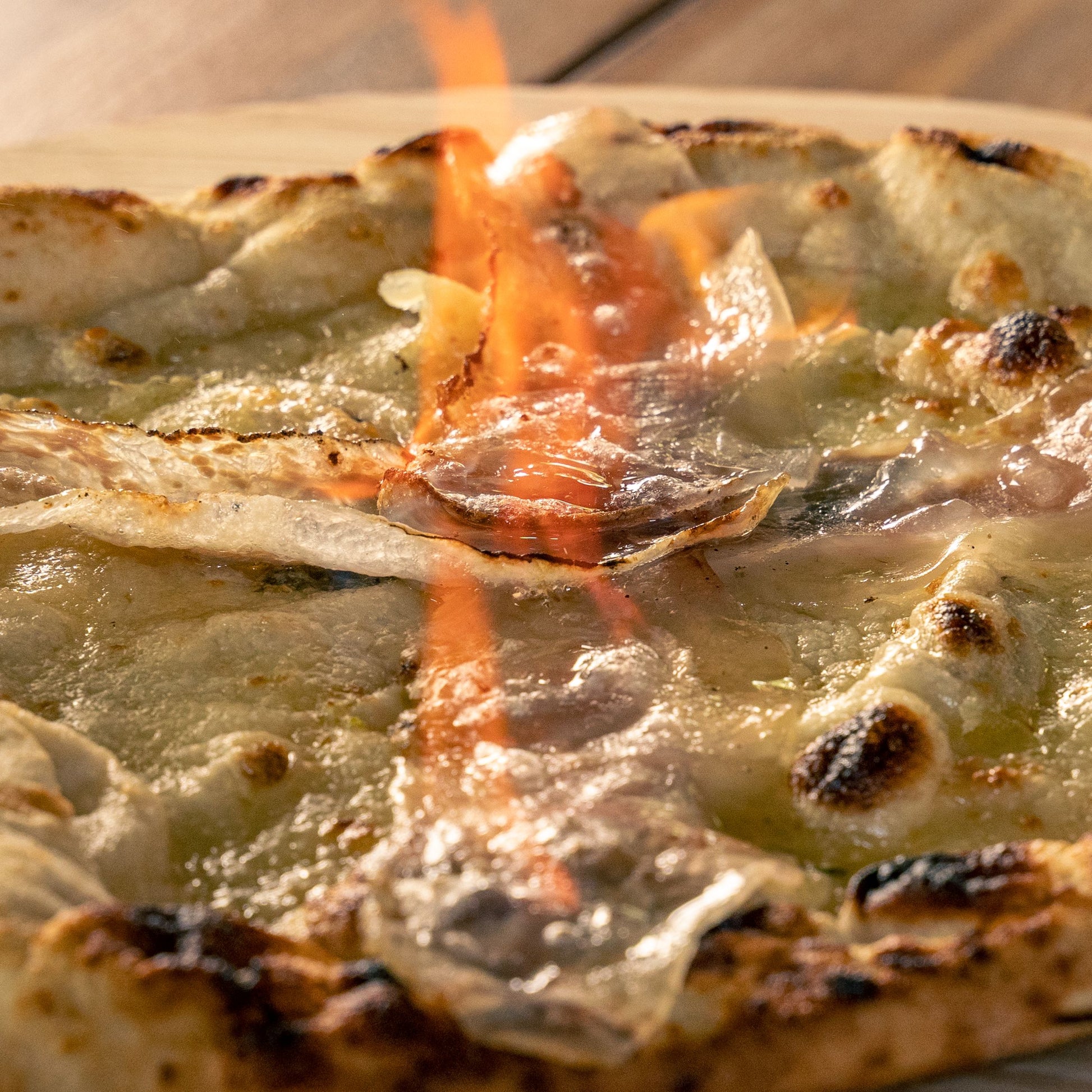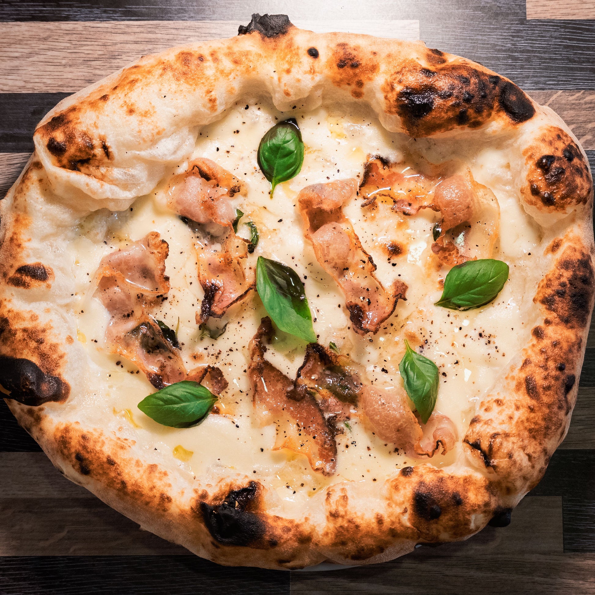 Pizza Gricia in FiammeFiordilatte, Pecorino-Creme, knuspriger Speck und Cuvée-Pfeffer