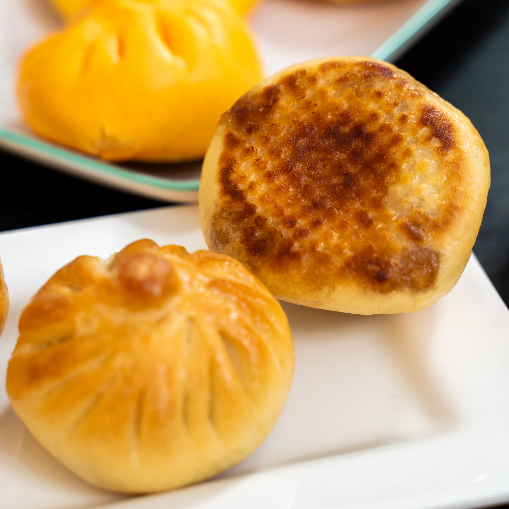 • Sheng Jian Bao (gegrillt) (4 Stück): 72 Stunden gesäuerter Teig, Weizenmehl, Schweinefleisch, Mangold, Frühlingszwiebeln, Ingwer, Sesam.