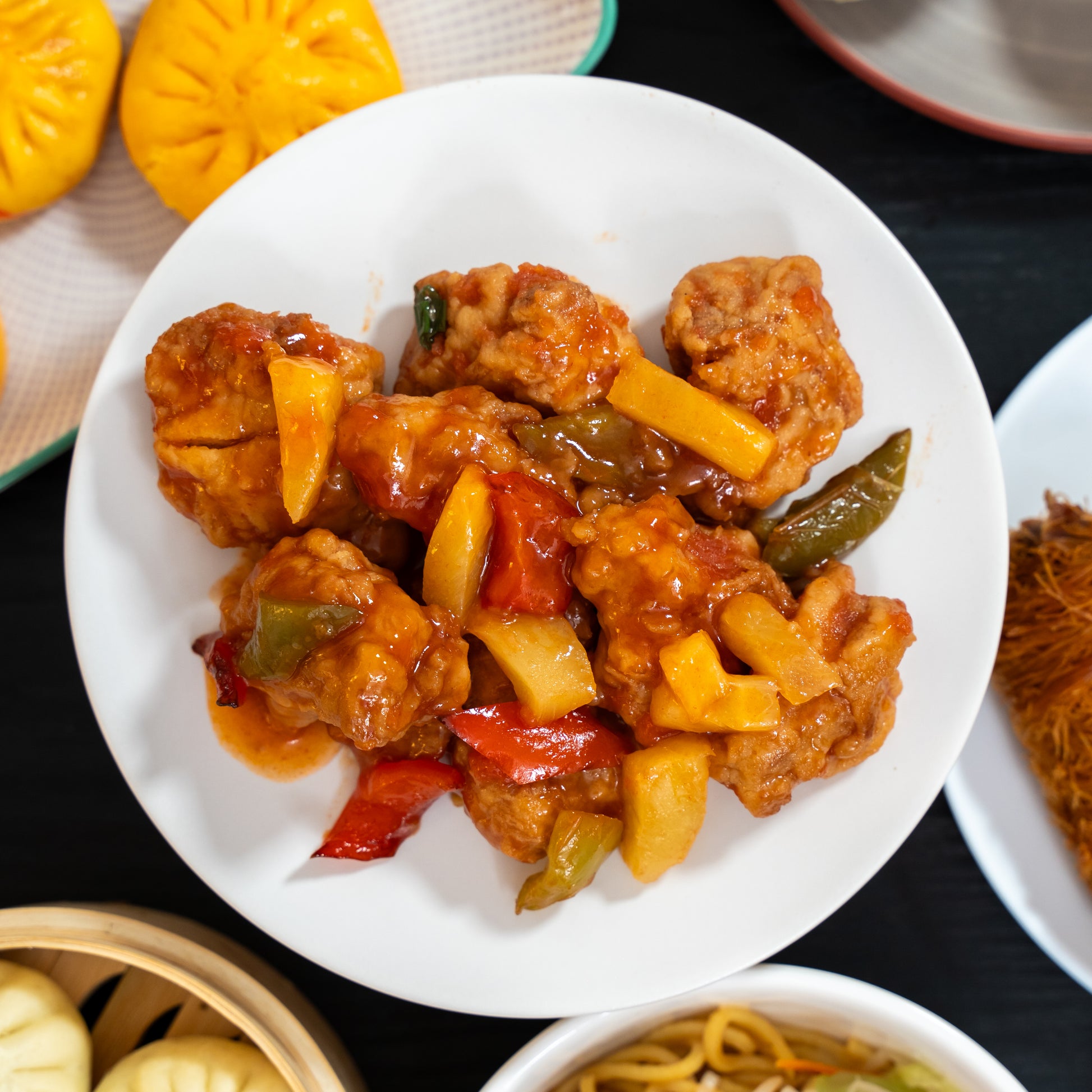 • Hähnchenbissen in süß-saurer Sauce (2 Portionen)Knusprige Hähnchenstücke, übergossen mit einer köstlichen hausgemachten süß-sauren Sauce, eine perfekte Balance aus Süße und einer leicht säuerlichen Note.Zutaten:paniertes Brathähnchen, hausgemachte süß-saure Soße, Ananas.