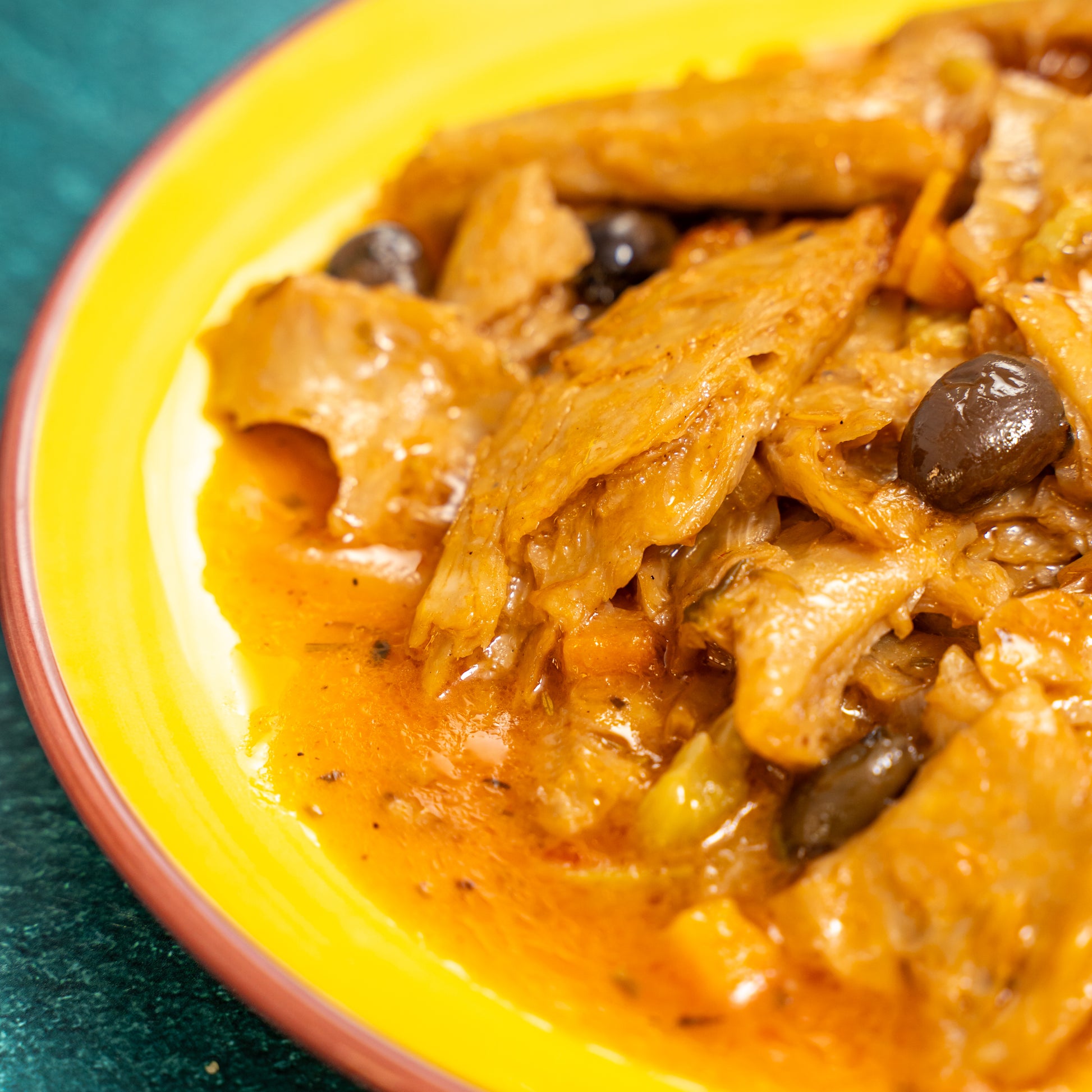 -200g Veggie Chicken CacciatoreZutaten: Wasser, dekonstruiertes Soja, Tomatenmark, natives Olivenöl extra, Weißwein, Taggiasca-Oliven in nativem Olivenöl extra [Pitonierte Taggiasca-Oliven (60,00 %), natives Olivenöl extra (40,00 %), Salz, Säureregulatoren [Milchsäure, Zitronensäure]], Sonnenblumenöl, weiße Zwiebeln, Karotten, Sellerie, Weißweinessig [Wein (Sulfite), Antioxidationsmittel [E220 (enthält Sulfite)]], Feinsalz [Salz, Trennmittel: E536], Maisstärke, Bitterkakao, Knoblauch, Rosmarin.