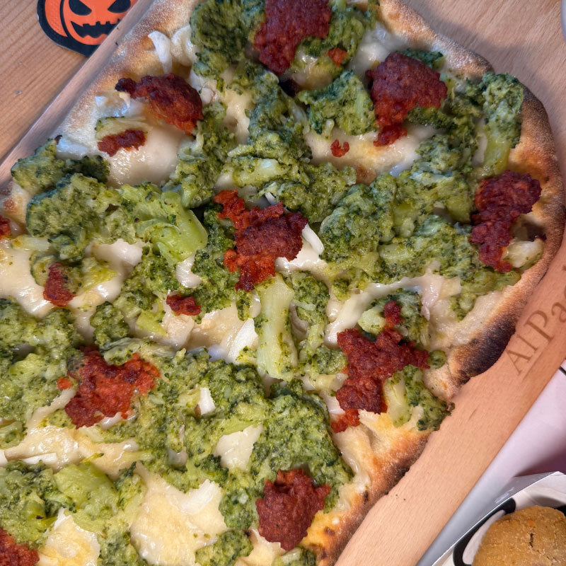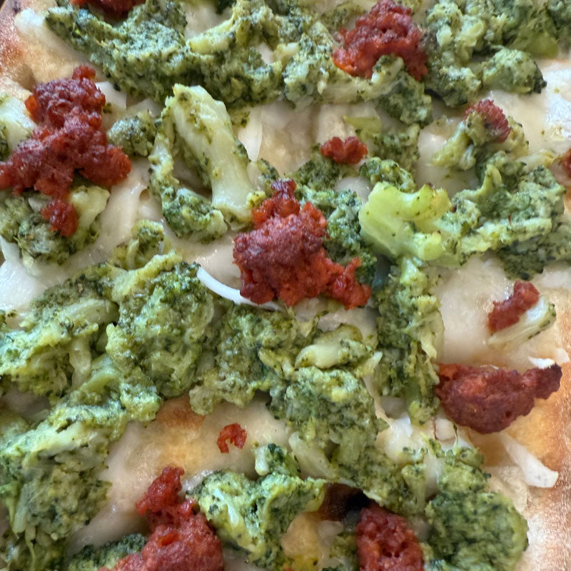 • 1 grüne Brokkoli-Pinsa: veganer Mozzarella, sautierter Brokkoli, vegane Wurst.