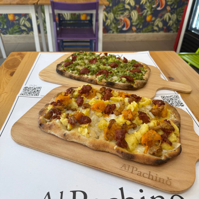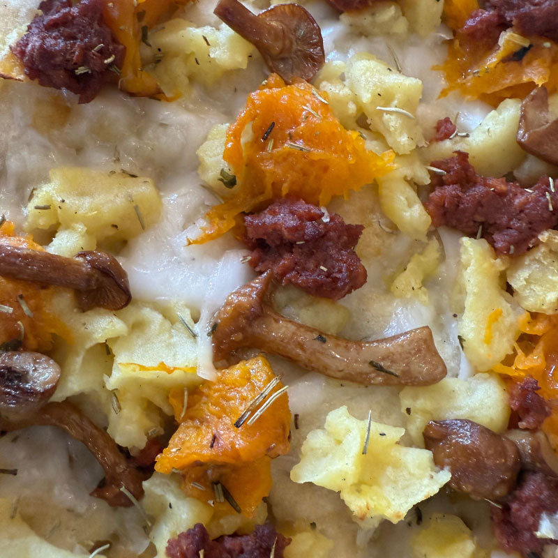 • 1 Herbst-Pinsa: gebackener Kürbis, Kartoffeln, vegane Wurst, Honigpilze und veganer Mozzarella.*Allergene: 1,6.