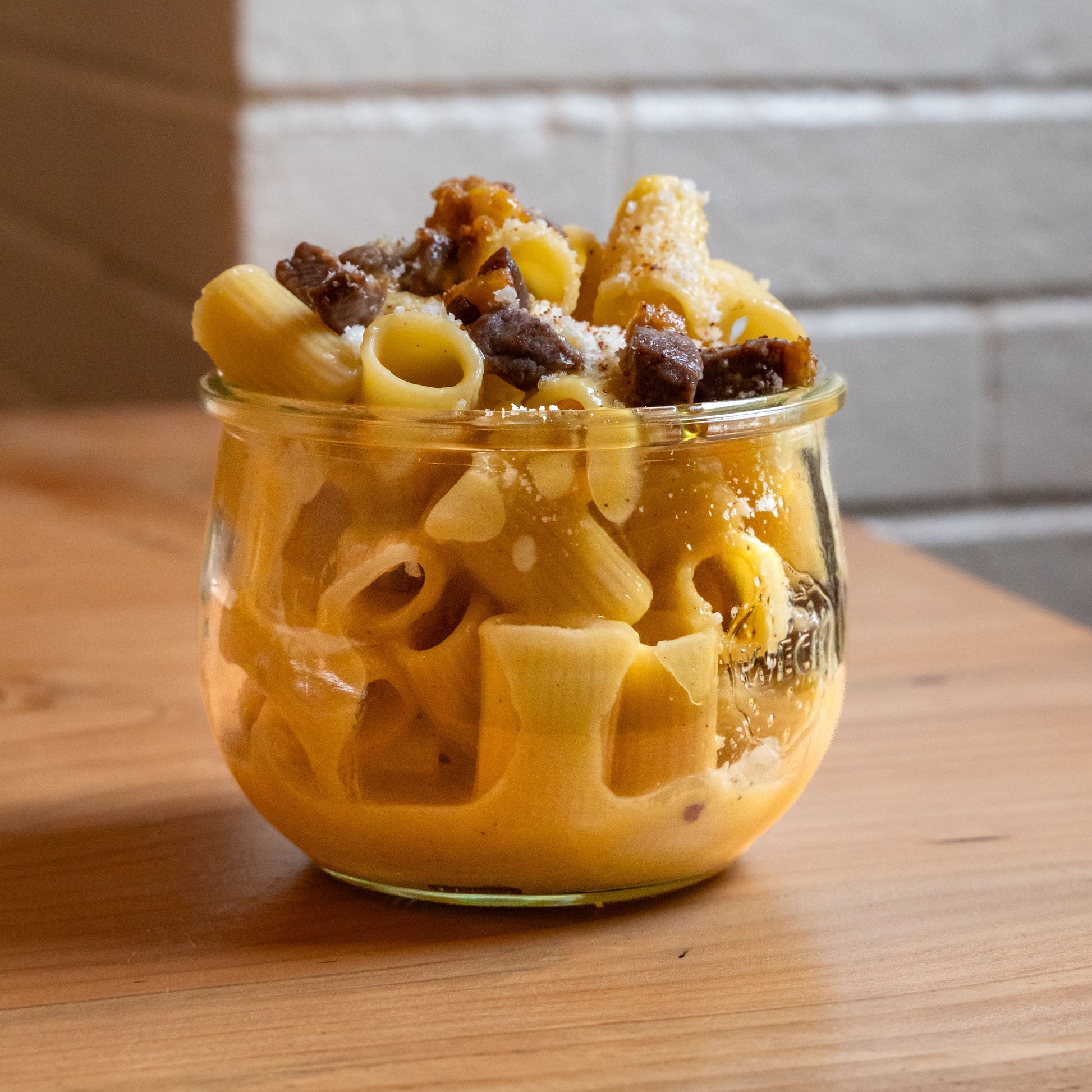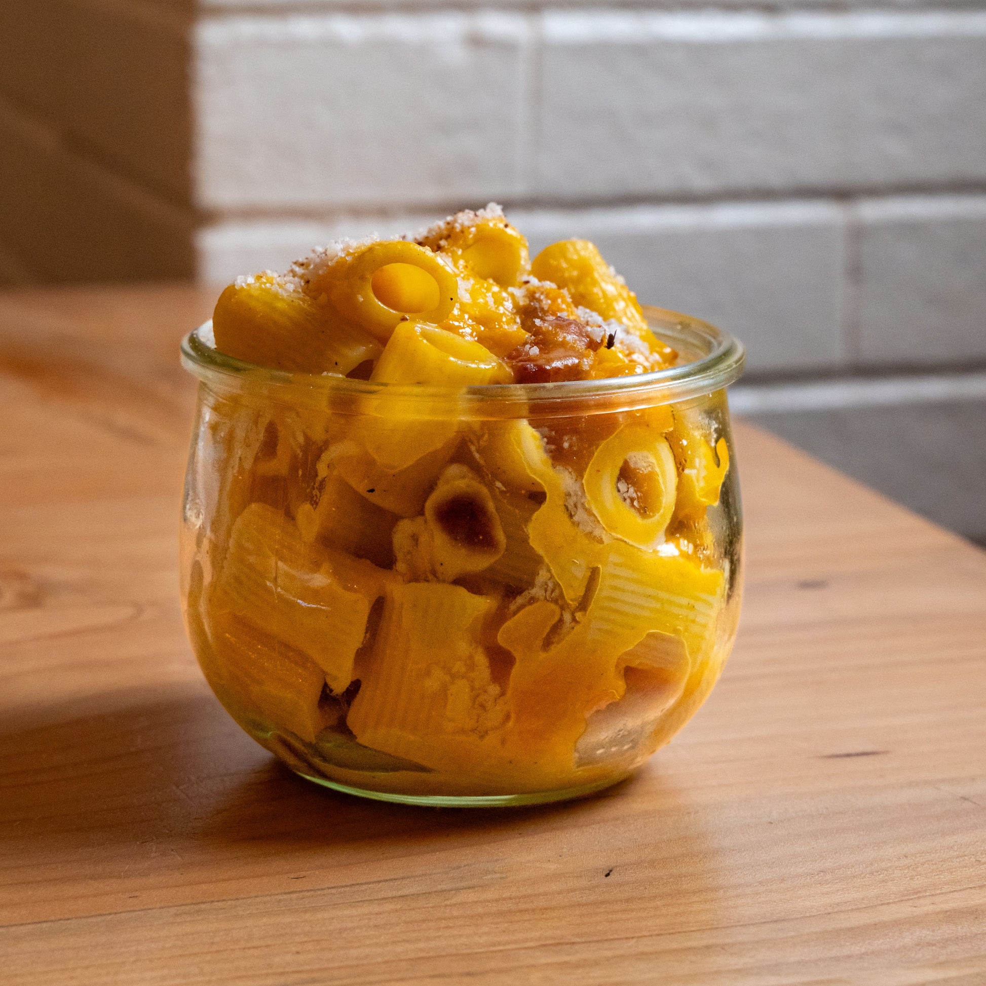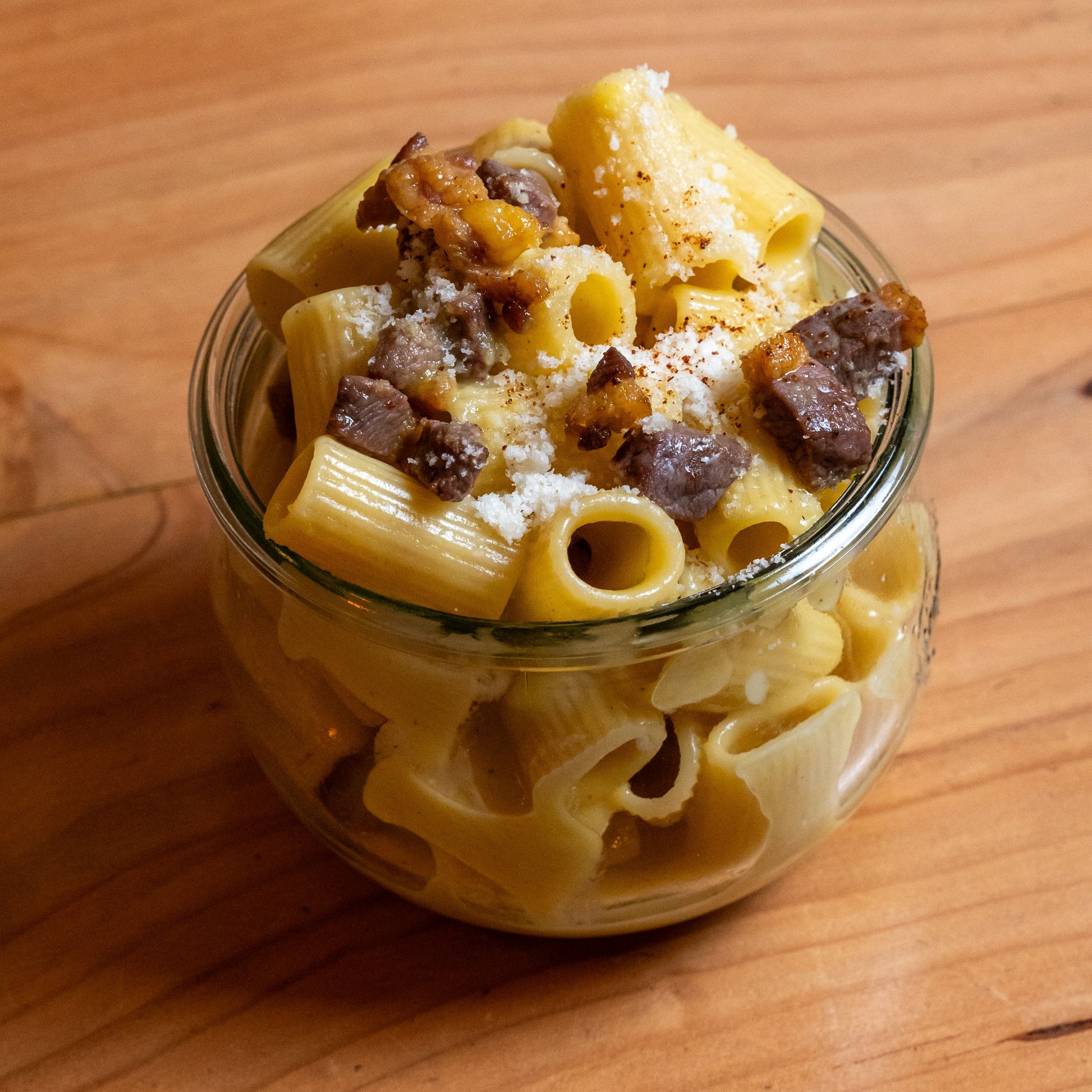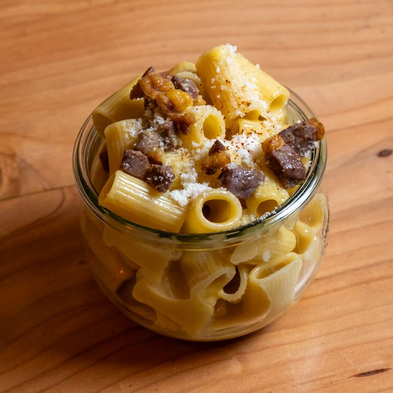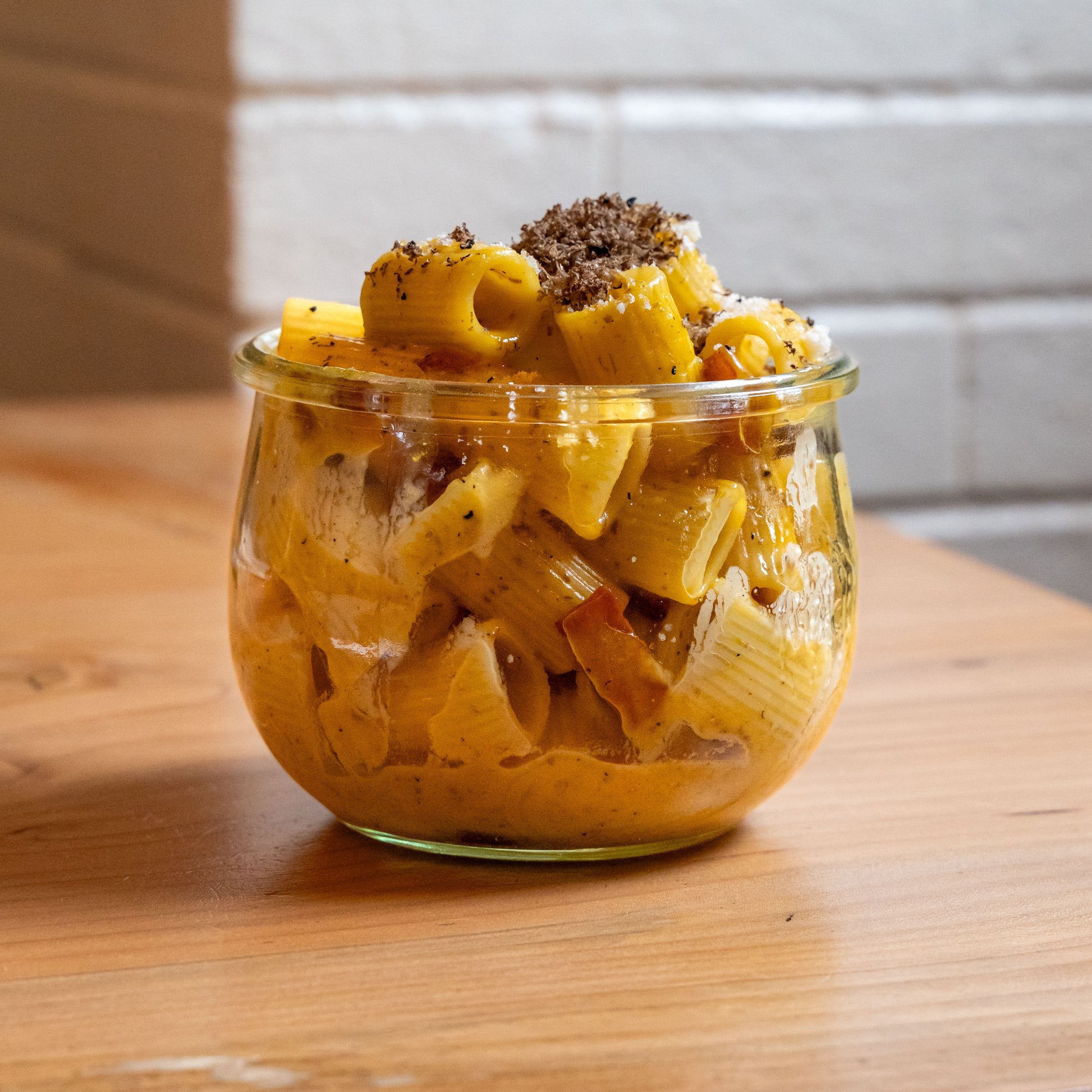 • Die klassische Carbonara: traditionelle Carbonara mit Bio-Eiern, Amatriciana-Speck, Pecorino Romano DOP, Parmigiano Reggiano, schwarze Pfeffermischung.