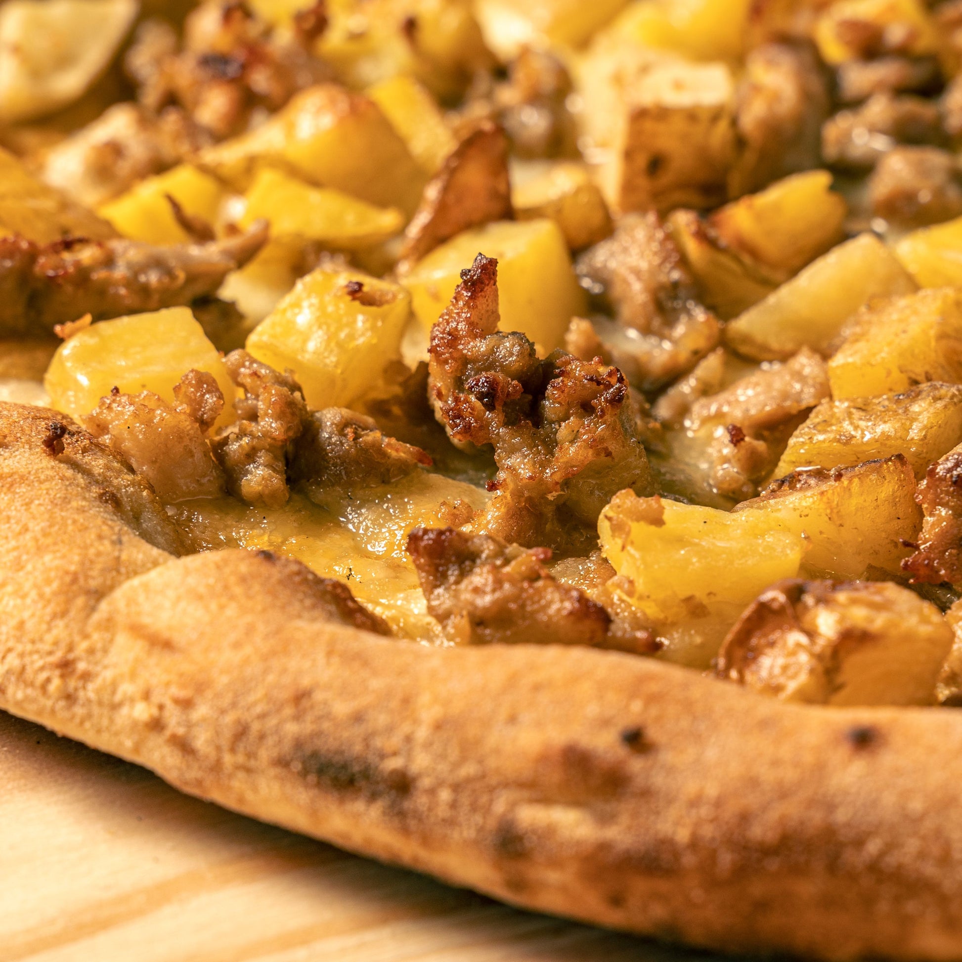 Neue PizzaGeräucherter Büffelmozzarella, neue Kartoffeln, Caserta-Schwarzschweinwurst und Cuvée-Pfeffer