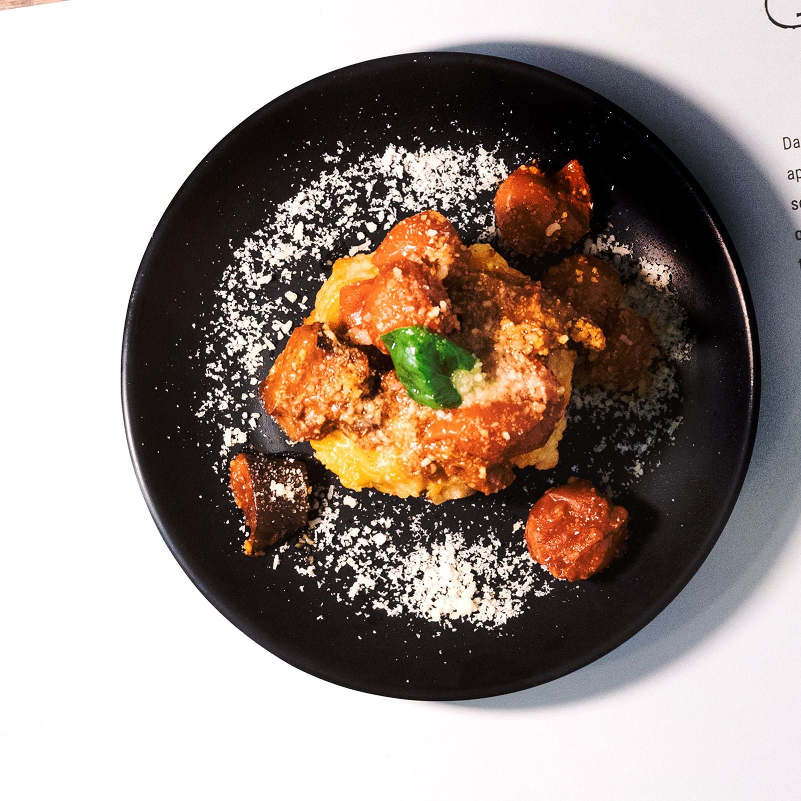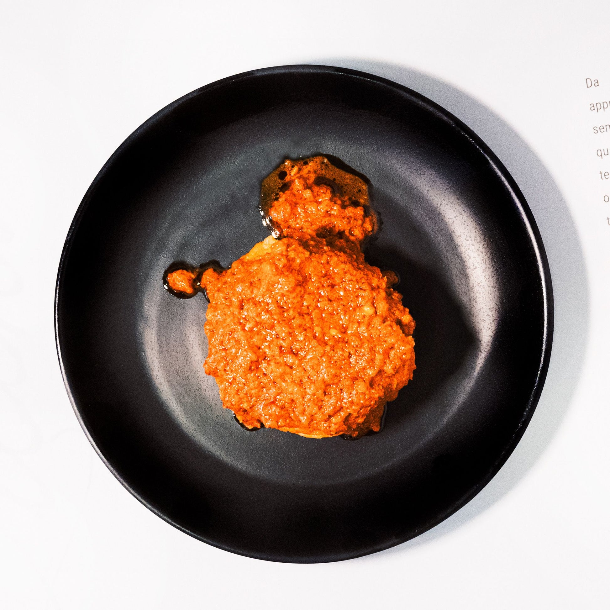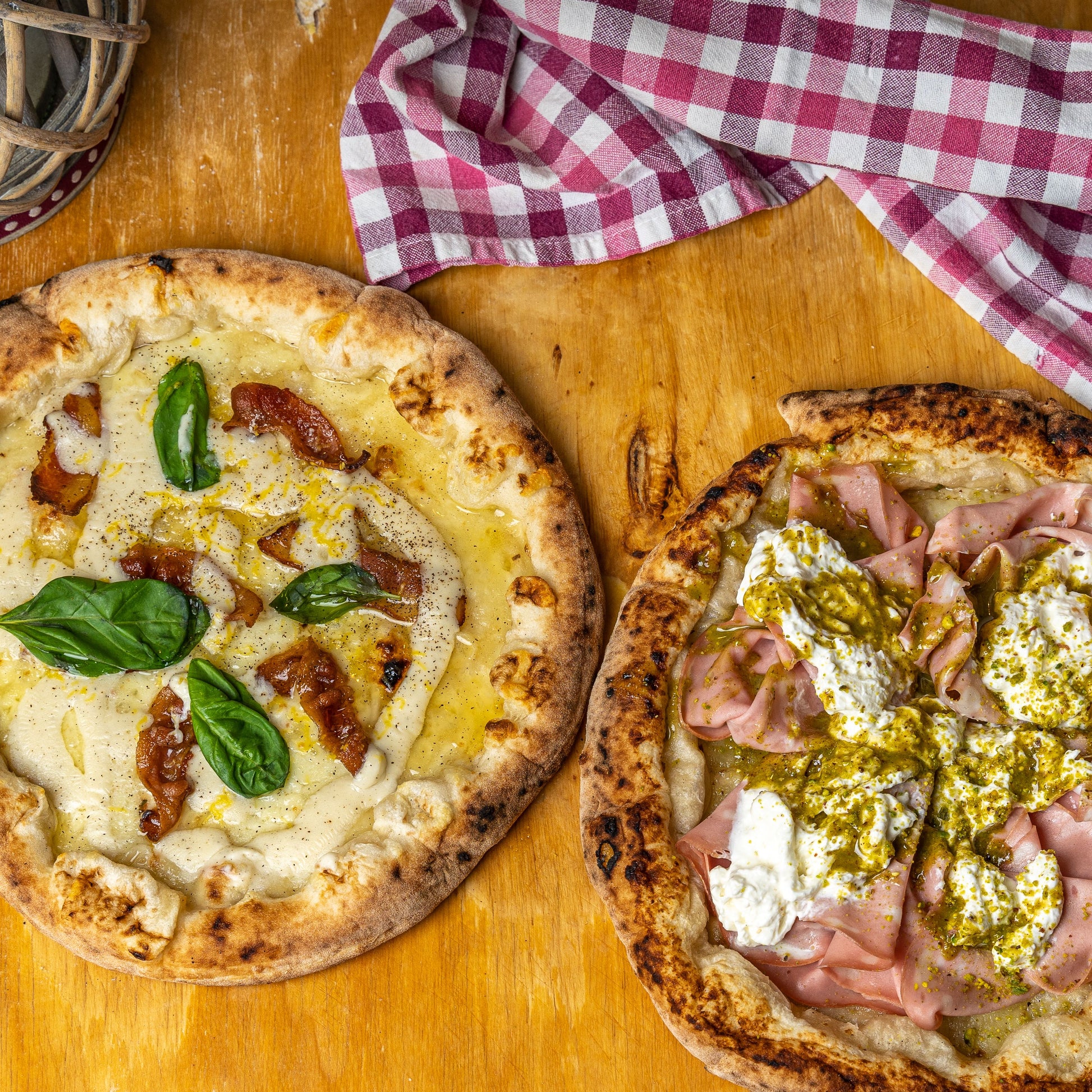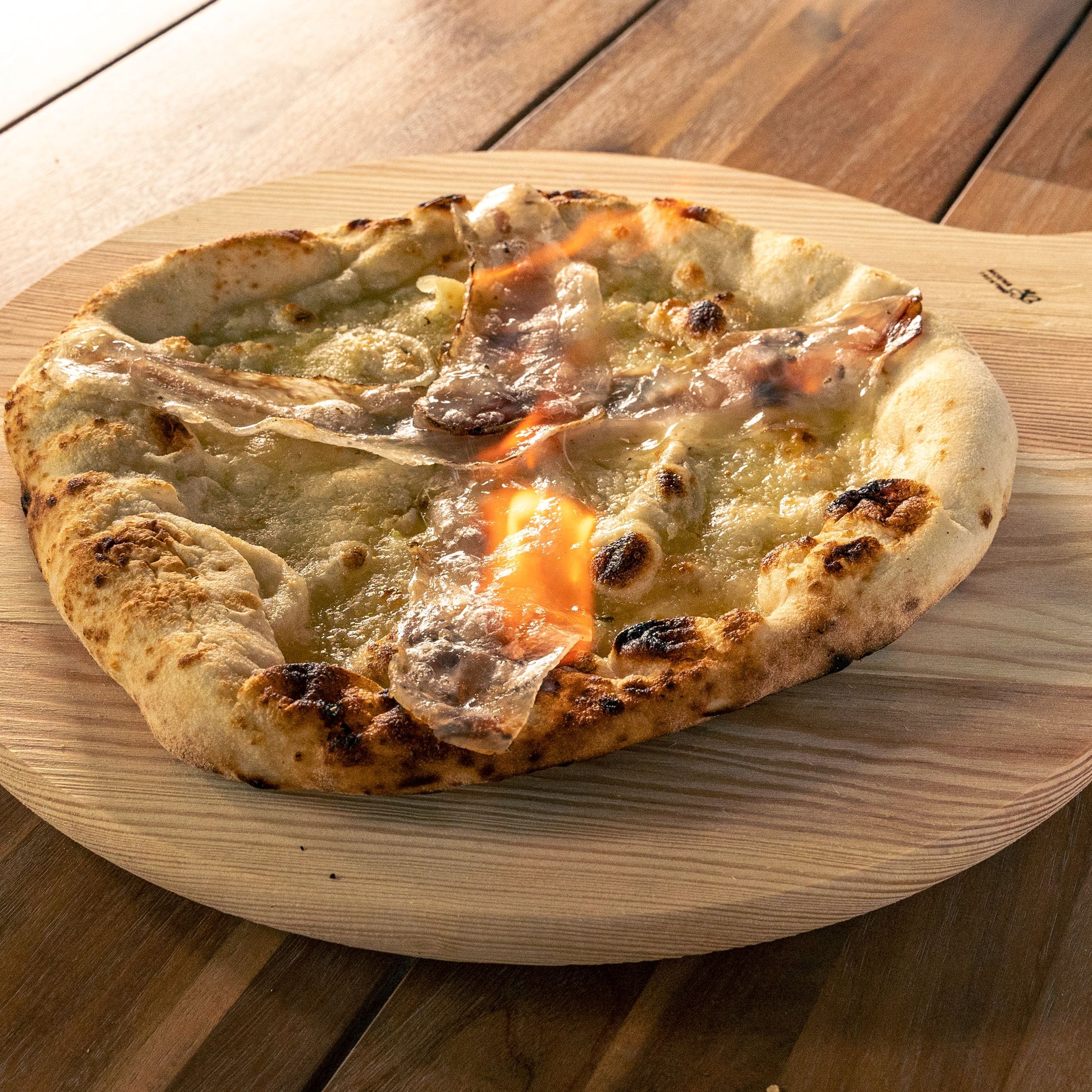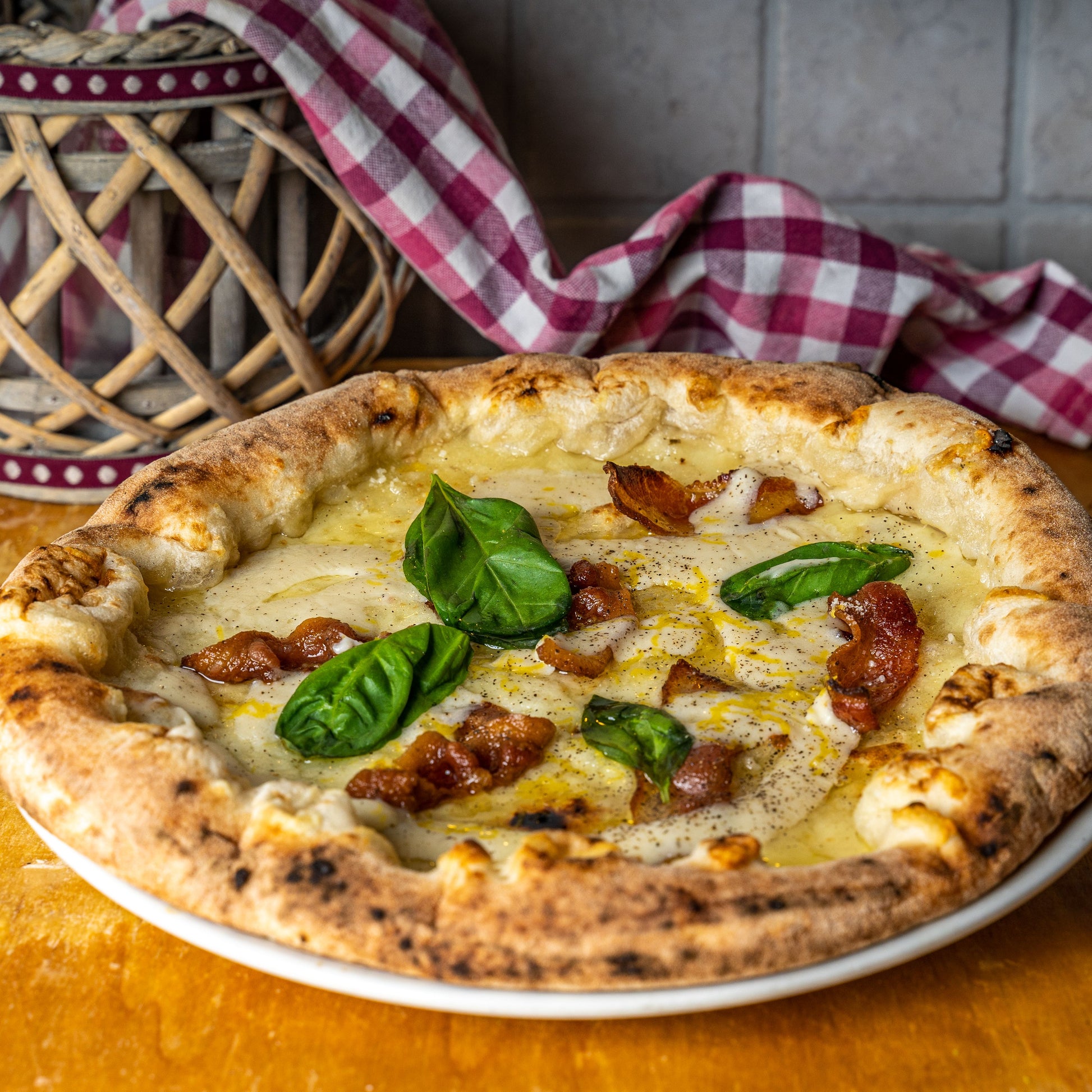 Pizza Gricia in FiammeFiordilatte, Pecorino-Creme, knuspriger Speck und Cuvée-Pfeffer