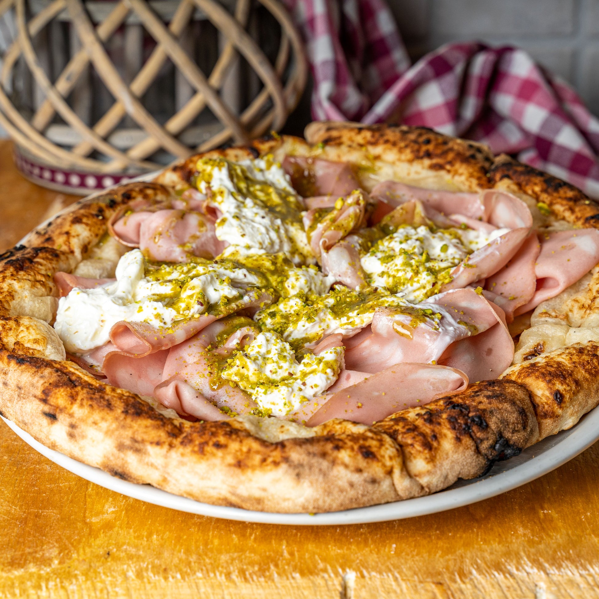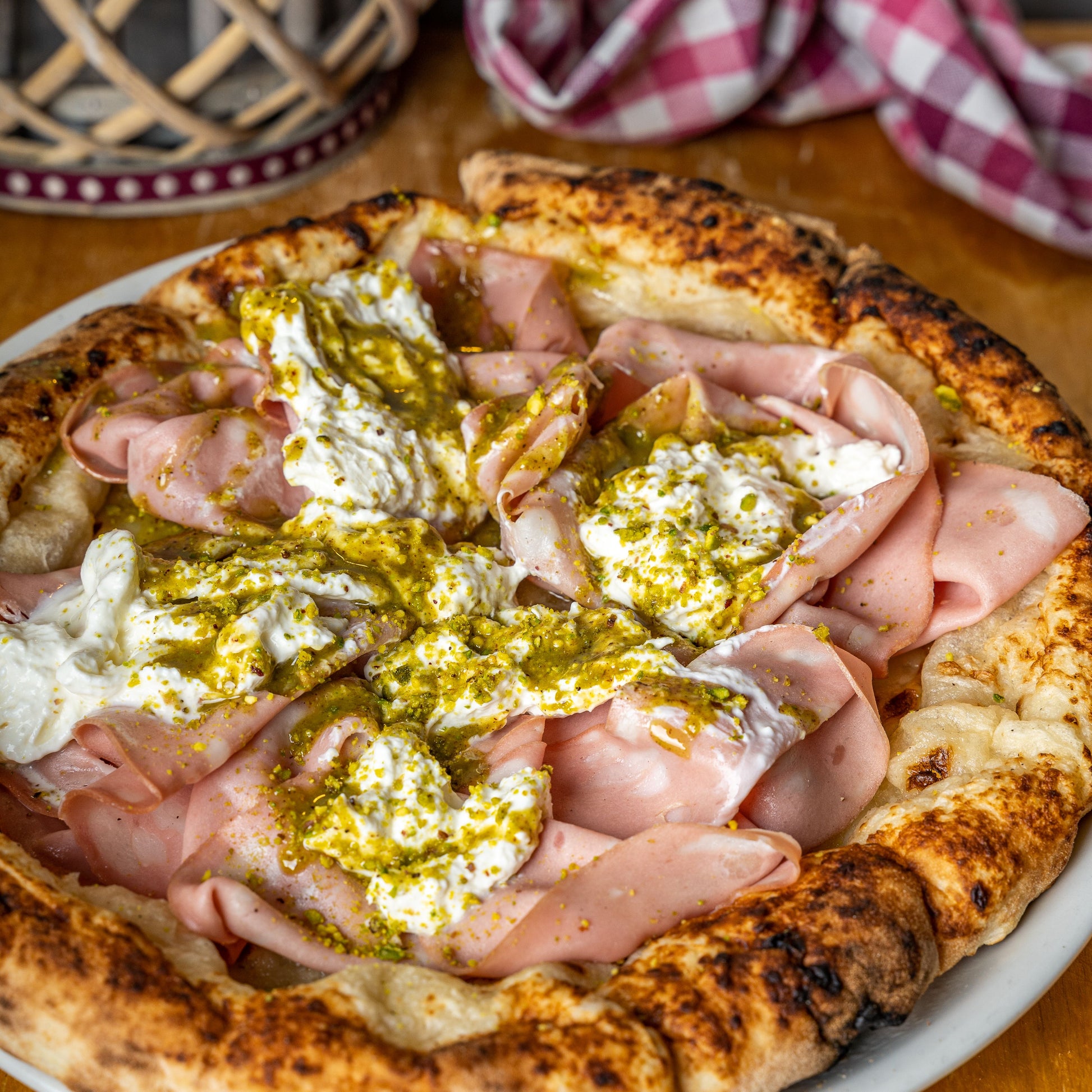 Mortazza PizzaAgerola Provola, Mortadella, Buffalo Stacciatella, Pistazienkörner, Pistazienpesto