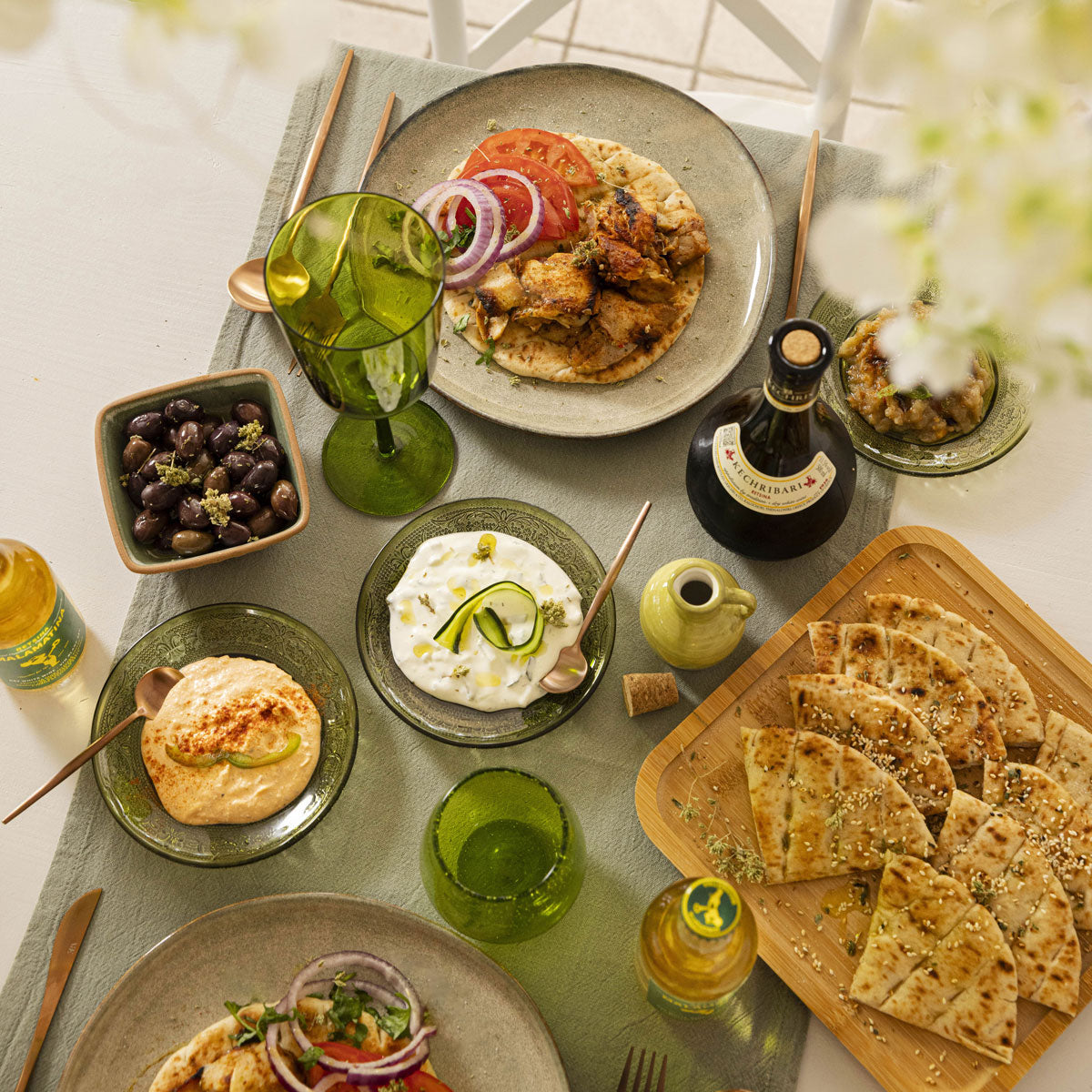 Hier ist eine köstliche Kostprobe typisch griechischer Gerichte für vier Personen ! Dazu gibt es eine Flasche Retzina , einen griechischen Weißwein.