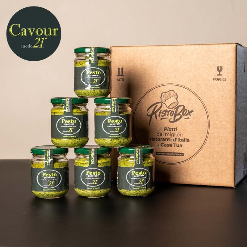 6 Gläser Pesto mit genuesischem DOP-Basilikum , 100 % handwerklich hergestellt von der berühmten ligurischen Trattoria Cavour Modo 21. Verwenden Sie es zum Würzen von Trofie !