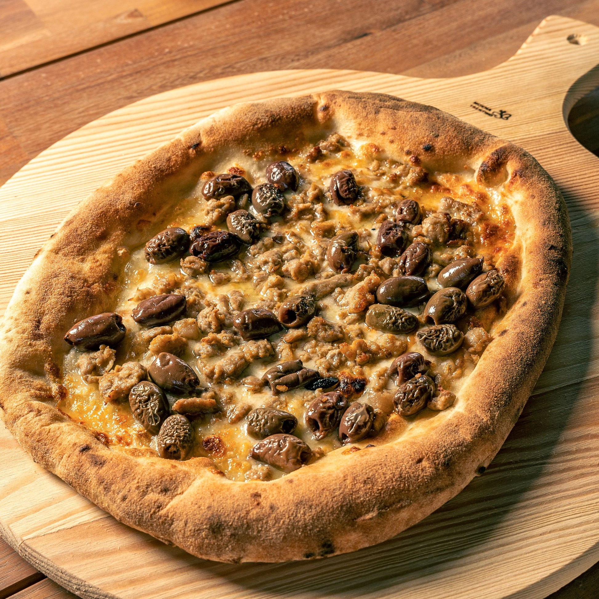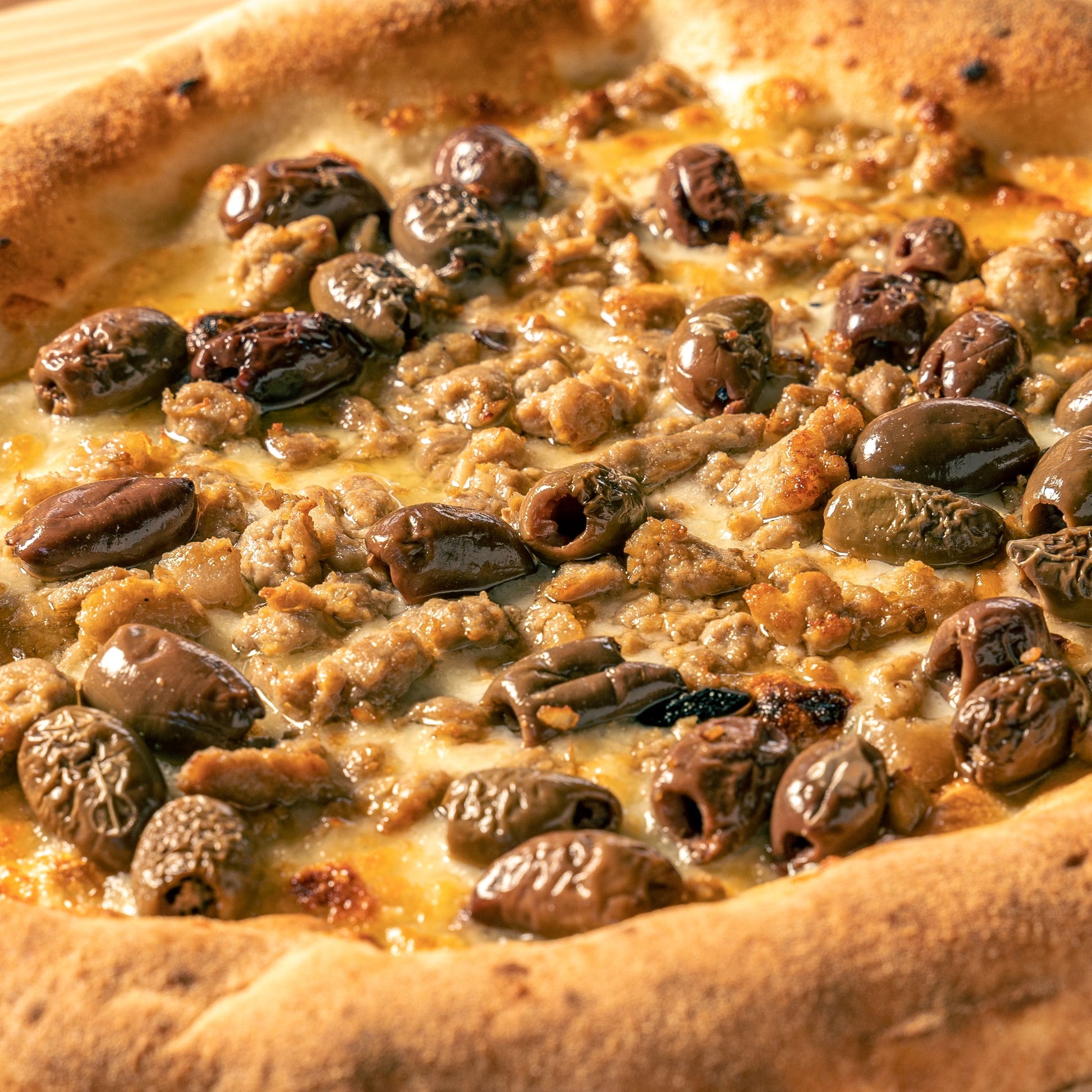 Taggiasca PizzaAgerola-Provola-Käse, schwarze Schweinswurst aus Caserta und Taggiasca-Oliven