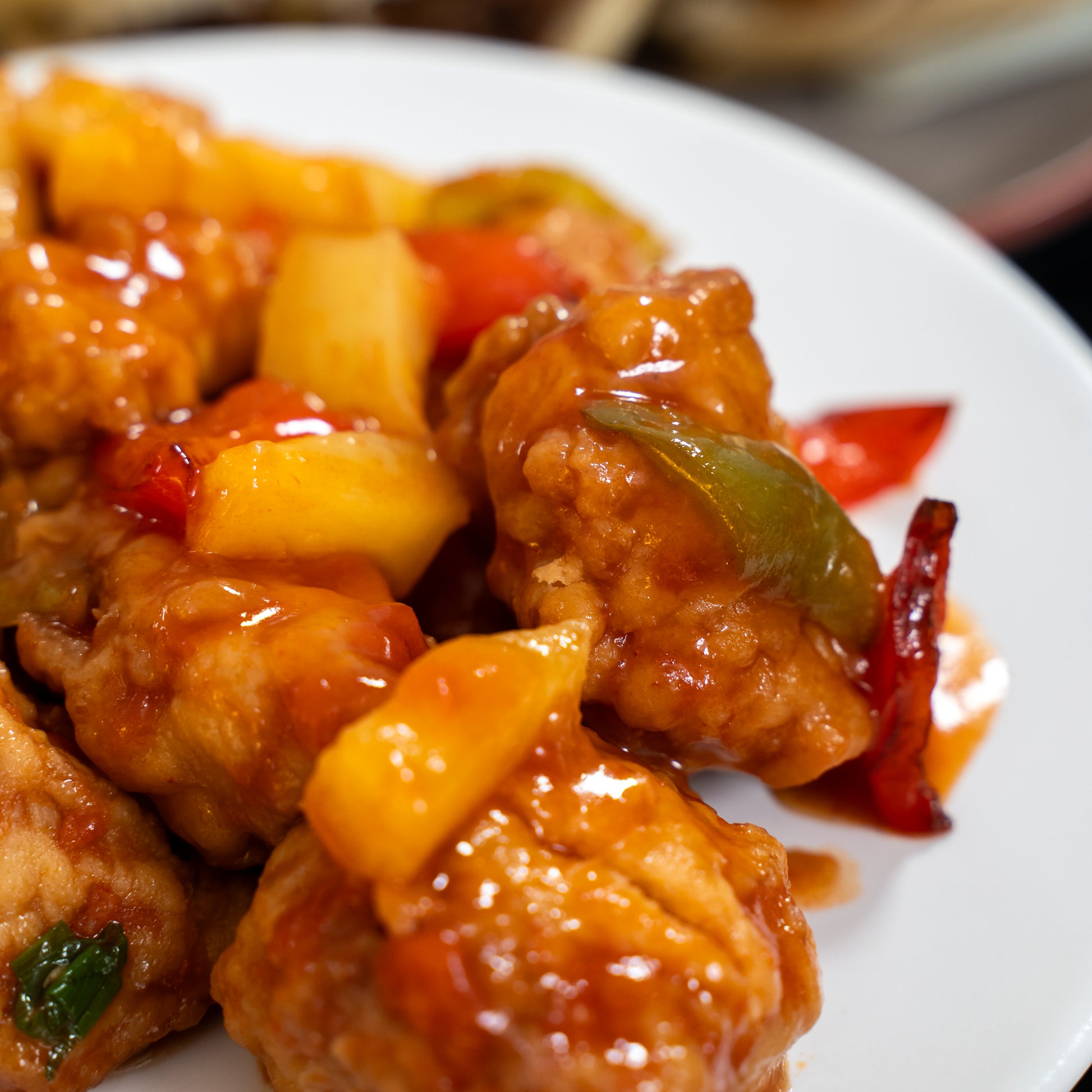 • Hähnchenbissen in süß-saurer Sauce (2 Portionen)Knusprige Hähnchenstücke, übergossen mit einer köstlichen hausgemachten süß-sauren Sauce mit süß-saurem Geschmack. Zutaten: paniertes Brathähnchen, hausgemachte süß-saure Sauce, Ananas.