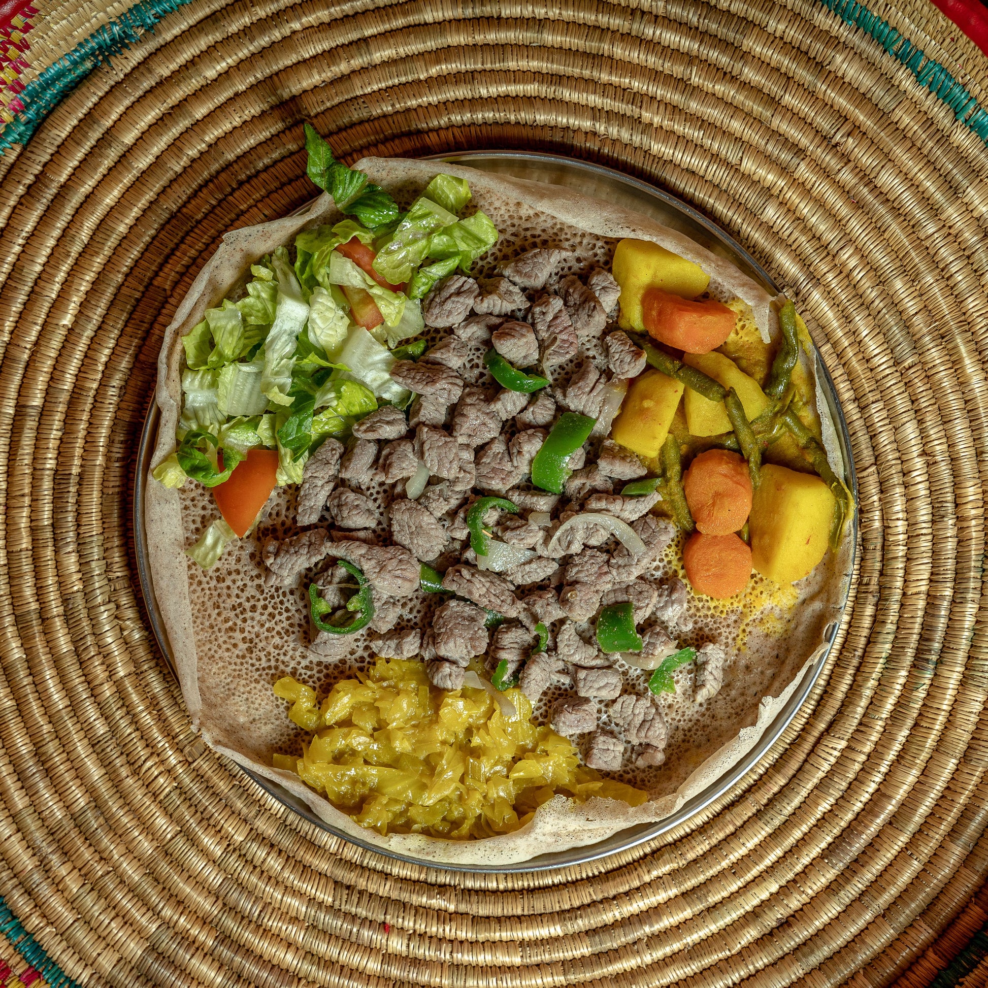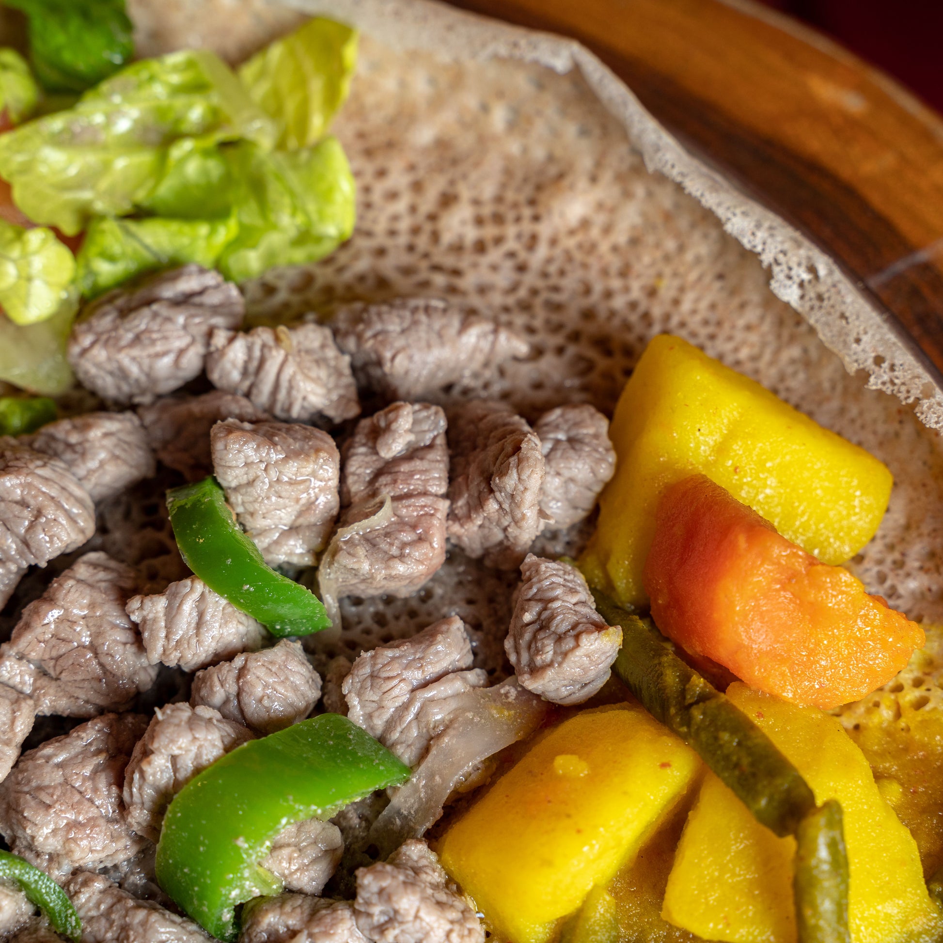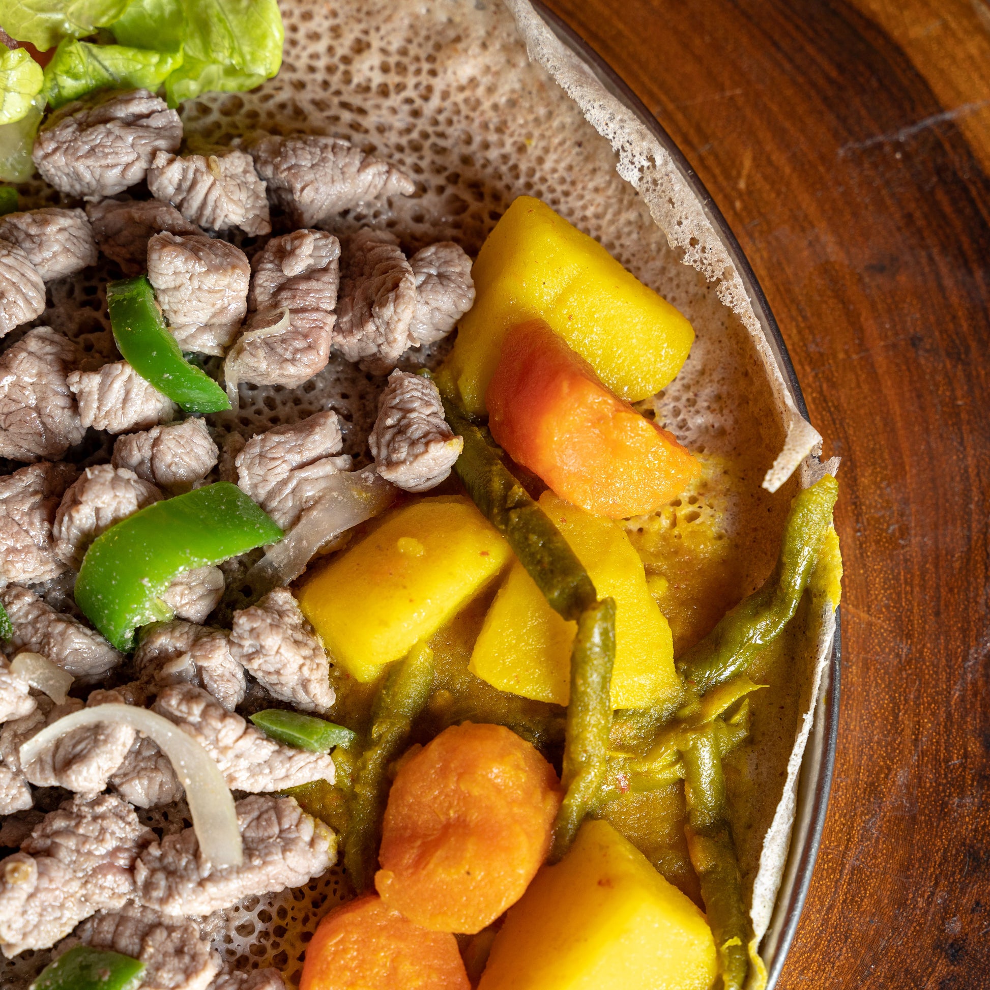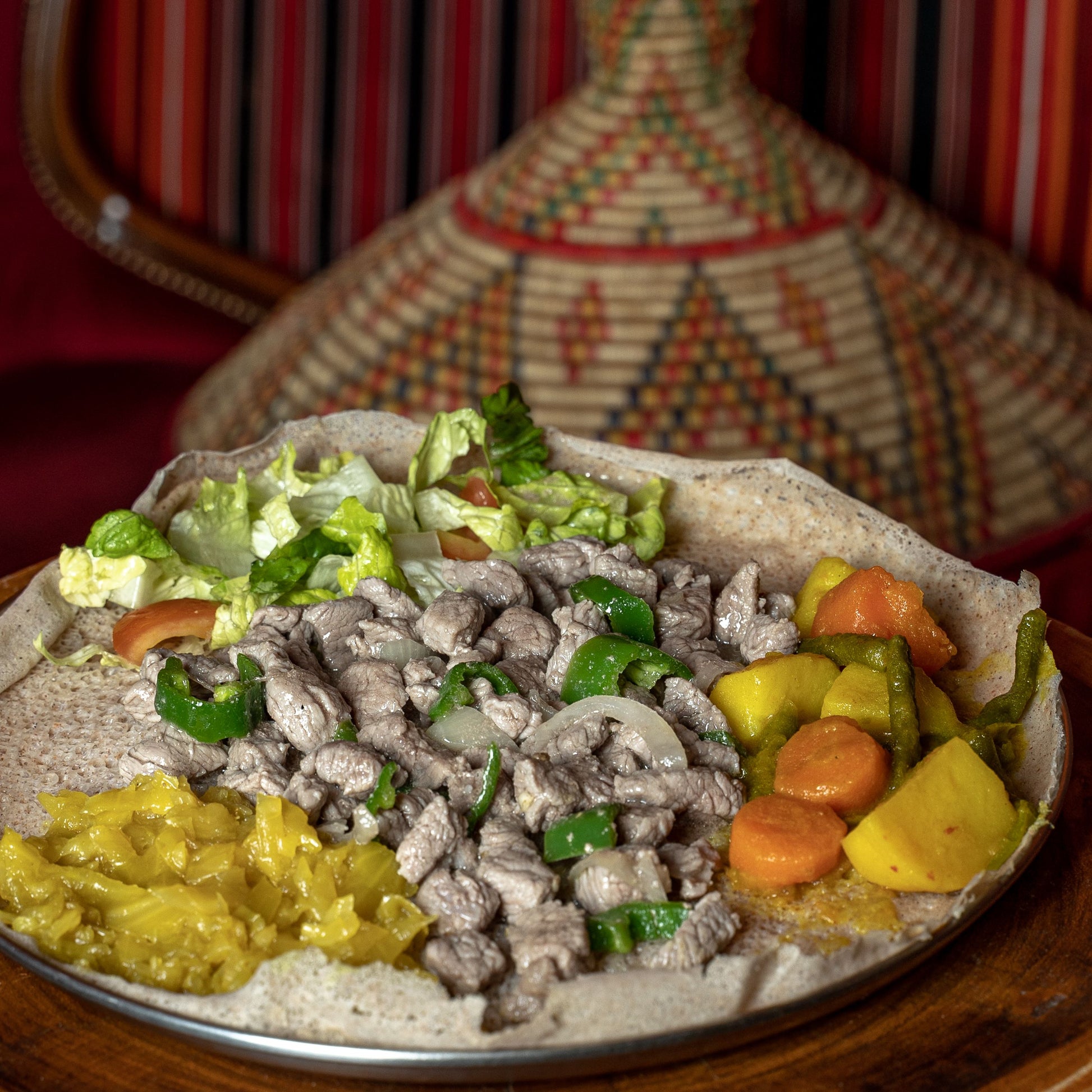 Dies ist ein Eintopfgericht, das aus Rindfleischeintopf mit grünen Chilischoten und Butter besteht und mit eritreischem Brot und einer Mischung aus Gemüsebeilagen serviert wird.