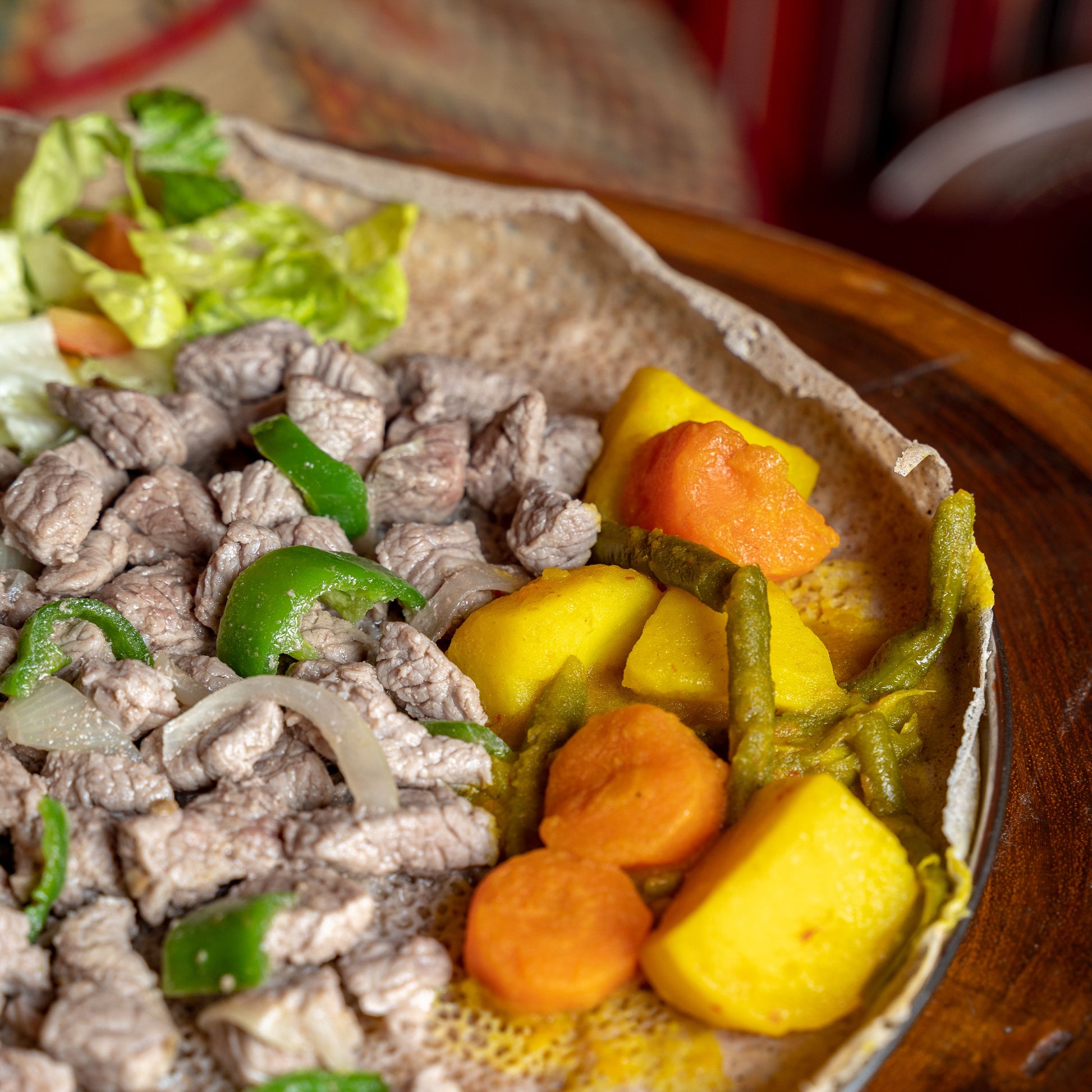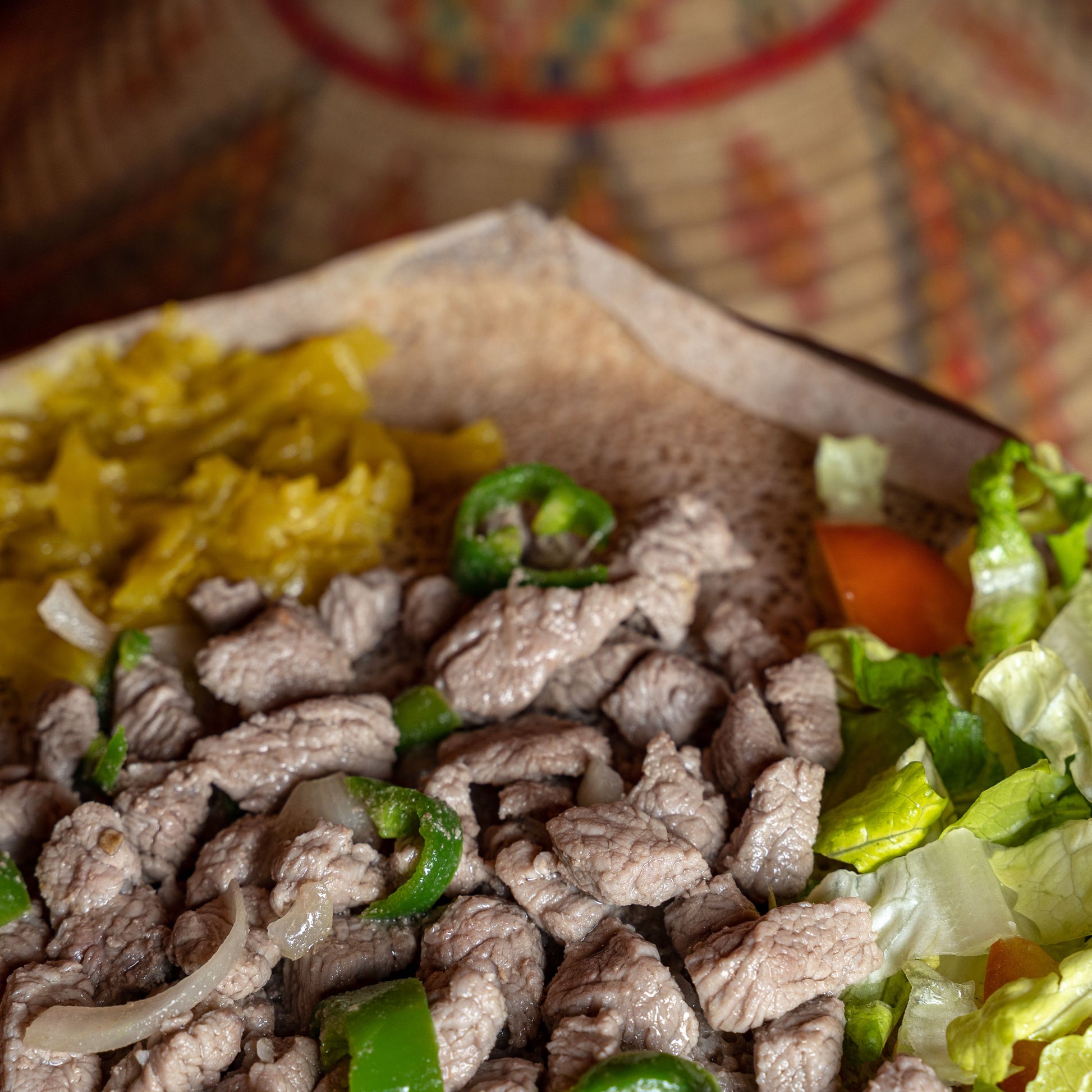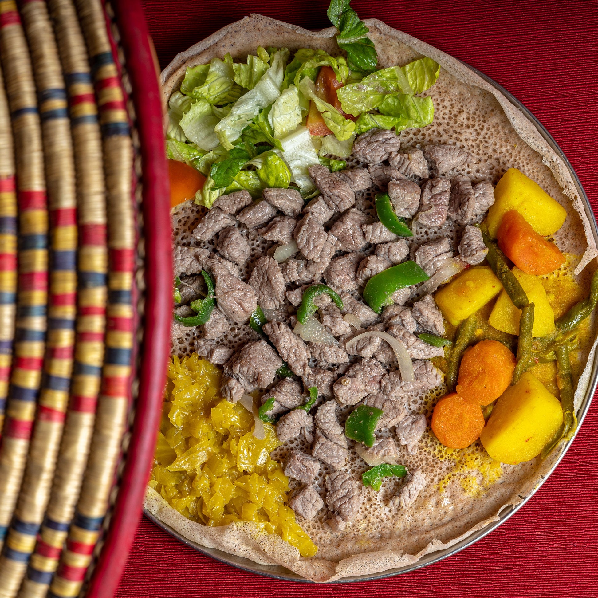 Dies ist ein Eintopfgericht, das aus Rindfleischeintopf mit grünen Chilischoten und Butter besteht und mit eritreischem Brot und einer Mischung aus Gemüsebeilagen serviert wird.