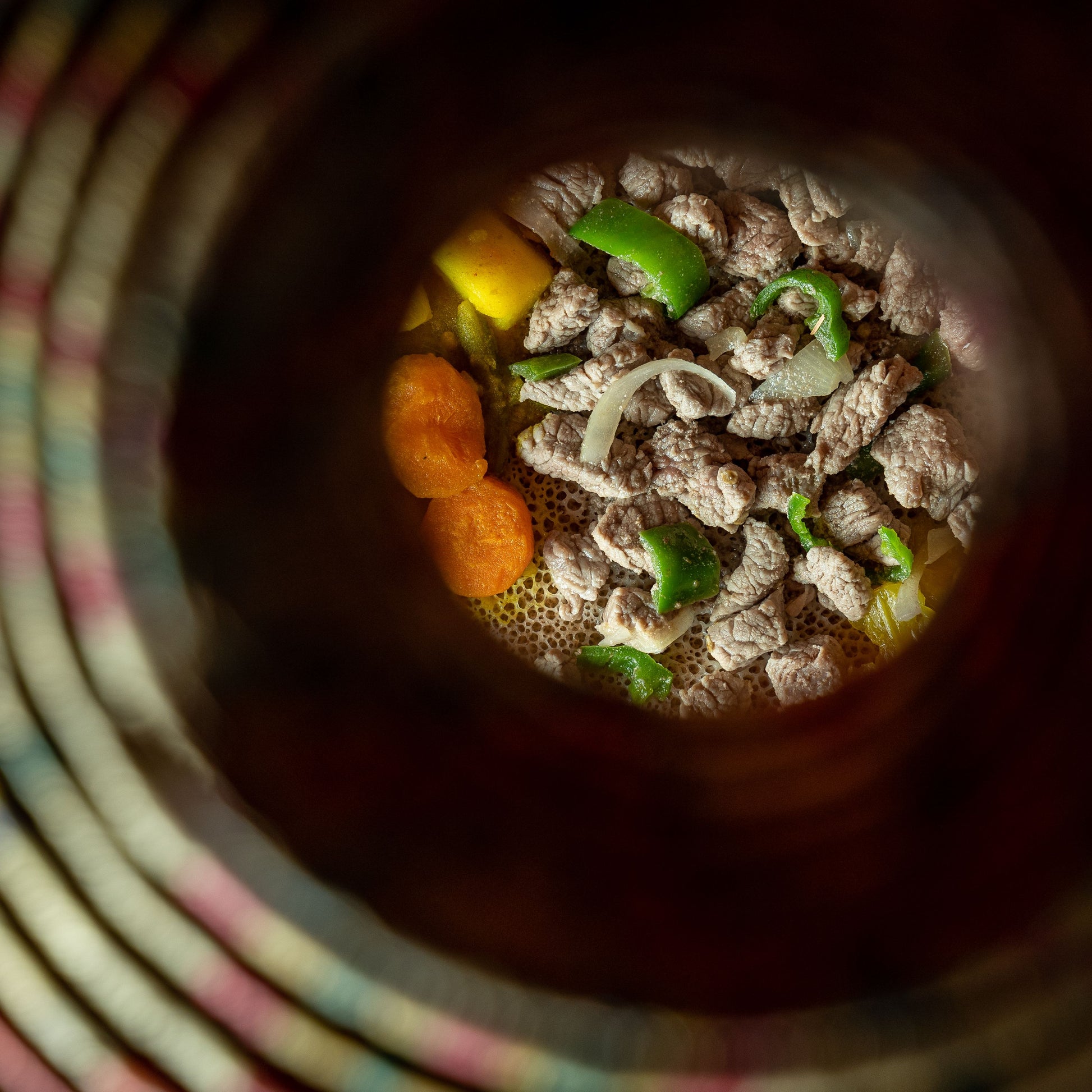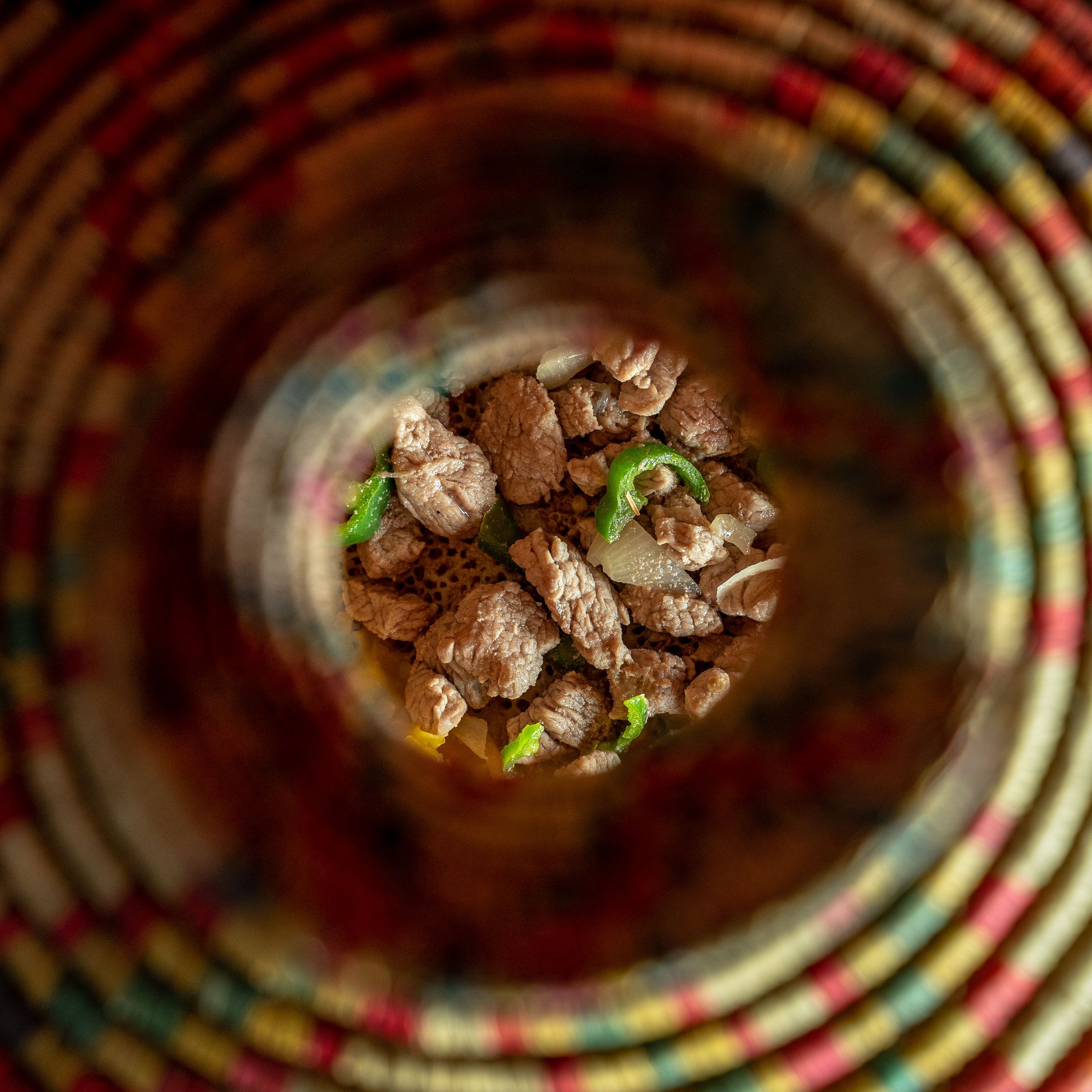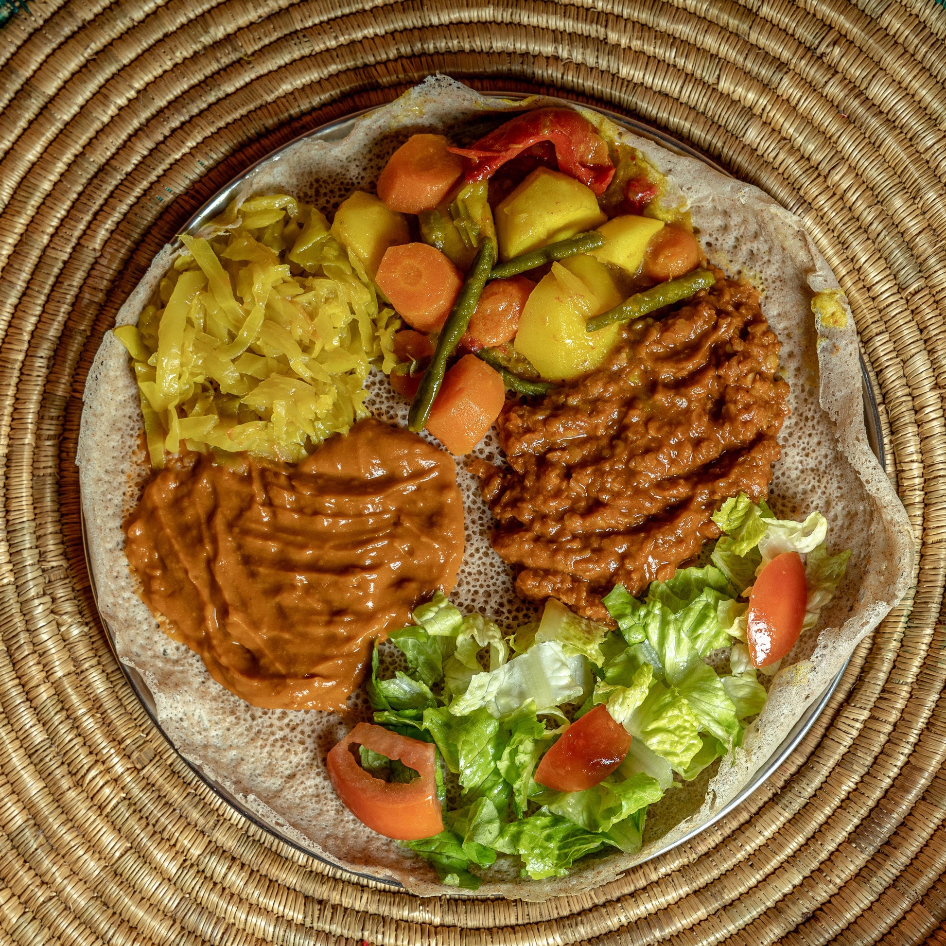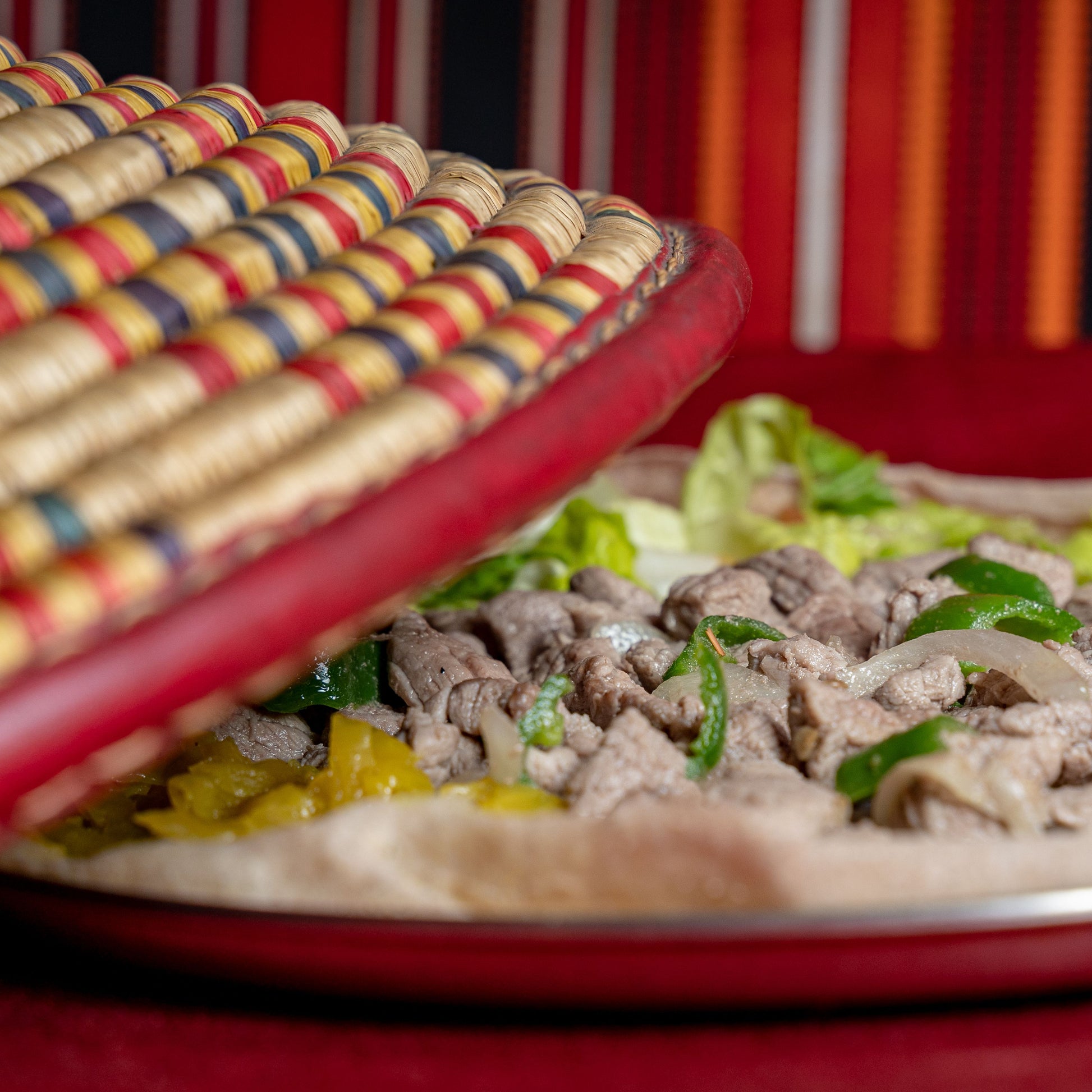 Dies ist ein Eintopfgericht, das aus Rindfleischeintopf mit grünen Chilischoten und Butter besteht und mit eritreischem Brot und einer Mischung aus Gemüsebeilagen serviert wird.