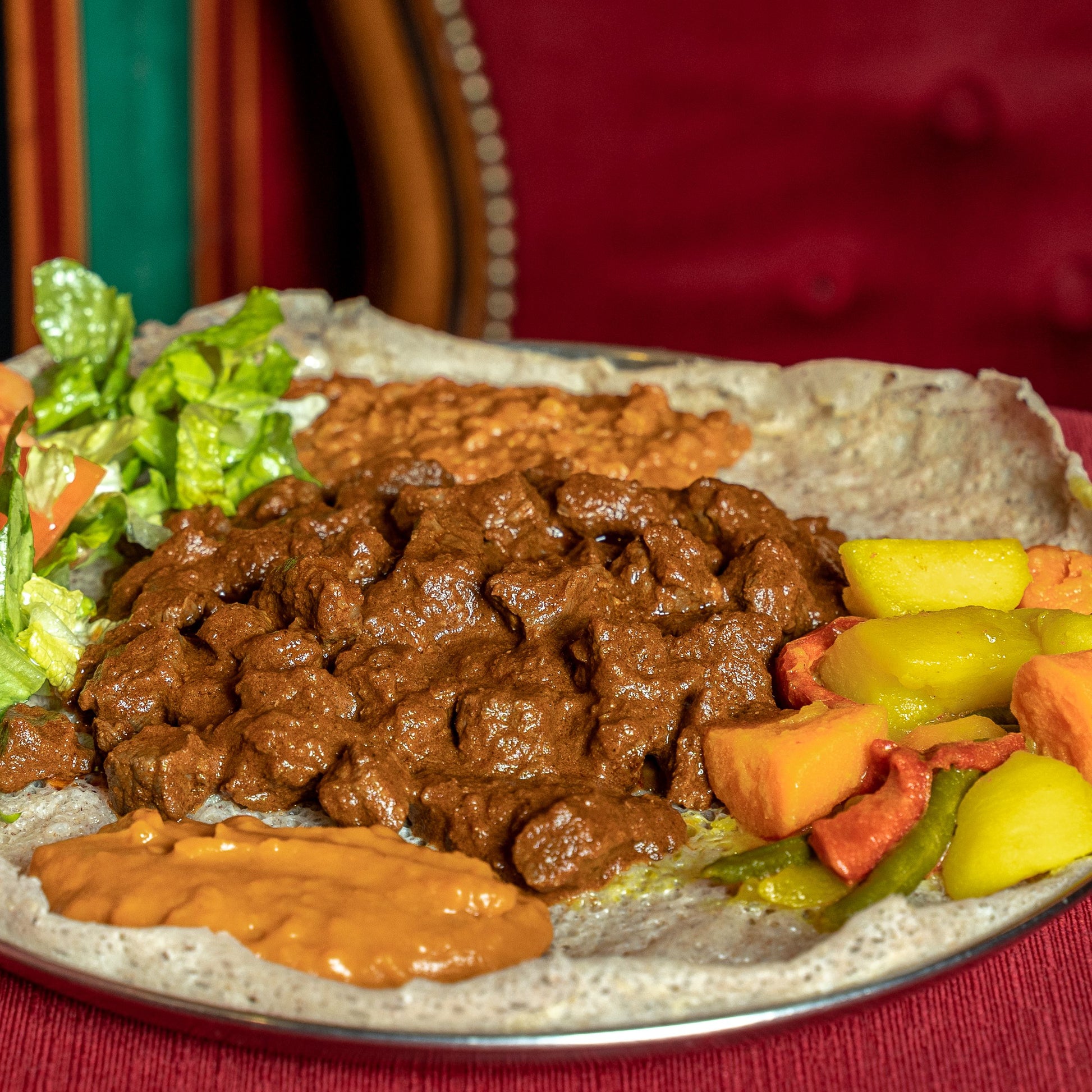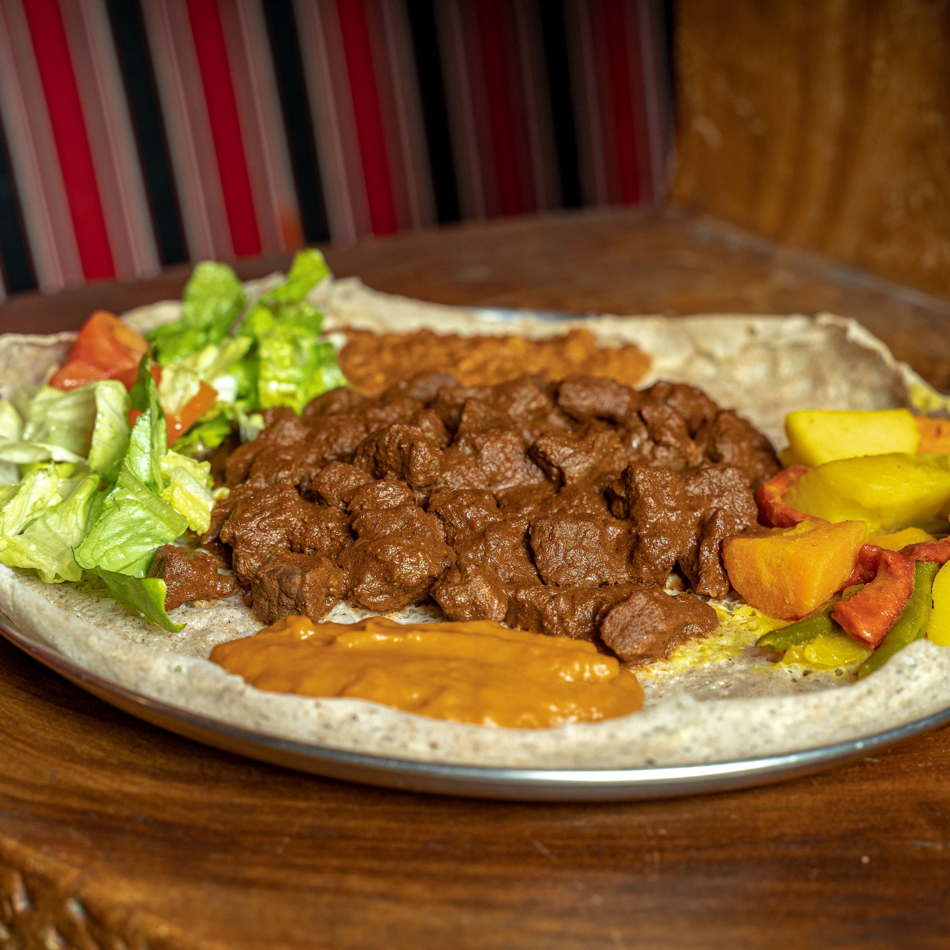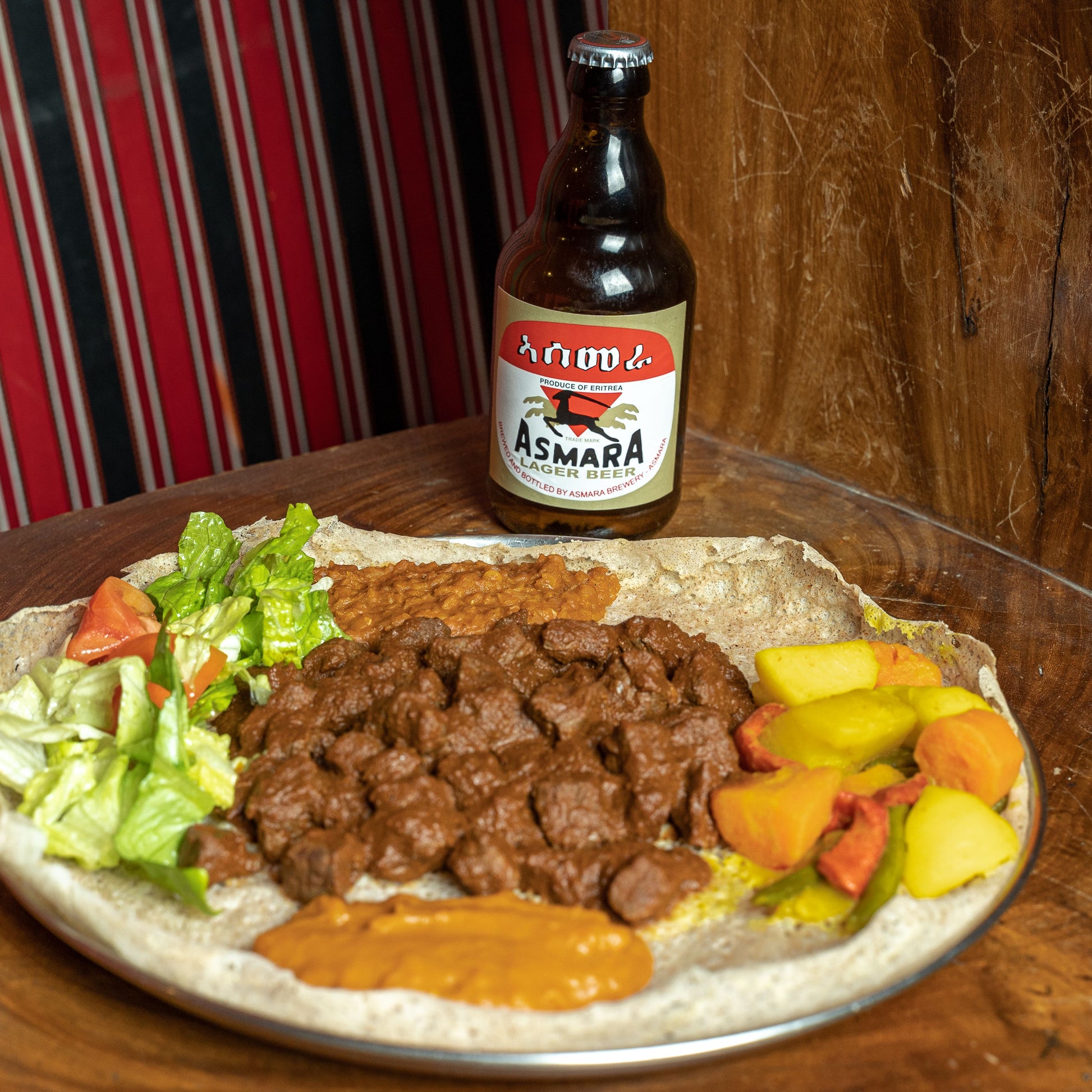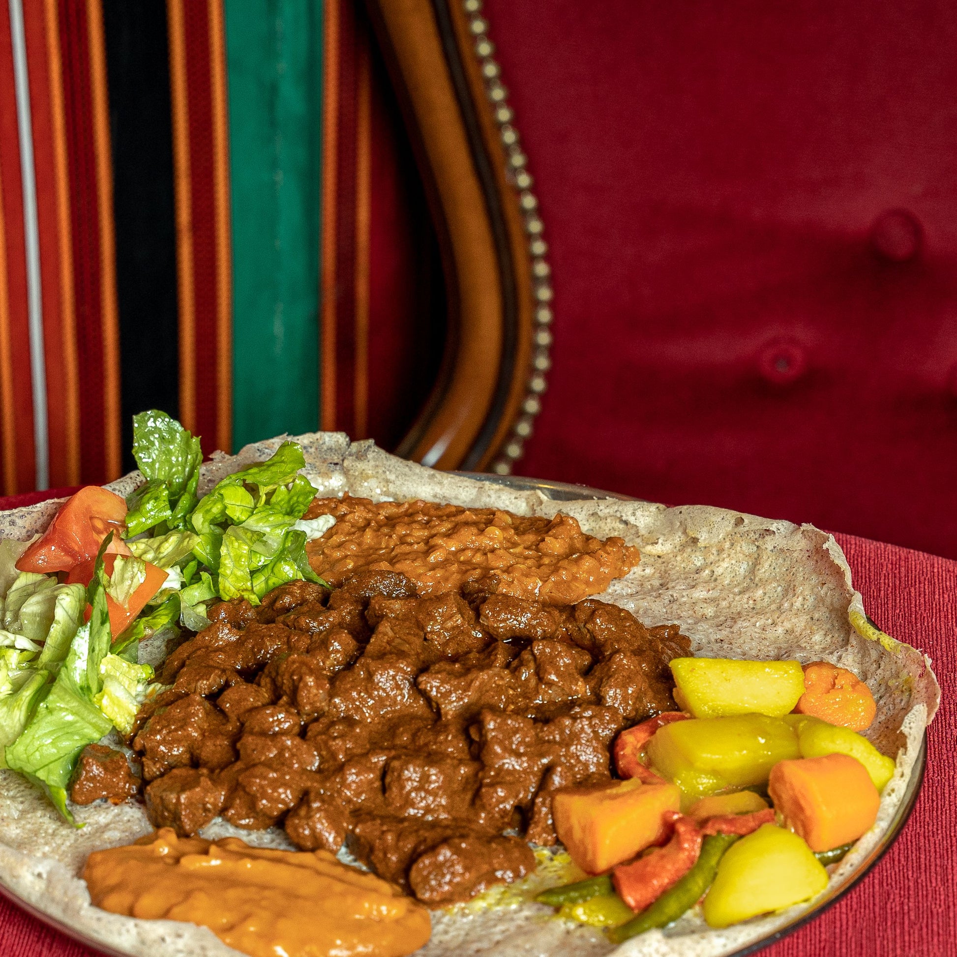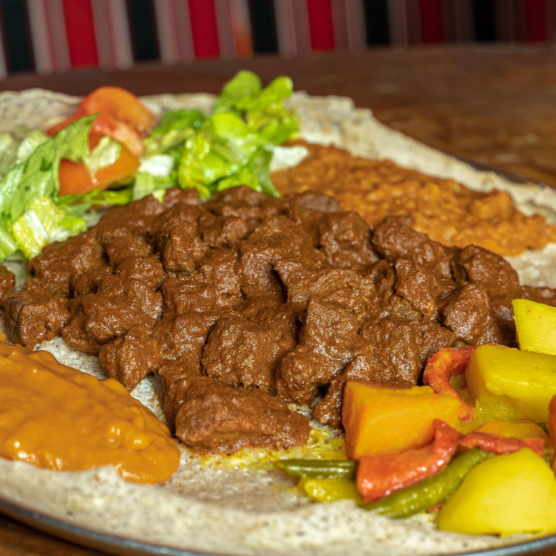 DerRoter SprißEs handelt sich um ein Eintopfgericht, das aus Rindfleischeintopf mit grünen Chilischoten und Berbere besteht und mit eritreischem Brot und verschiedenen Gemüsebeilagen serviert wird.