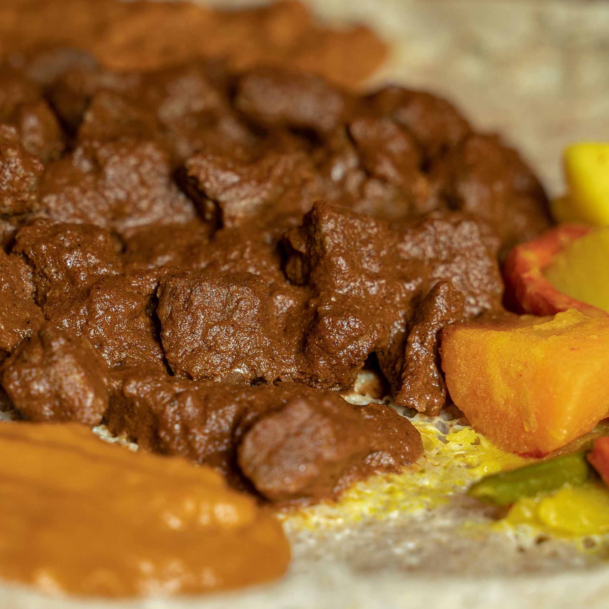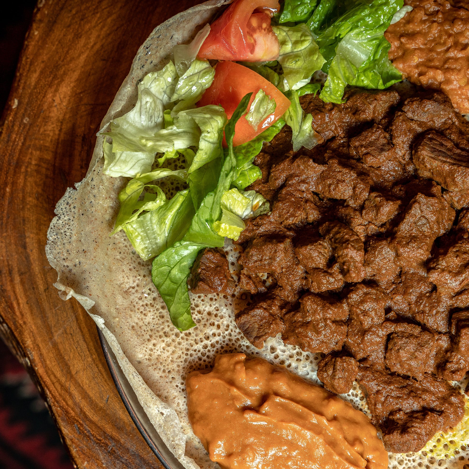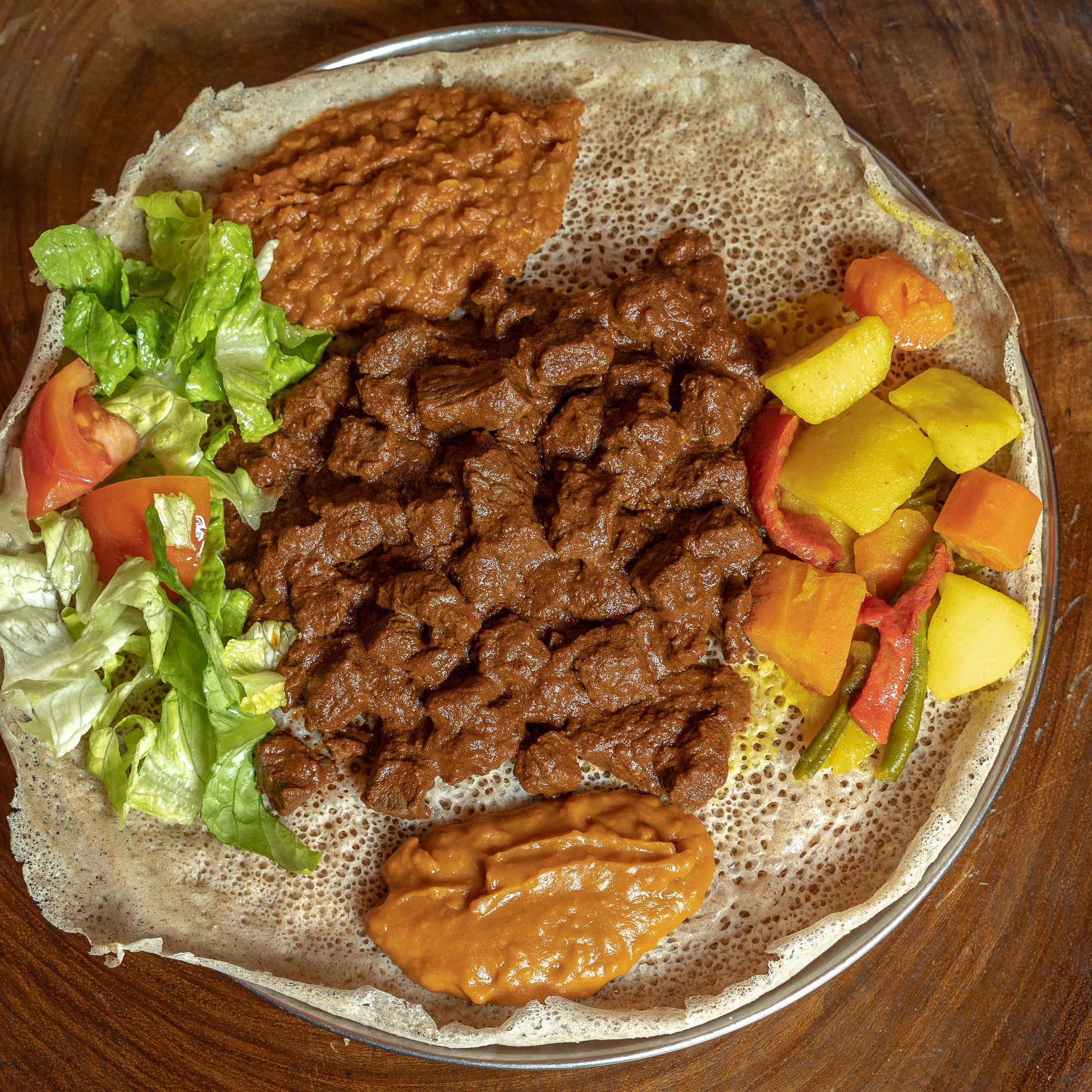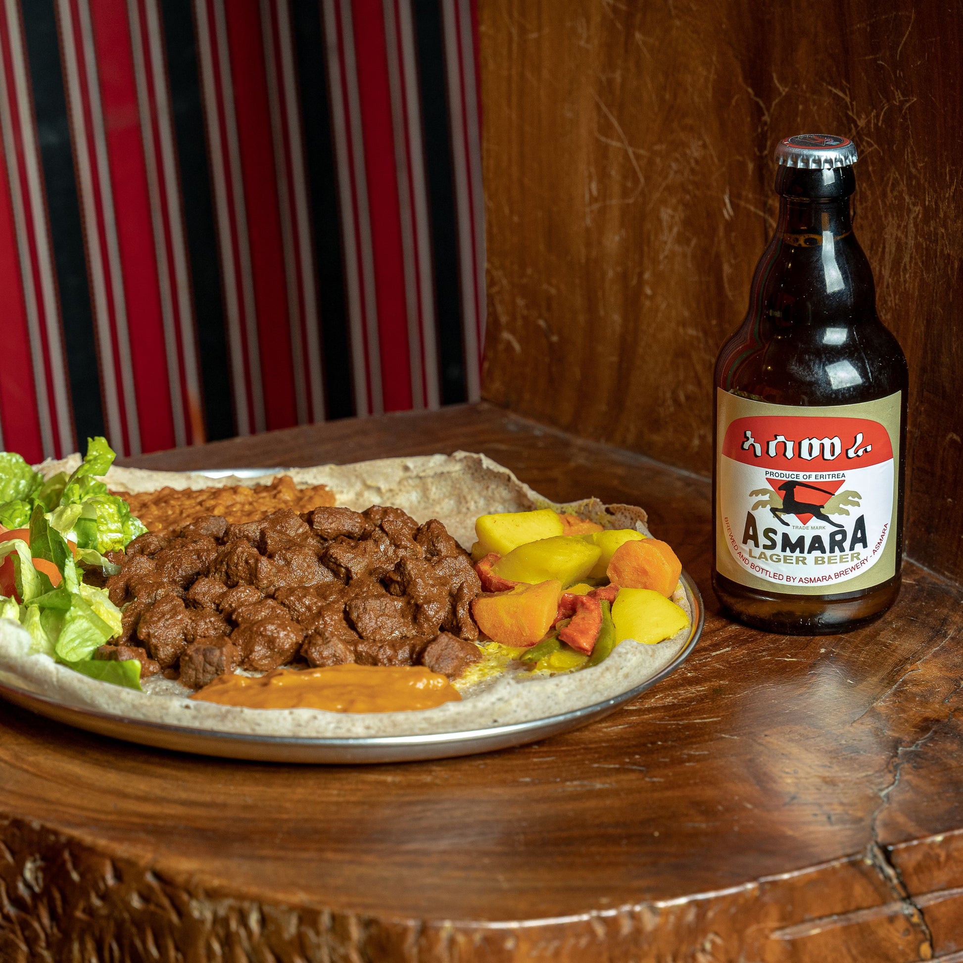 DerRoter SprißEs handelt sich um ein Eintopfgericht, das aus Rindfleischeintopf mit grünen Chilischoten und Berbere besteht und mit eritreischem Brot und verschiedenen Gemüsebeilagen serviert wird.