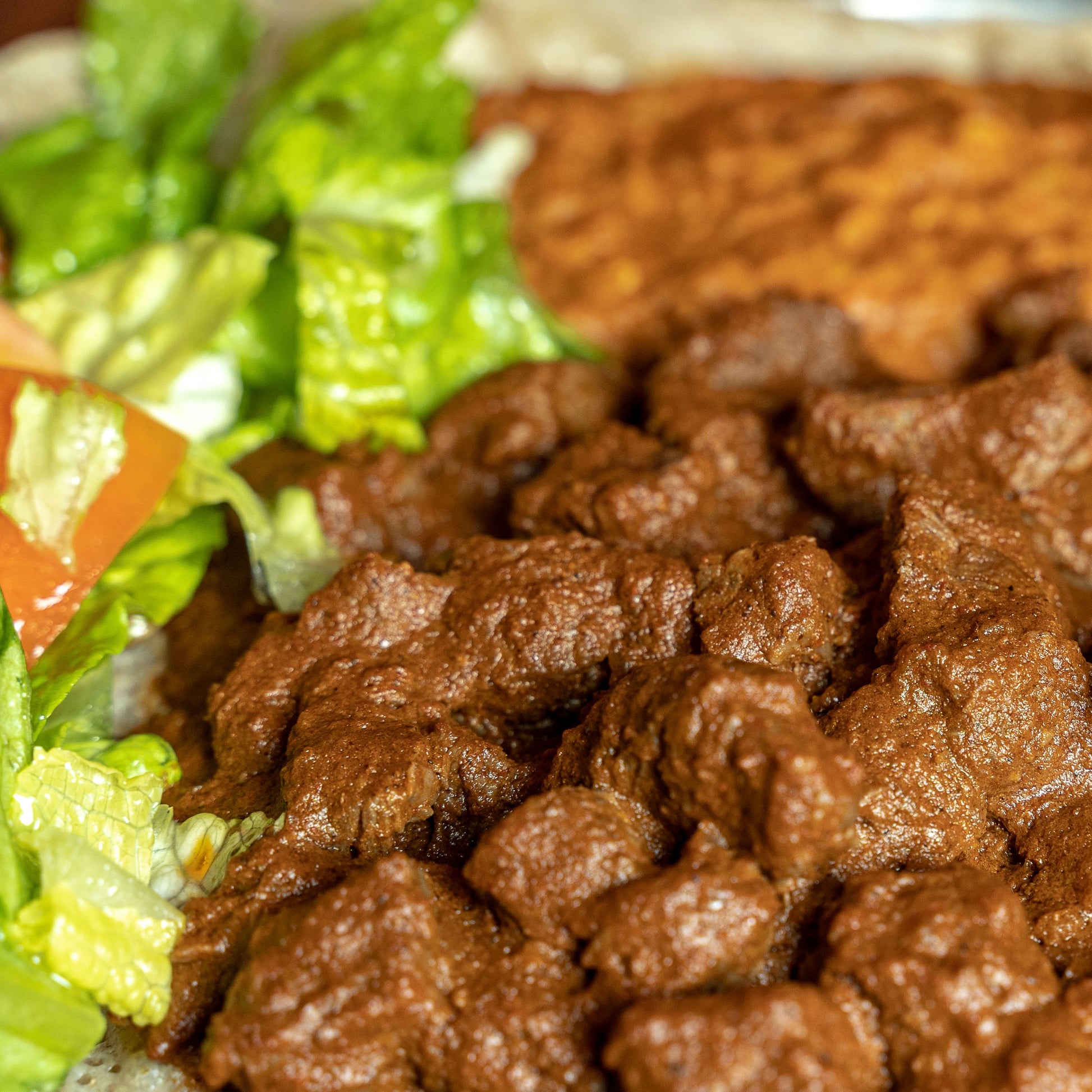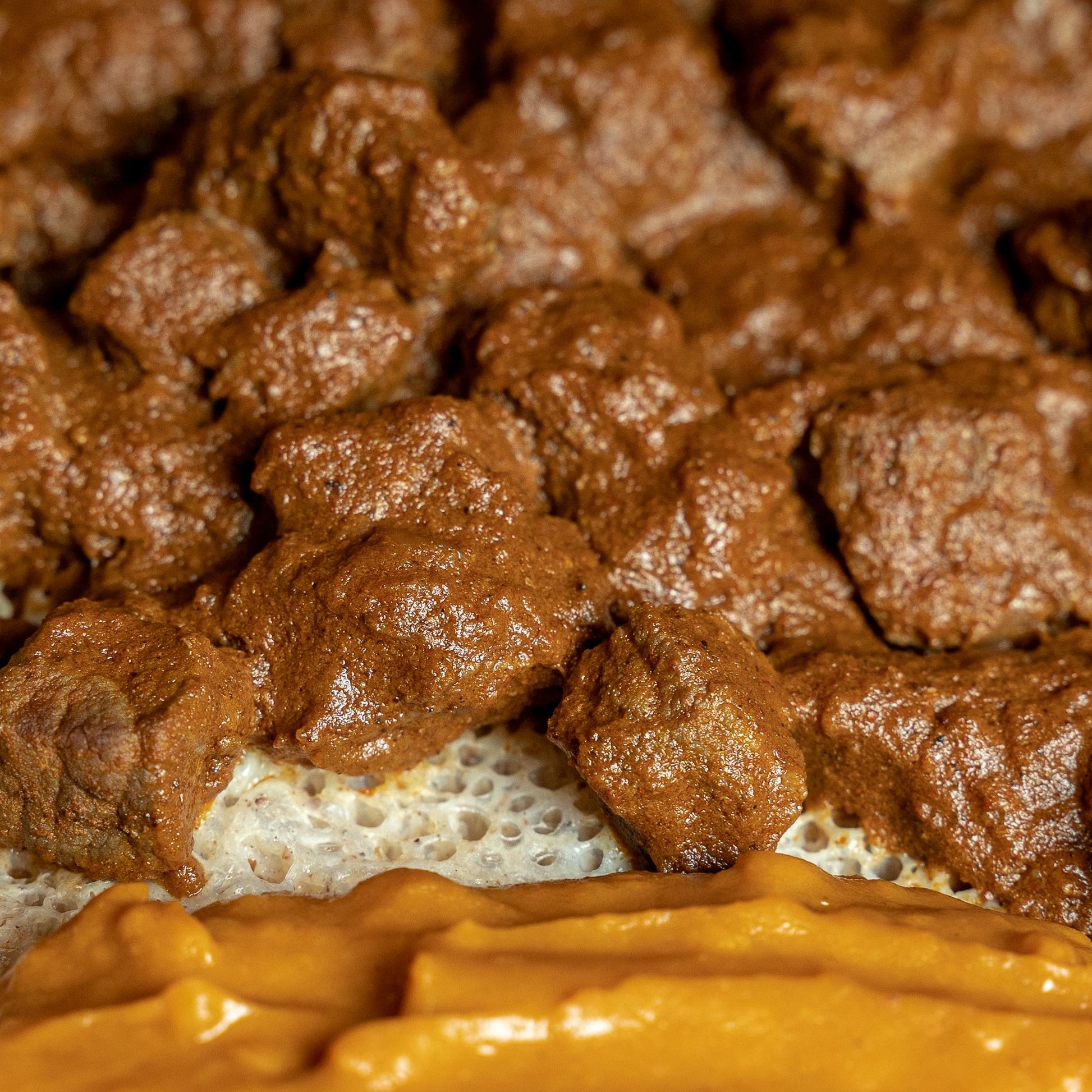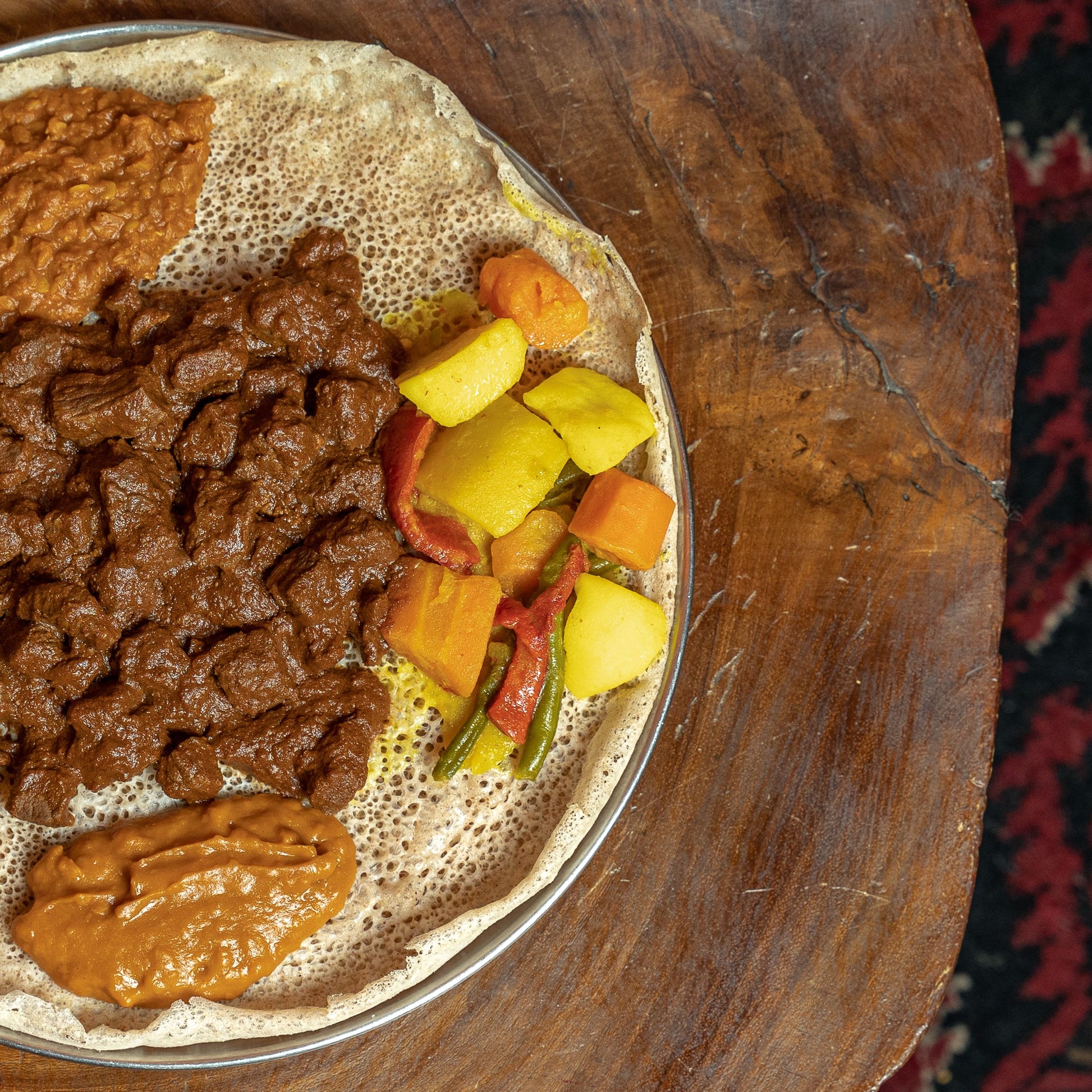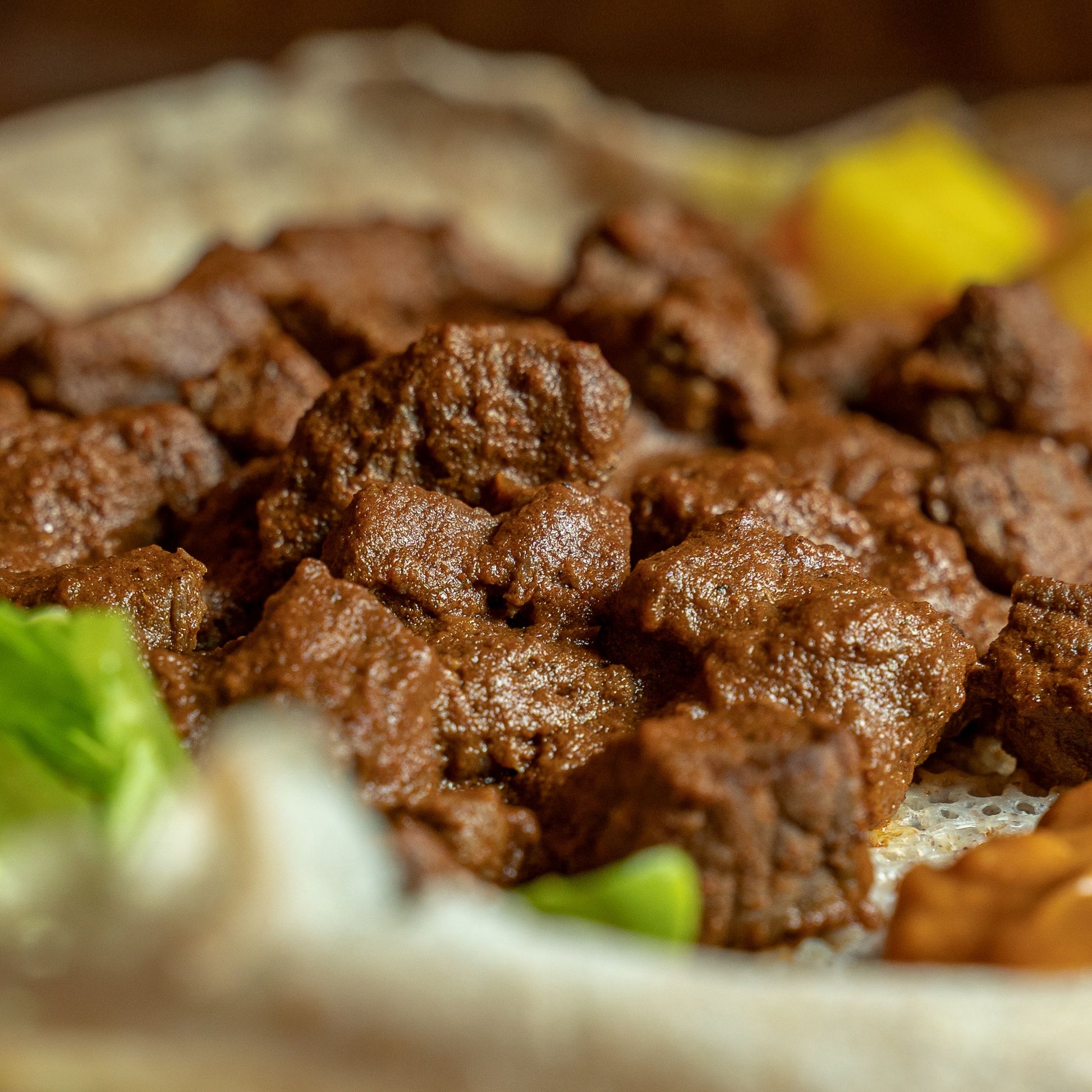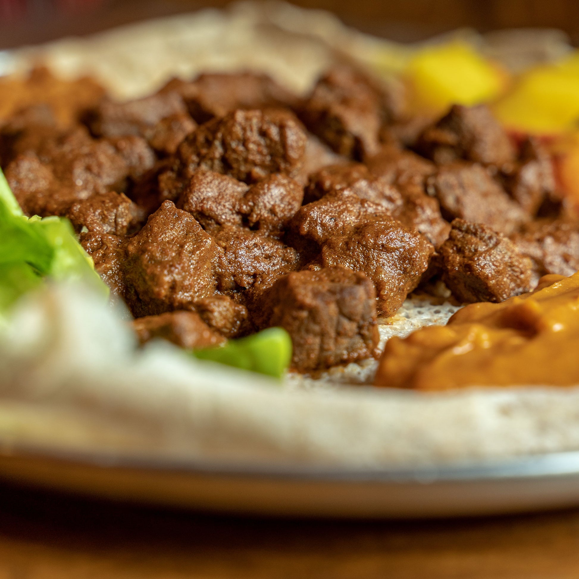 DerRoter SprißEs handelt sich um ein Eintopfgericht, das aus Rindfleischeintopf mit grünen Chilischoten und Berbere besteht und mit eritreischem Brot und verschiedenen Gemüsebeilagen serviert wird.
