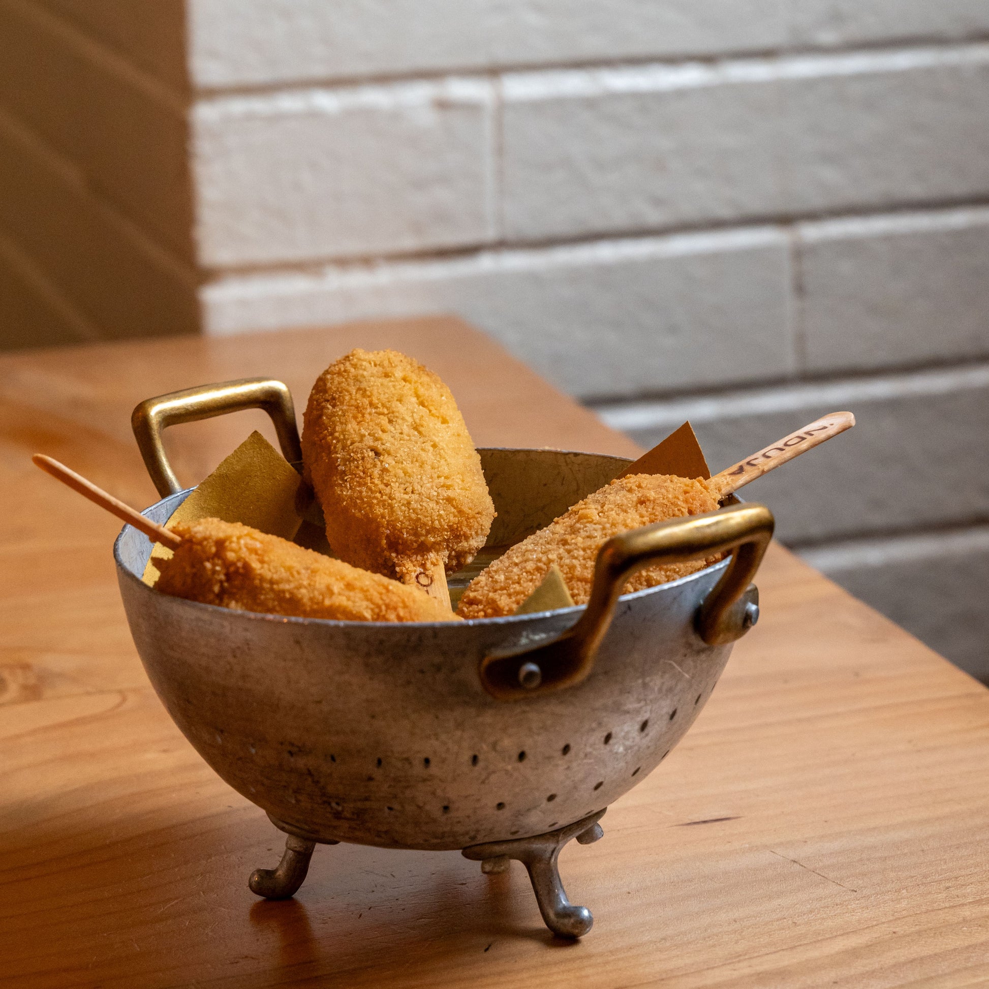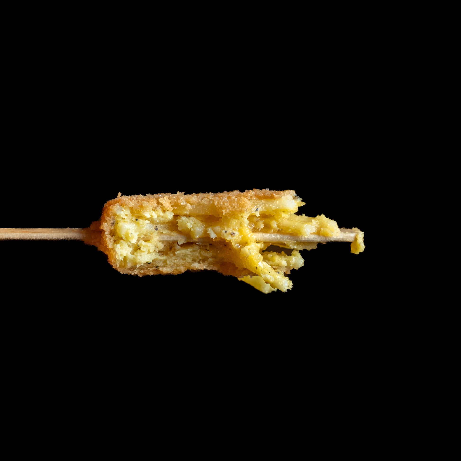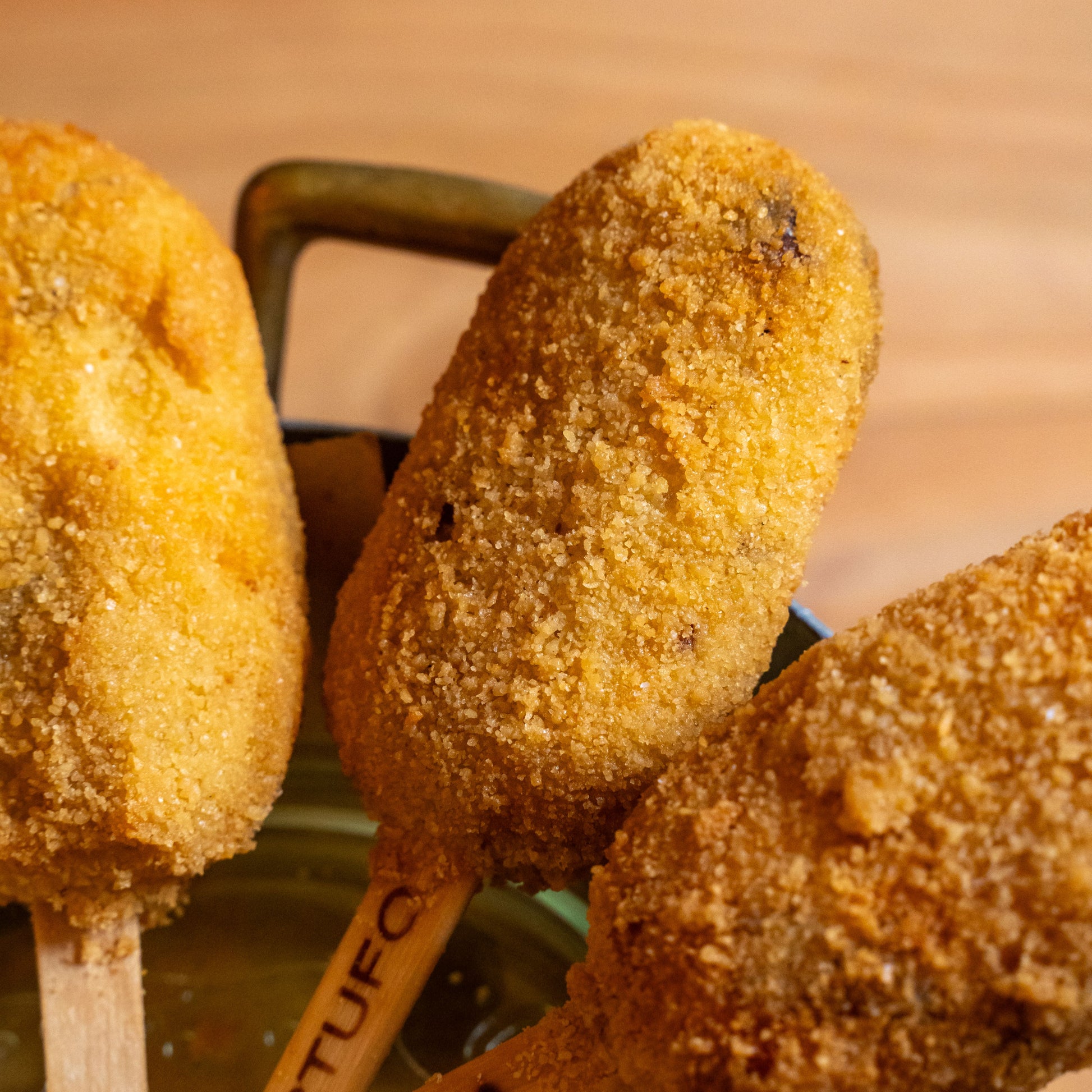 Dies ist einCarbonara auf einem Spieß aufgespießt und frittiertDie Form ist auffällig, da sie an die eines Eises erinnert, aber im Inneren verbirgt sich die Überraschung: eine cremige Füllung mit einem umhüllenden Geschmack, der Sie vom ersten Bissen an überzeugen wird!