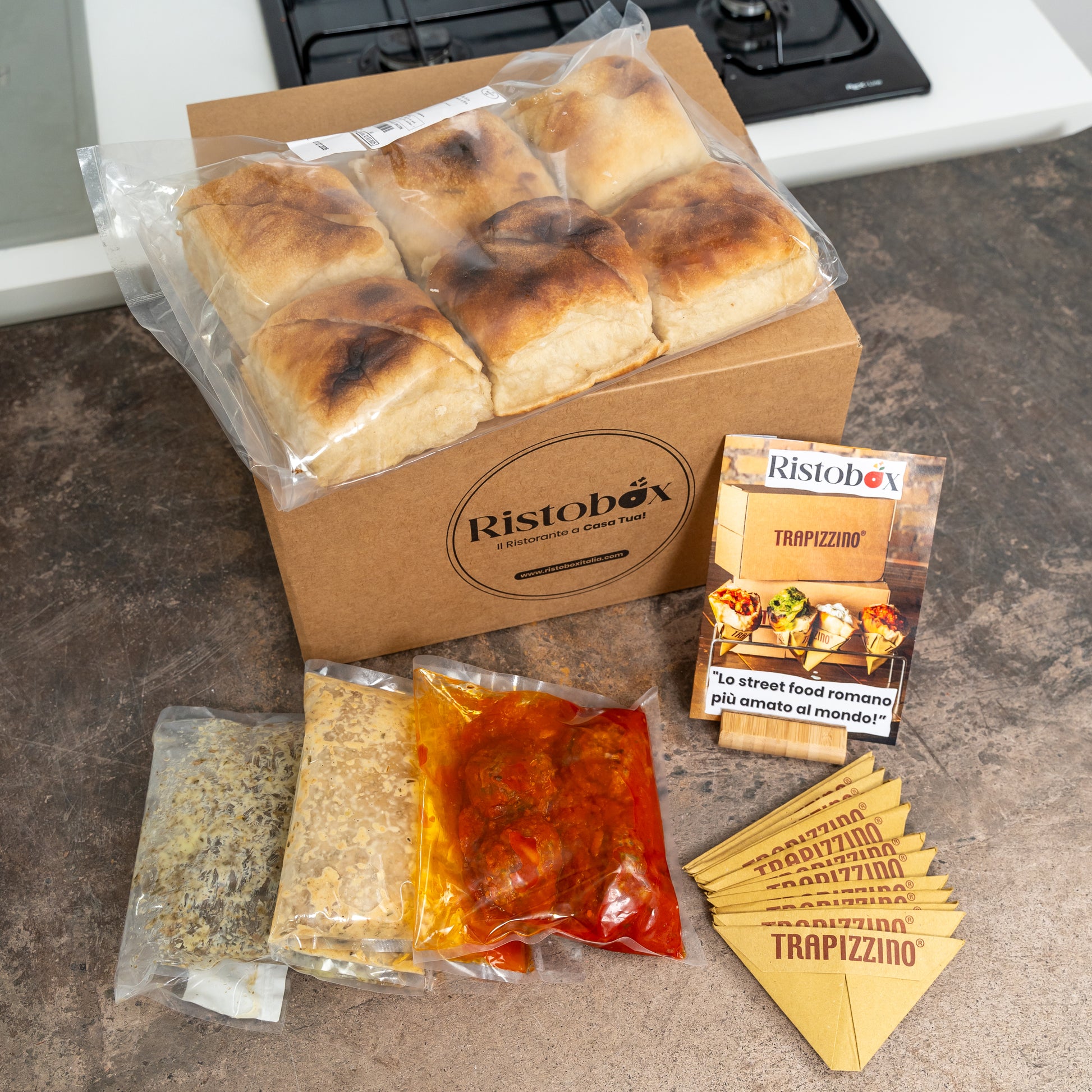 Eine Schachtel mit 12 Trapizzini , 4 für jede Geschmacksrichtung Ihrer Wahl: Stellen Sie Ihre eigene zusammen und wählen Sie zwischen Hühnchen Cacciatore , Ochsenschwanzeintopf , Fleischbällchen mit Omas Sauce und Brötchen nach römischer Art . Sie lieben die vegetarische Küche ? Dann verpassen Sie nicht den mit Auberginen-Parmigiana gefüllten Trapizzino ! Sie brauchen nur 5 Minuten , einen Topf und den Ofen, um weiche, warme und köstlich gefüllte Trapizzini für ein Abendessen mit Freunden oder einen reichhaltigen Aperitif zu genießen!