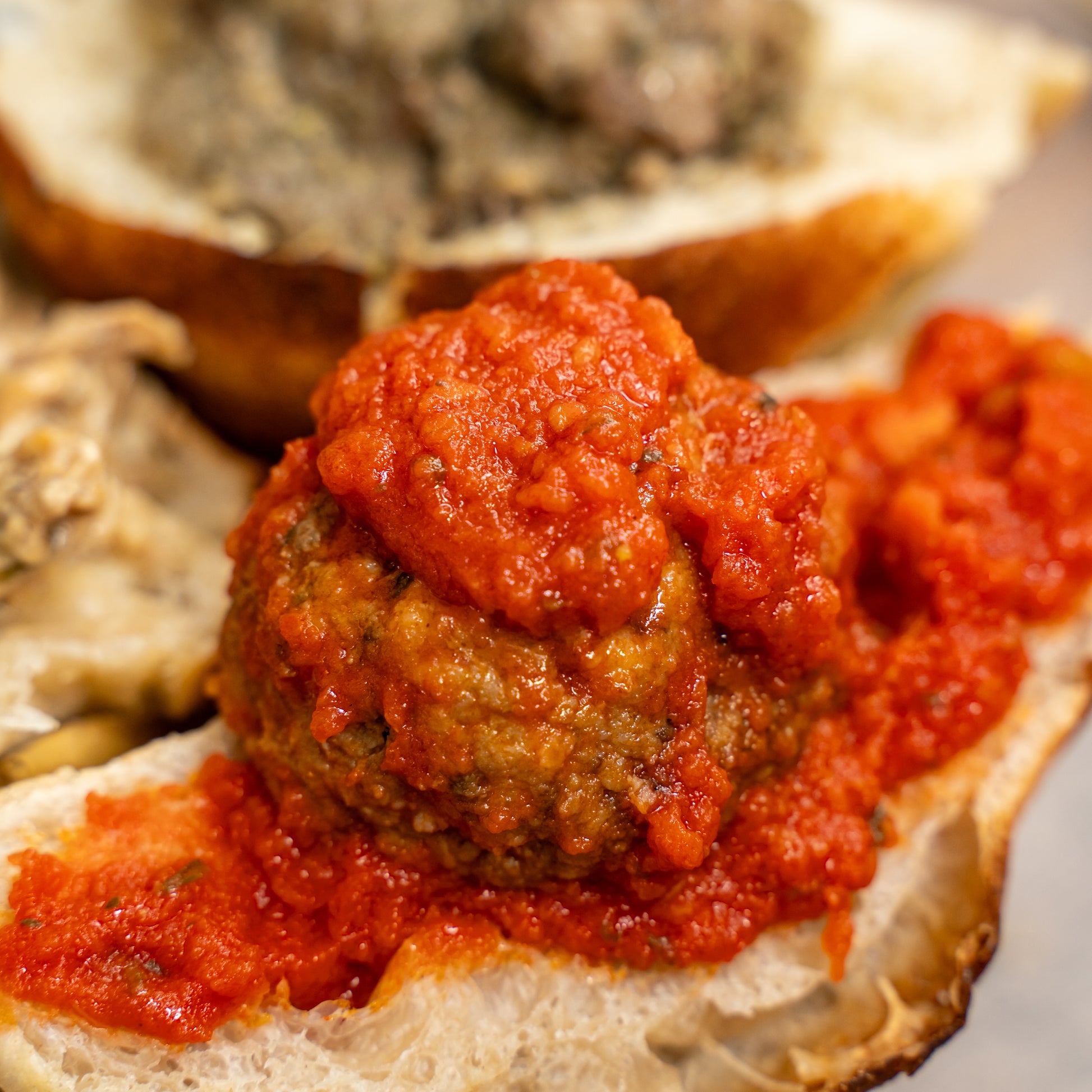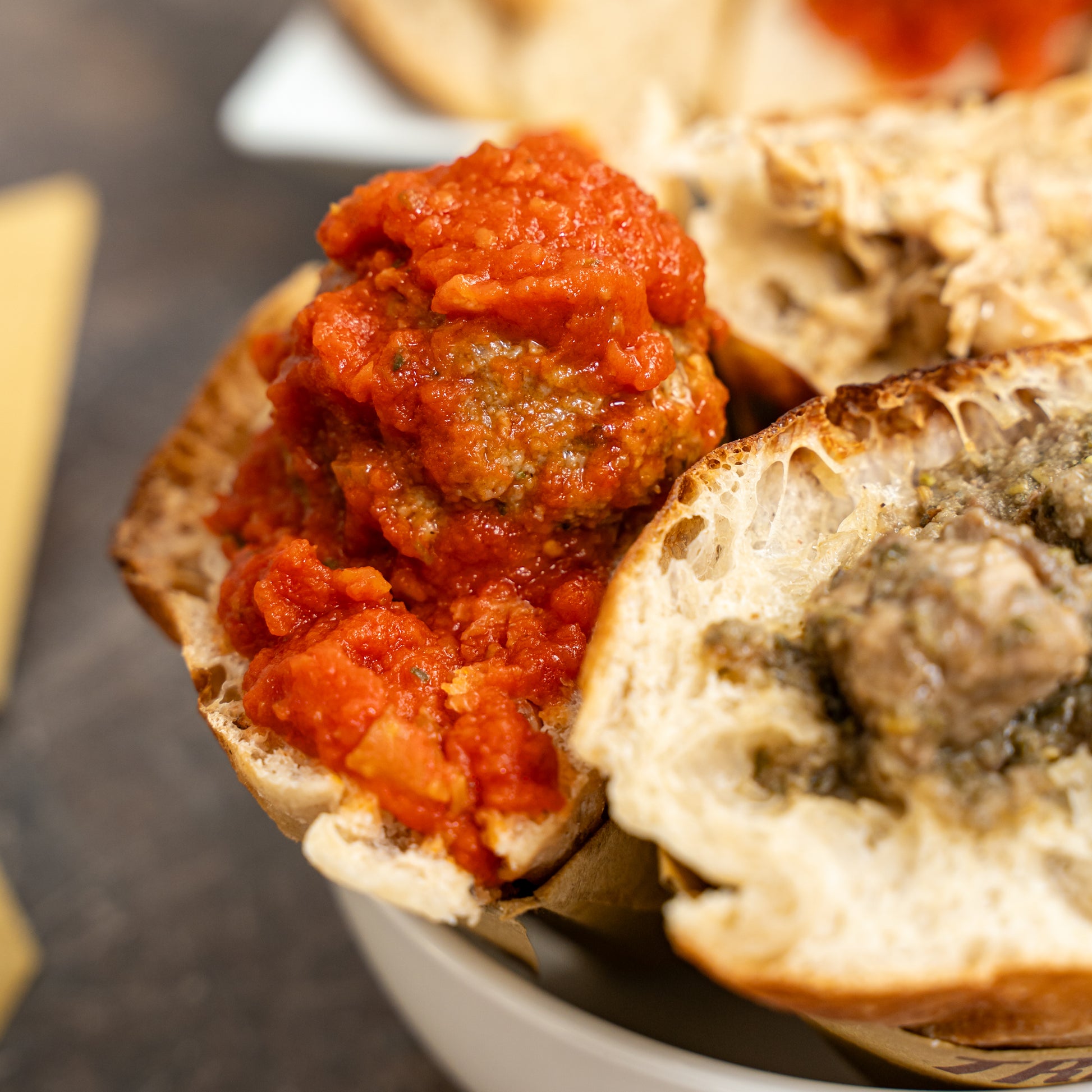 Trapizzino mit Fleischbällchen in Omas Sauce(4 Stück pro Portion): Rinderhackfleisch, Semmelbrösel, Ei, Parmesan, Petersilie, Salz, Knoblauch, Pfeffer, Muskatnuss. Zutaten für die Sauce: geschälte Tomaten, natives Olivenöl extra, Sellerie, Karotte, Zwiebel, Salz, Basilikum, Petersilie.