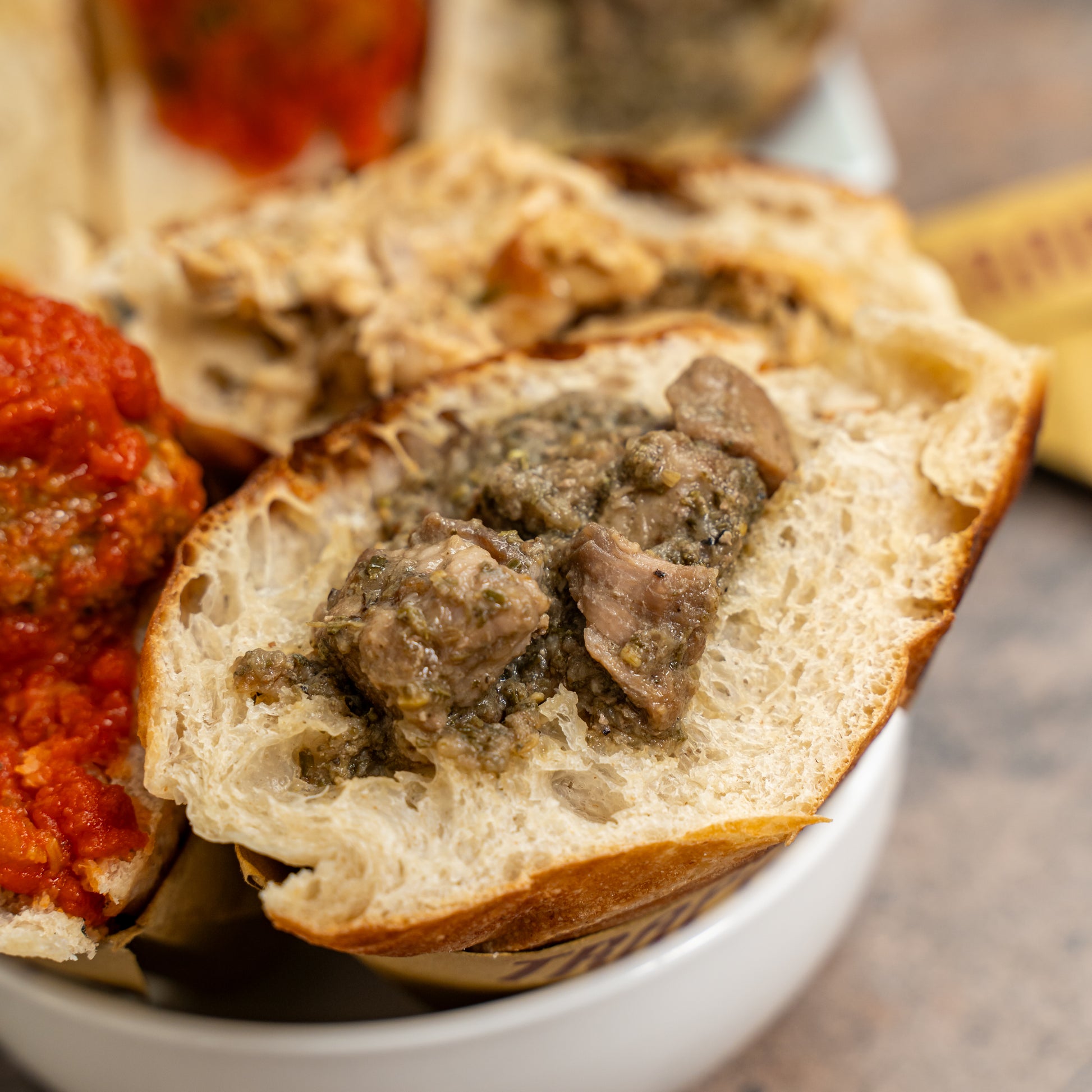 Trapizzino mit gekochtem Picchiapò-Fleisch(4 Stück pro Portion): eines der köstlichsten Rezepte der römischen Tradition! Piccatapò, oder gekochtes Fleisch „alla picchiapò“, ist eine leckere Art, das für die Brühe verwendete Fleisch wiederzuverwenden, indem man es in einem Eintopf auf Zwiebel- und Tomatenbasis kocht! *Allergene: 1 (hergestellt in einer Anlage, die folgende Allergene verwendet: 1/2/3/4/7/8/9/10/12/14).