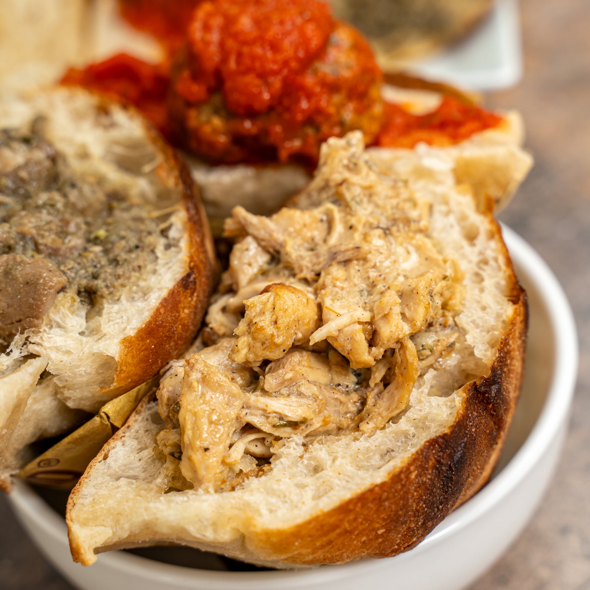 Trapizzino mit Hühnchen Cacciatore(4 Stück pro Portion): Hähnchen, Weißwein, Essig, Salz, natives Olivenöl extra, Knoblauch, Rosmarin, Pfeffer. Die ersten und beliebtesten Trapizzini!