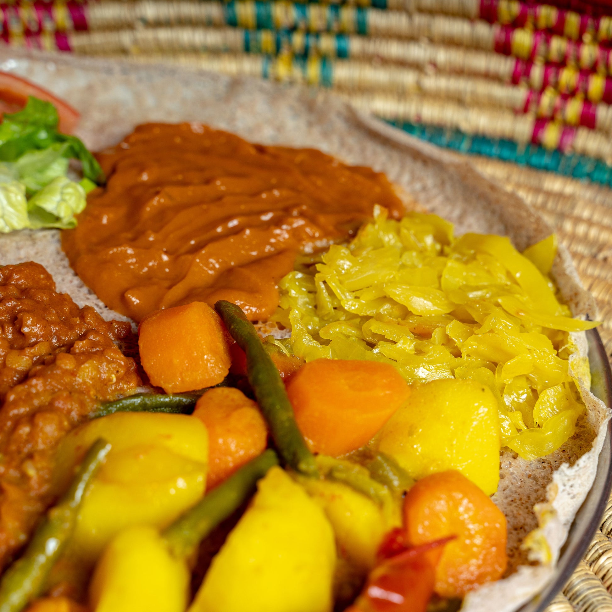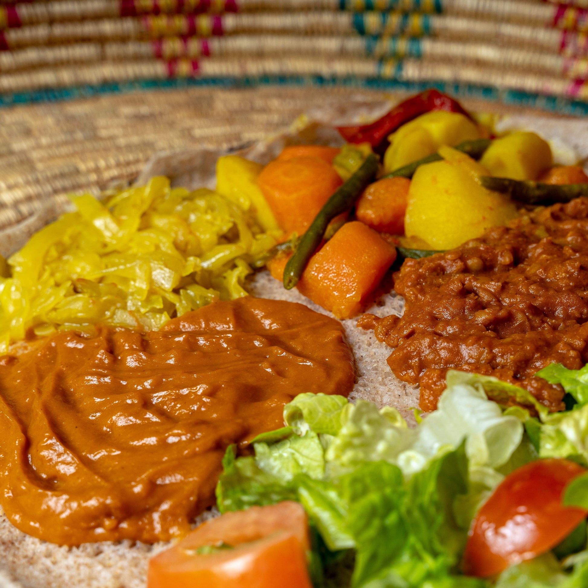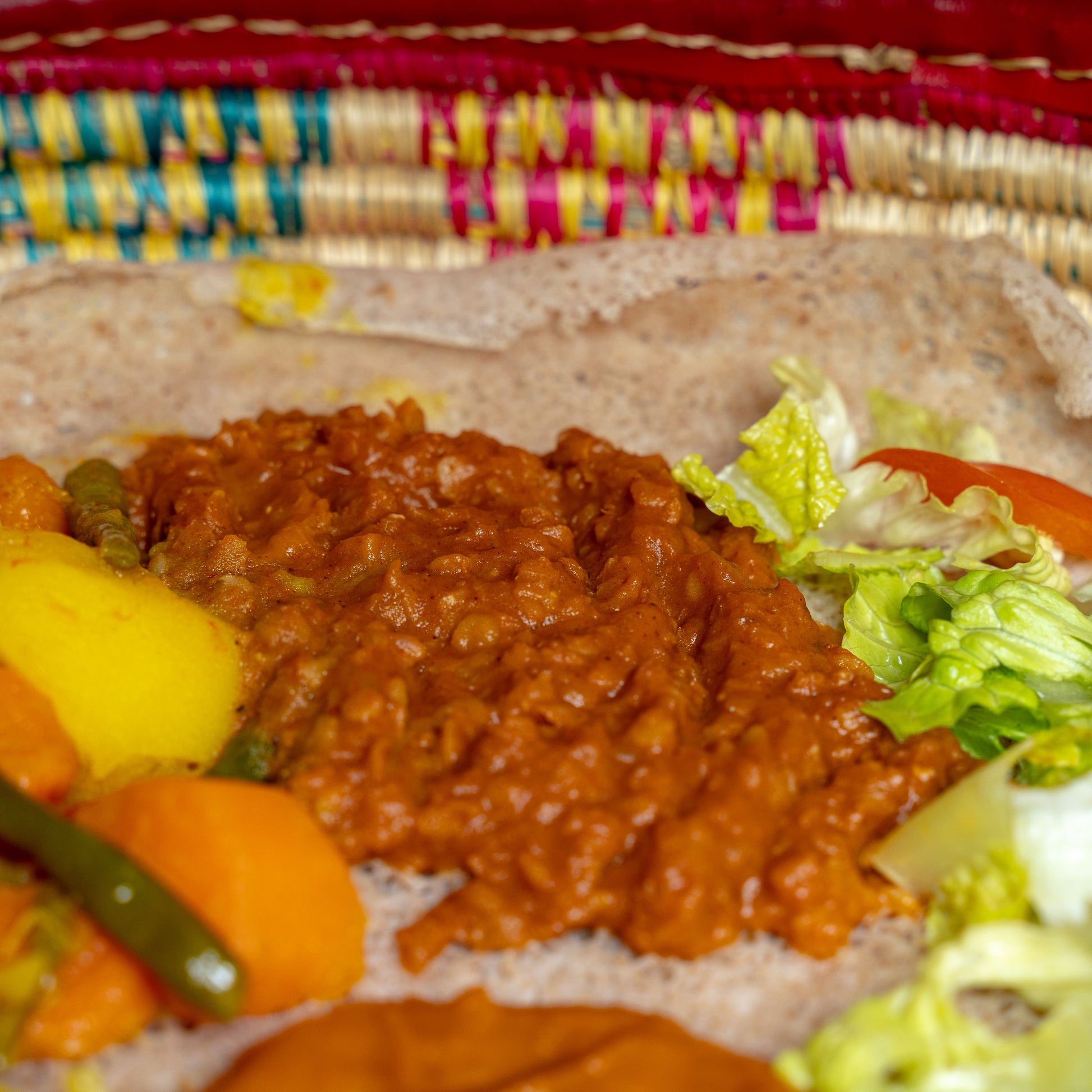 Dies ist ein Eintopfgericht, das Folgendes umfasst: Tumtumò, eine Mischung aus Linsen, Zwiebeln und Chili, serviert mit eritreischem Brot und einer Mischung aus Gemüsebeilagen. Es hat einen starken Geschmack mit einem Hauch vonmittel bis scharfTumtumò ersetzt Fleisch, ohne dass es vermisst wird.