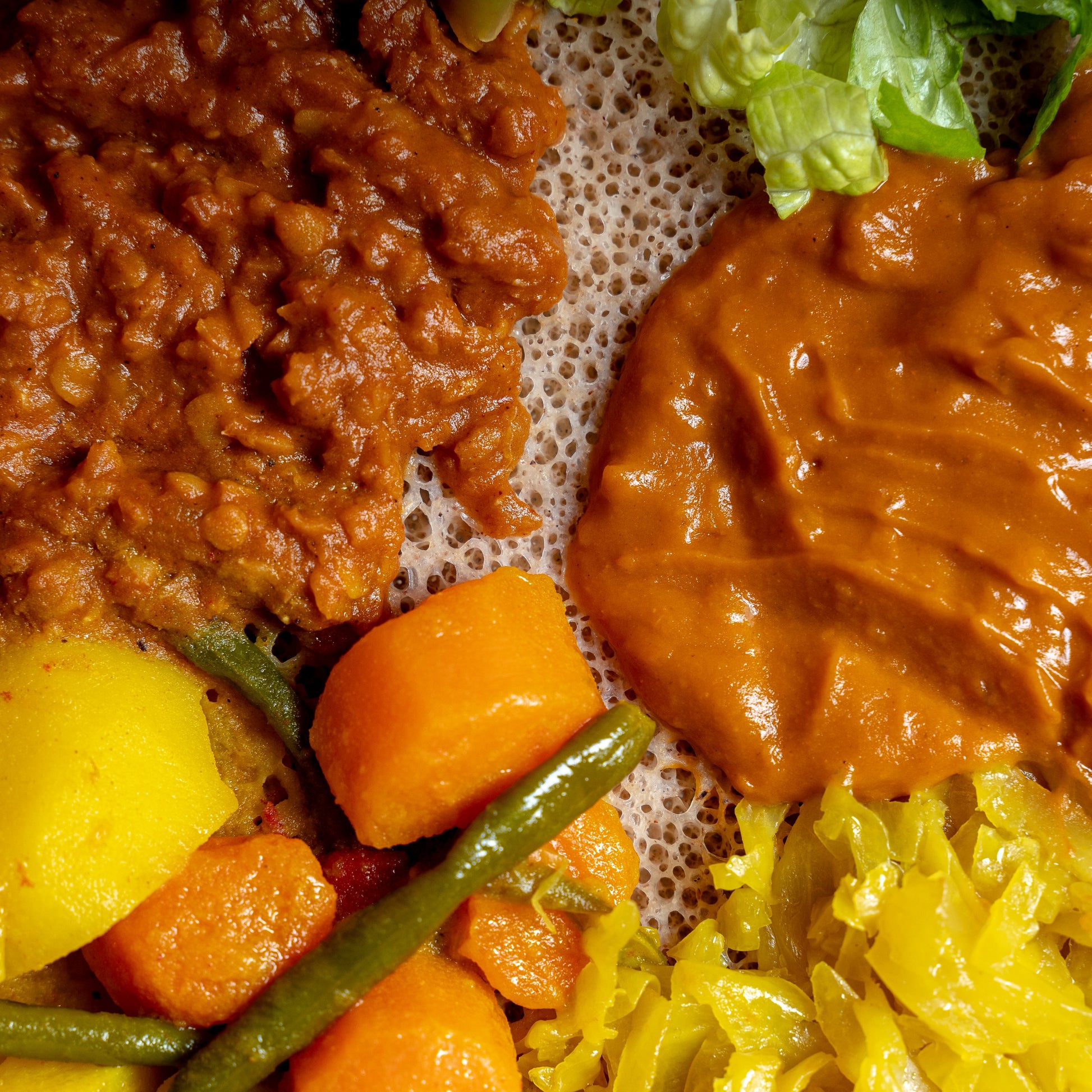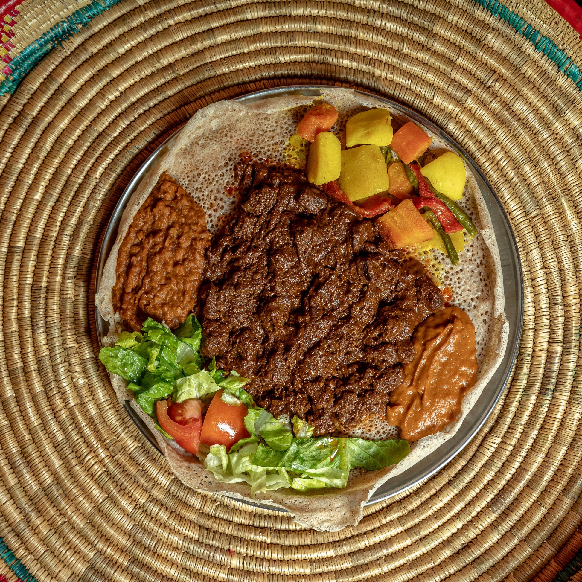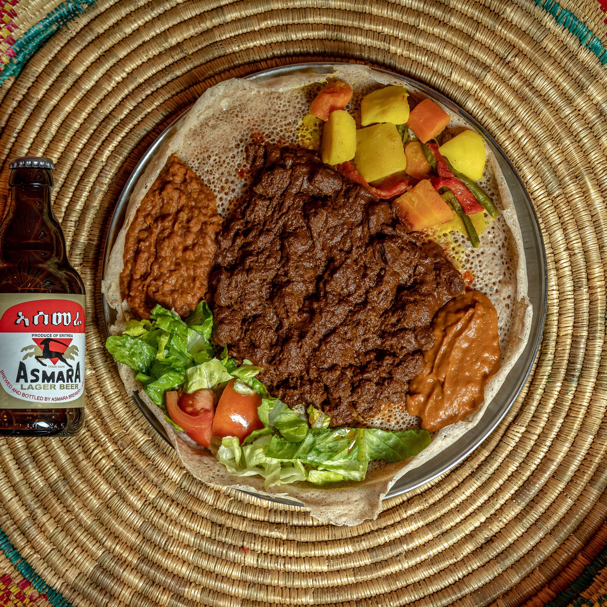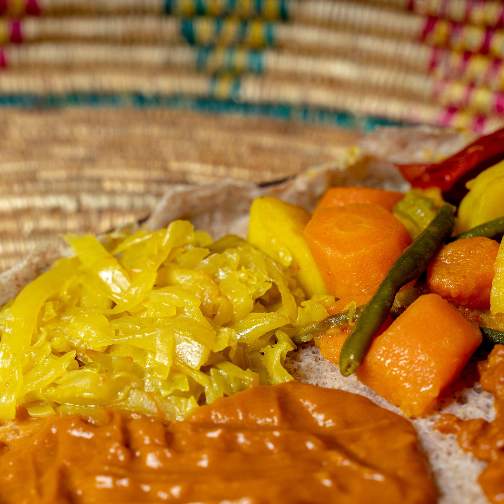 Dies ist ein Eintopfgericht, das Folgendes umfasst: Tumtumò, eine Mischung aus Linsen, Zwiebeln und Chili, serviert mit eritreischem Brot und einer Mischung aus Gemüsebeilagen. Es hat einen starken Geschmack mit einem Hauch vonmittel bis scharfTumtumò ersetzt Fleisch, ohne dass es vermisst wird.