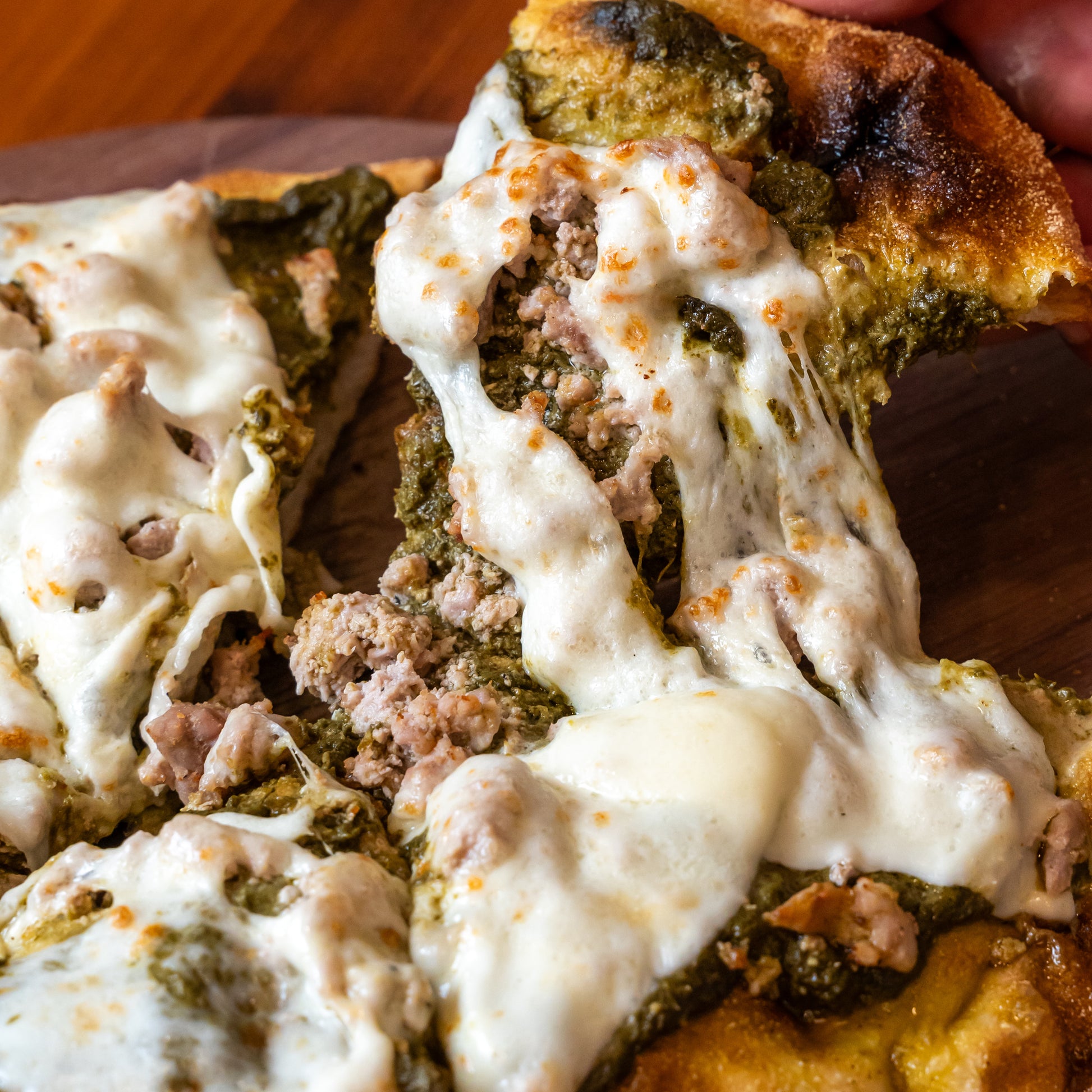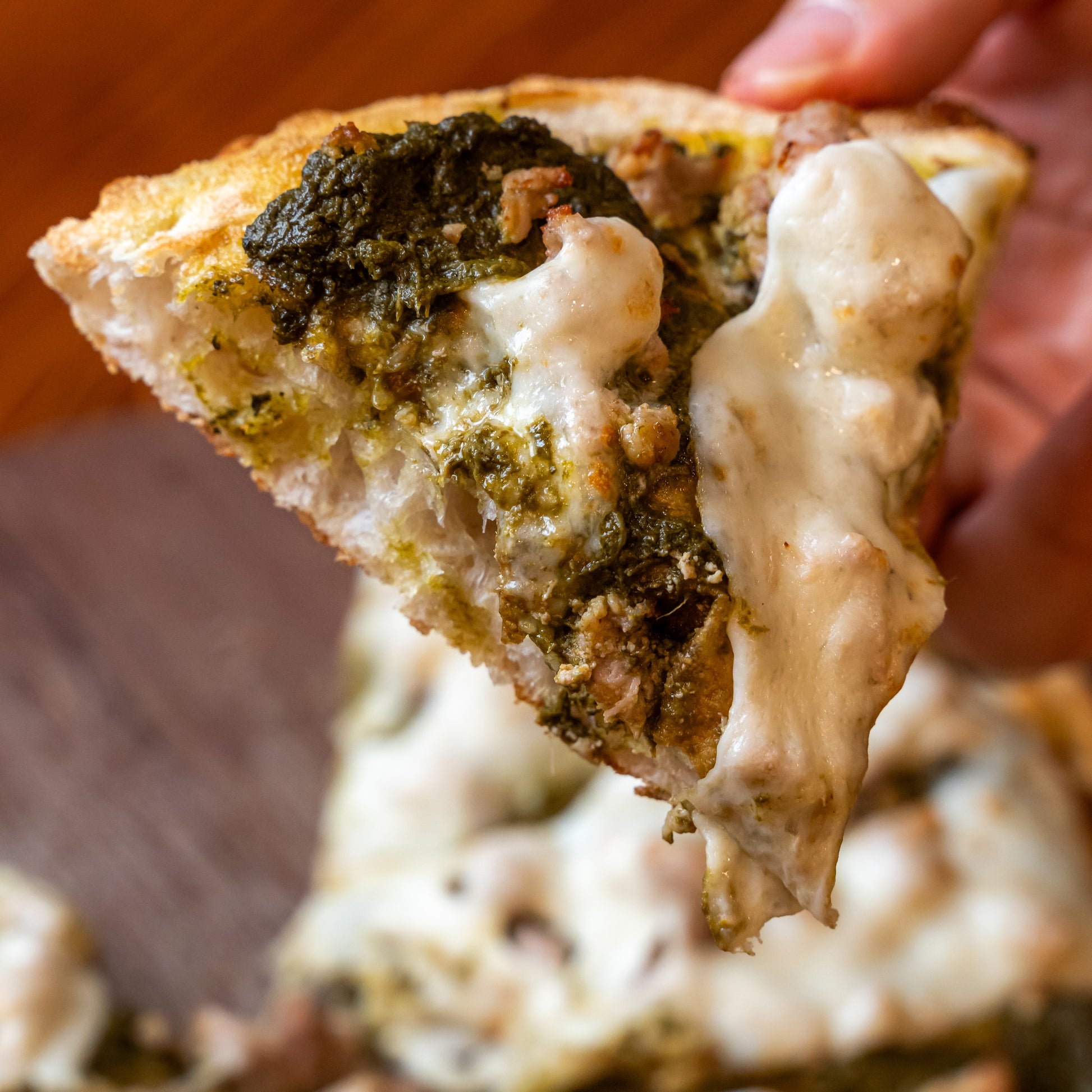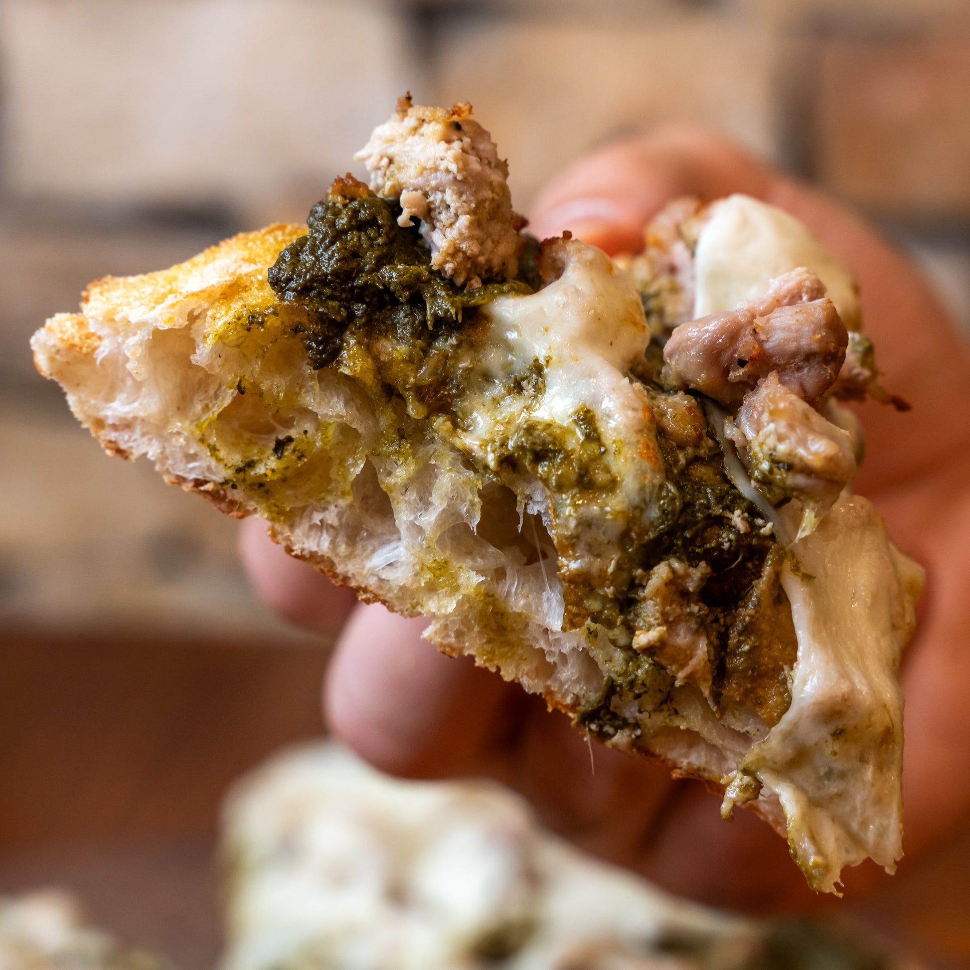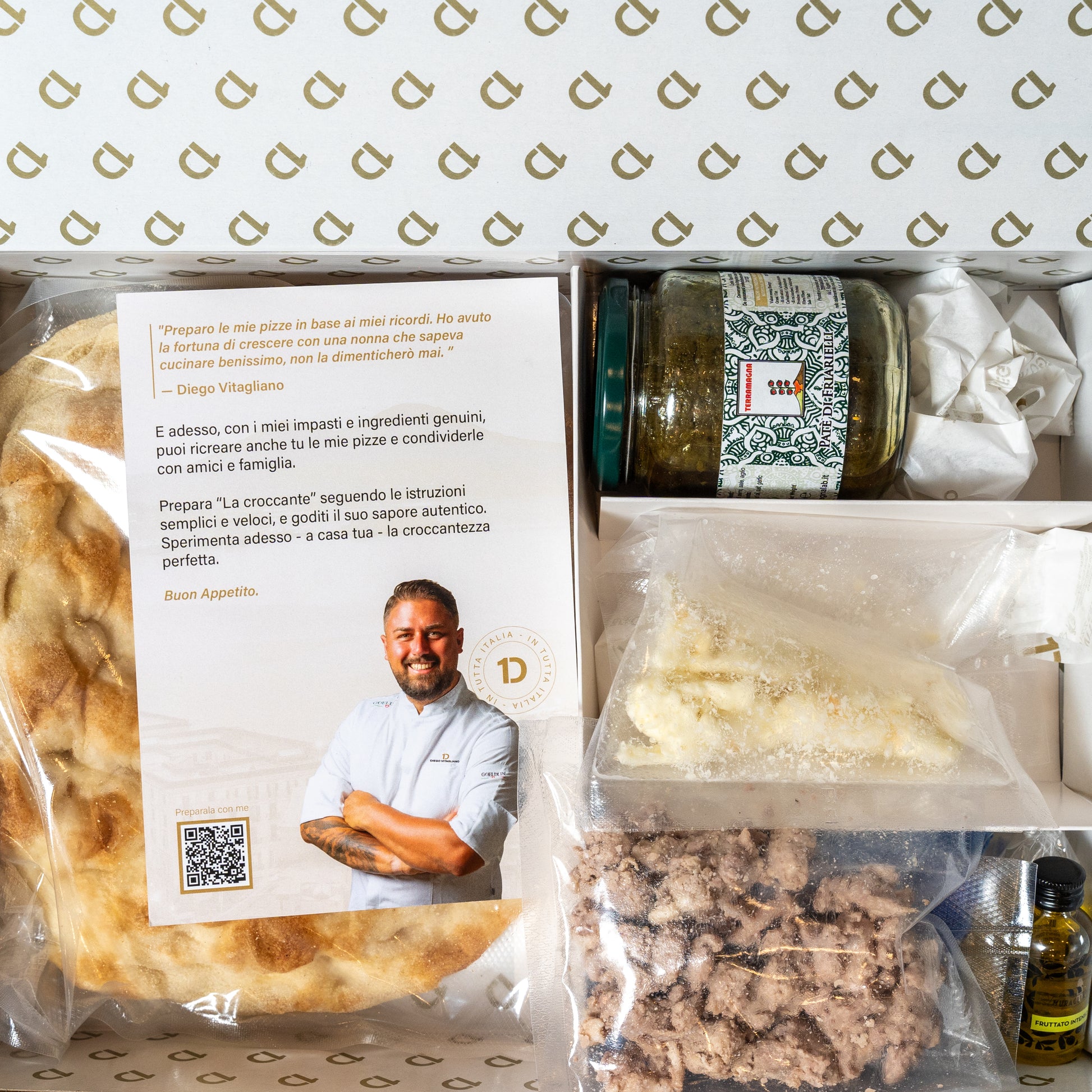 Die Carrettiera-Pizza von Diego Vitagliano erinnert an die alten Aromen Kampaniens und an die Wurst und den Stängelkohl Marenna, einen traditionellen Maurersnack. Die Zutaten? Rahm-Stängelkohl , Campi Flegrei -Schweinswurst und geräucherte Provola . Die Box wird direkt von Vitaglianos Restaurant hergestellt!