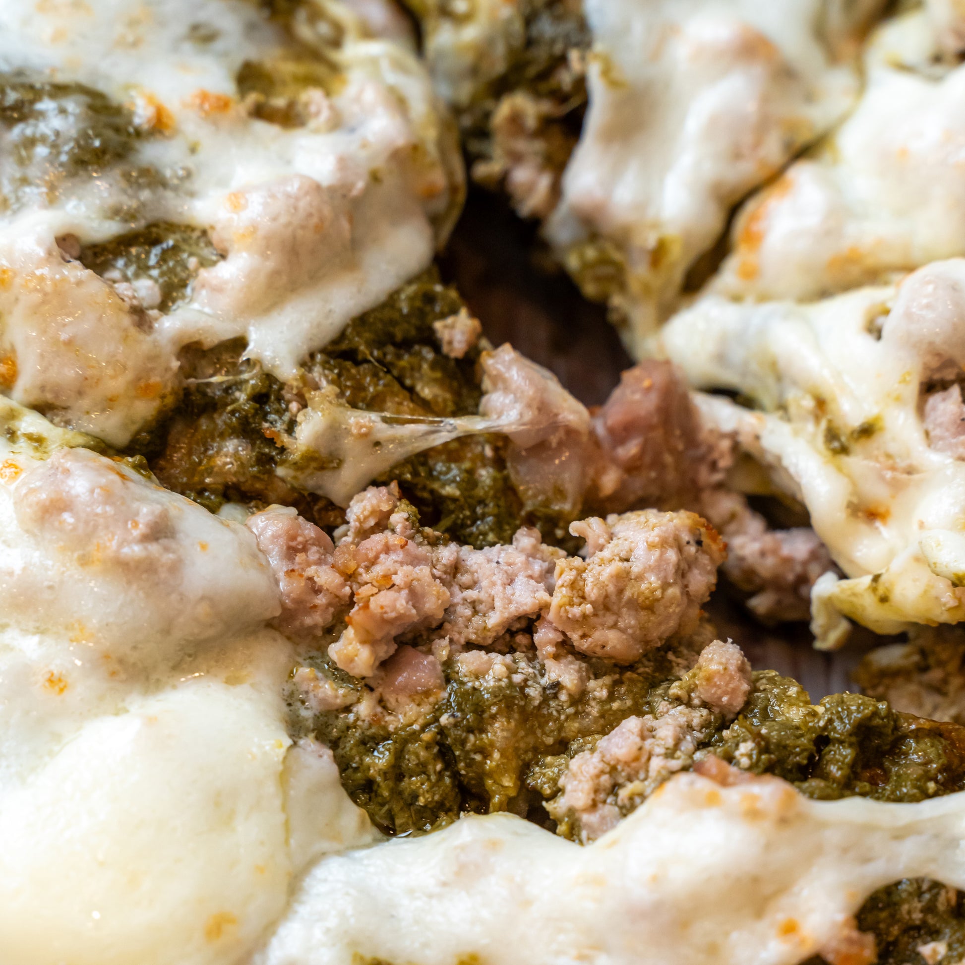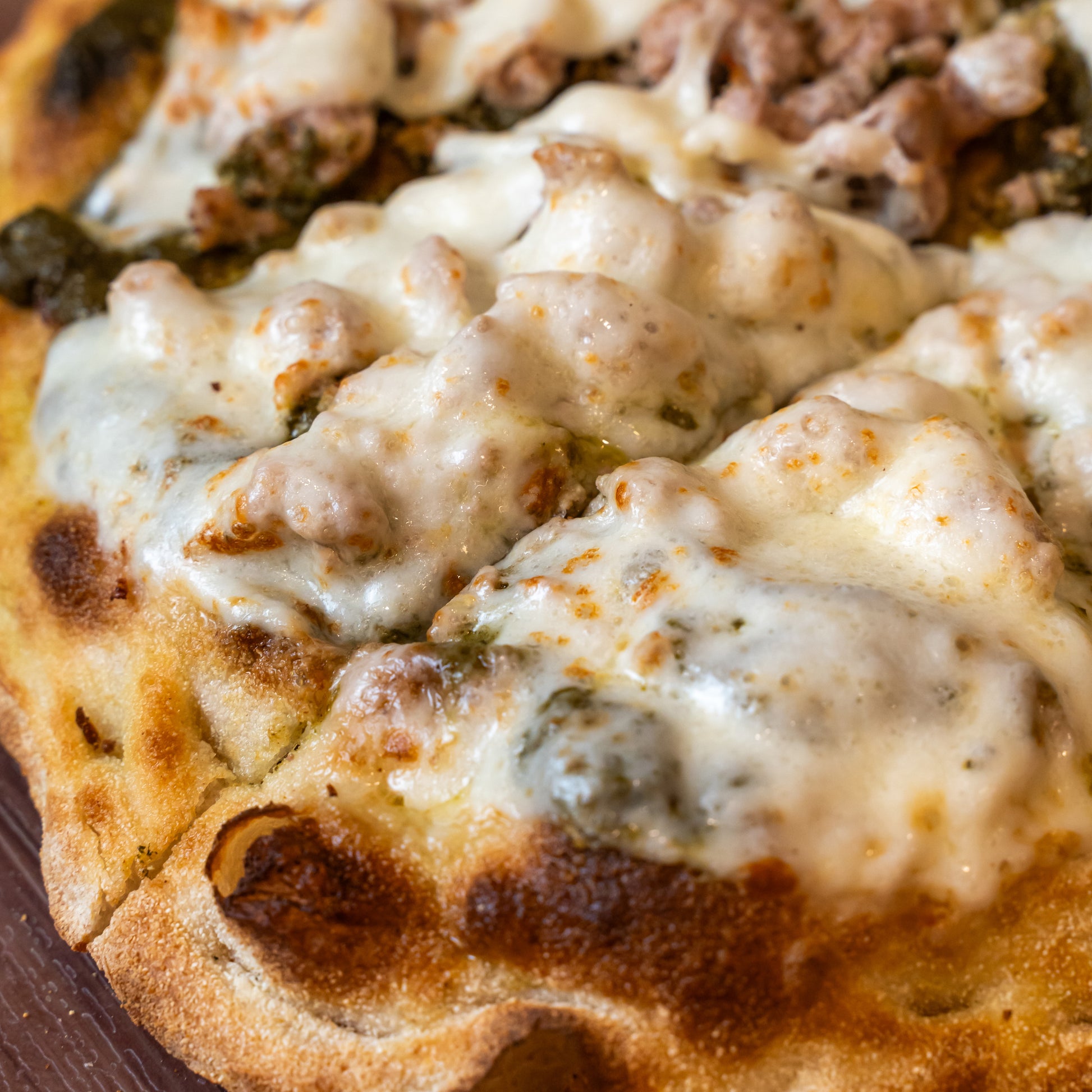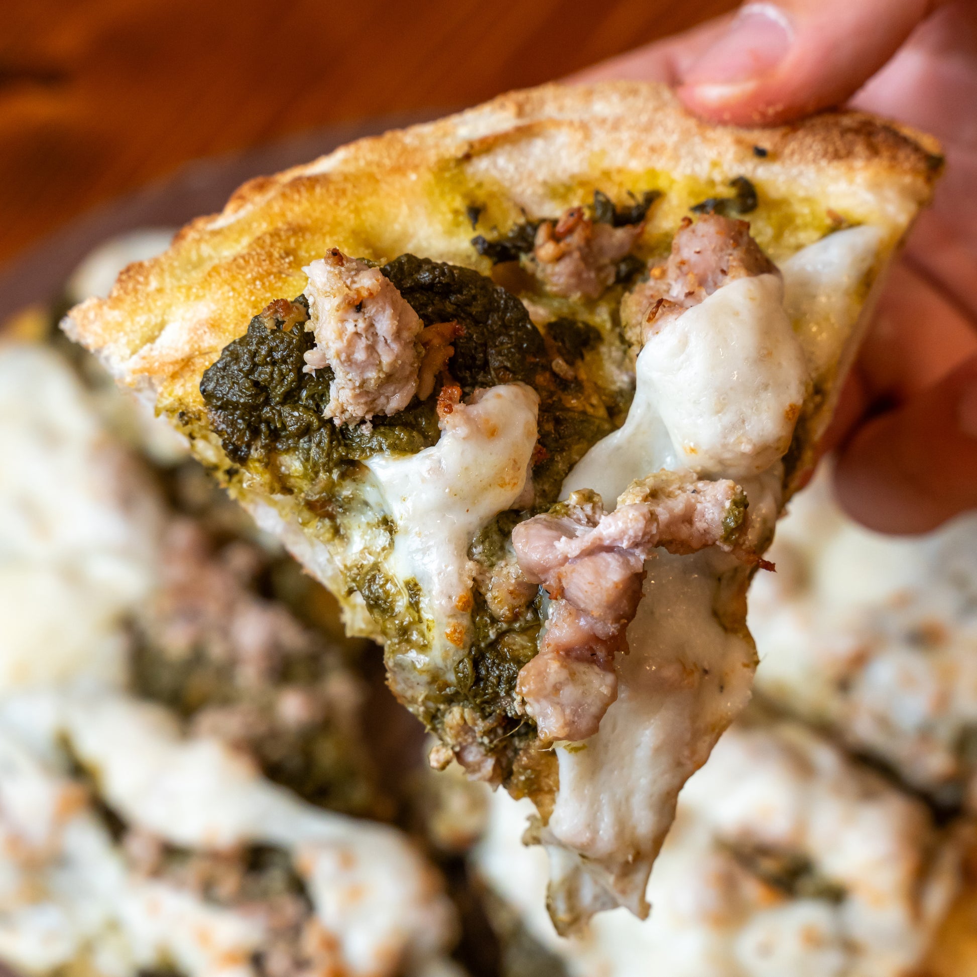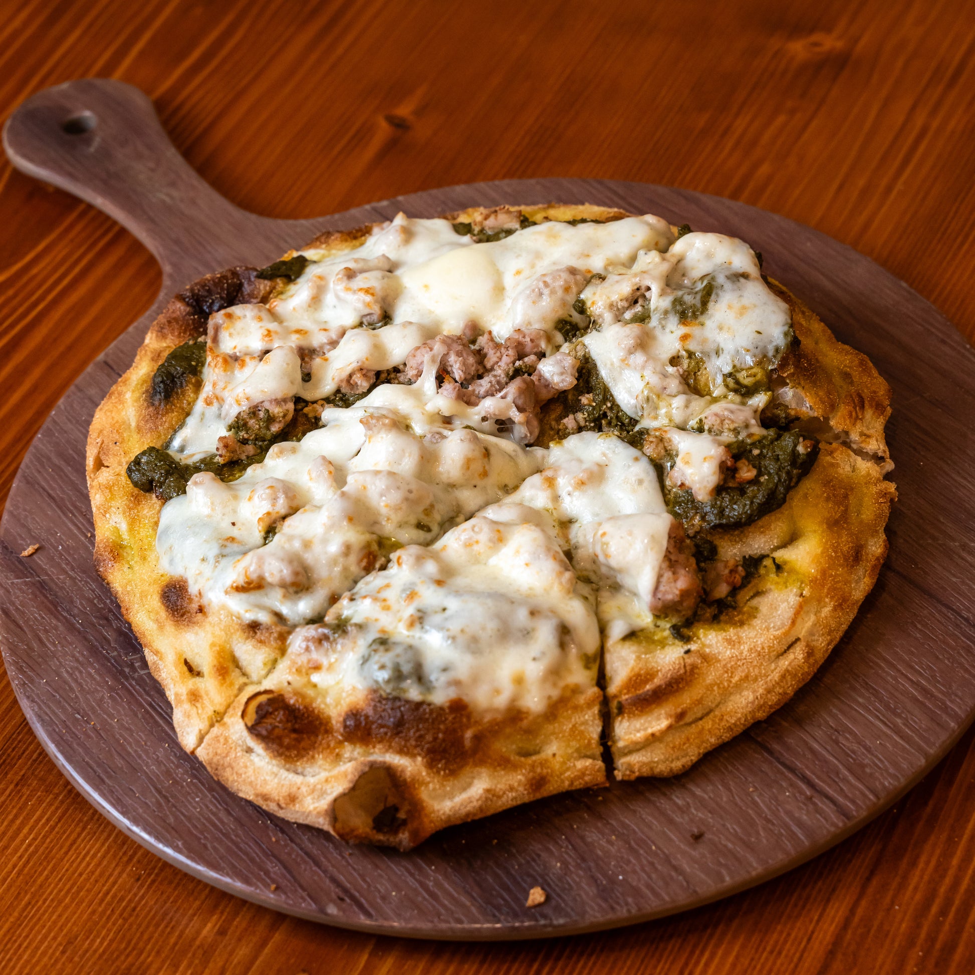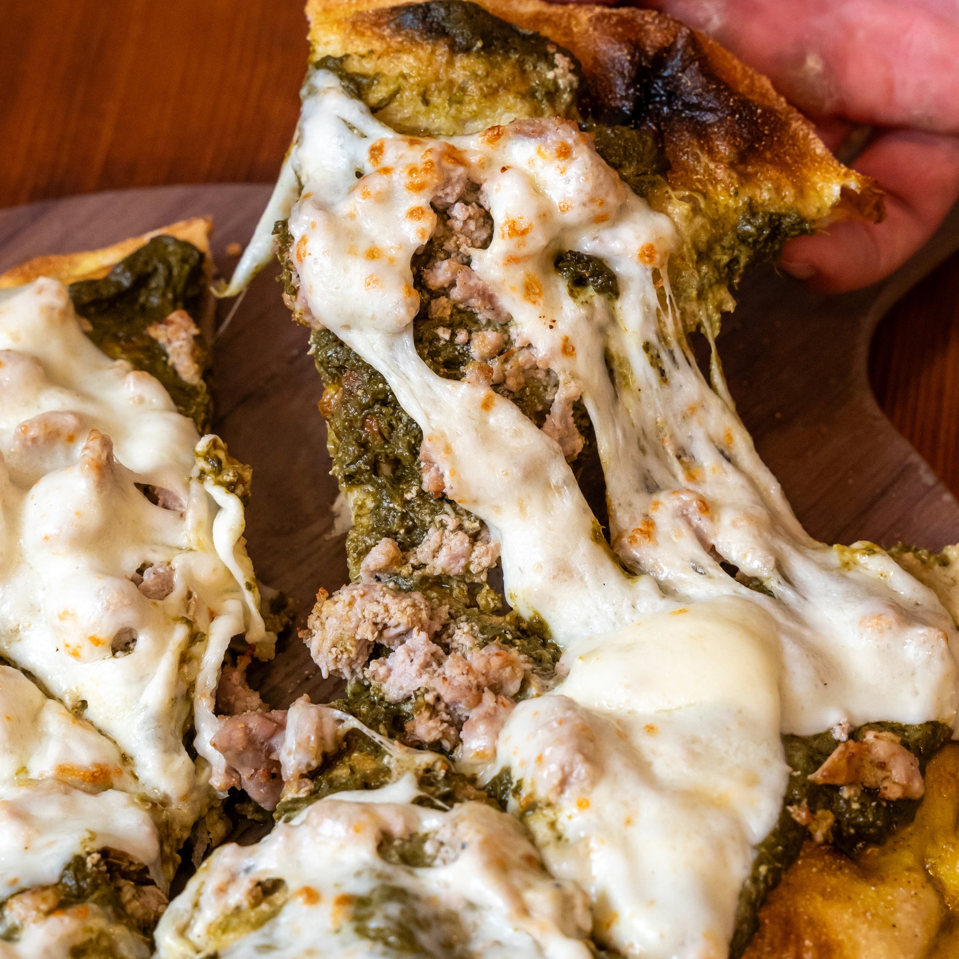 Die Carrettiera-Pizza von Diego Vitagliano erinnert an die alten Aromen Kampaniens und an die Wurst und den Stängelkohl Marenna, einen traditionellen Maurersnack. Die Zutaten? Rahm-Stängelkohl , Campi Flegrei -Schweinswurst und geräucherte Provola . Die Box wird direkt von Vitaglianos Restaurant hergestellt!