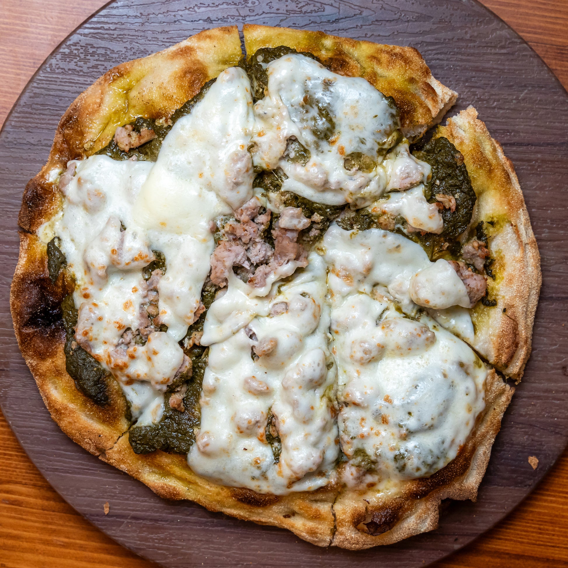 DortCarrettiera-PizzaVonVitaglianoerinnert an diemarennaVonWurstUndStängelkohl, der alte neapolitanische Maurersnack. Eine Pizza, die an Marenna-Wurst und Stängelkohl erinnert, den alten neapolitanischen Maurersnack.