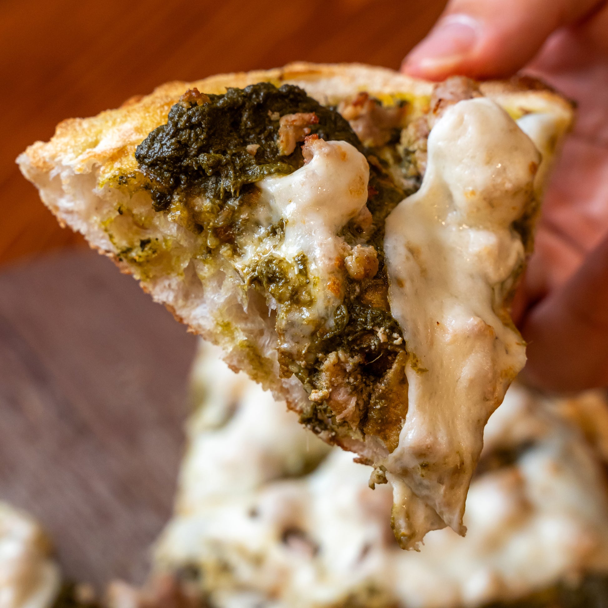 DortKnusprige PizzaVonDiego VitaglianoEs handelt sich um eine Kreuzung zwischenRömische Pizzaund dasNeapolitan, mit einer knusprigen Oberfläche und einem weichen, wolkenartigen Inneren.