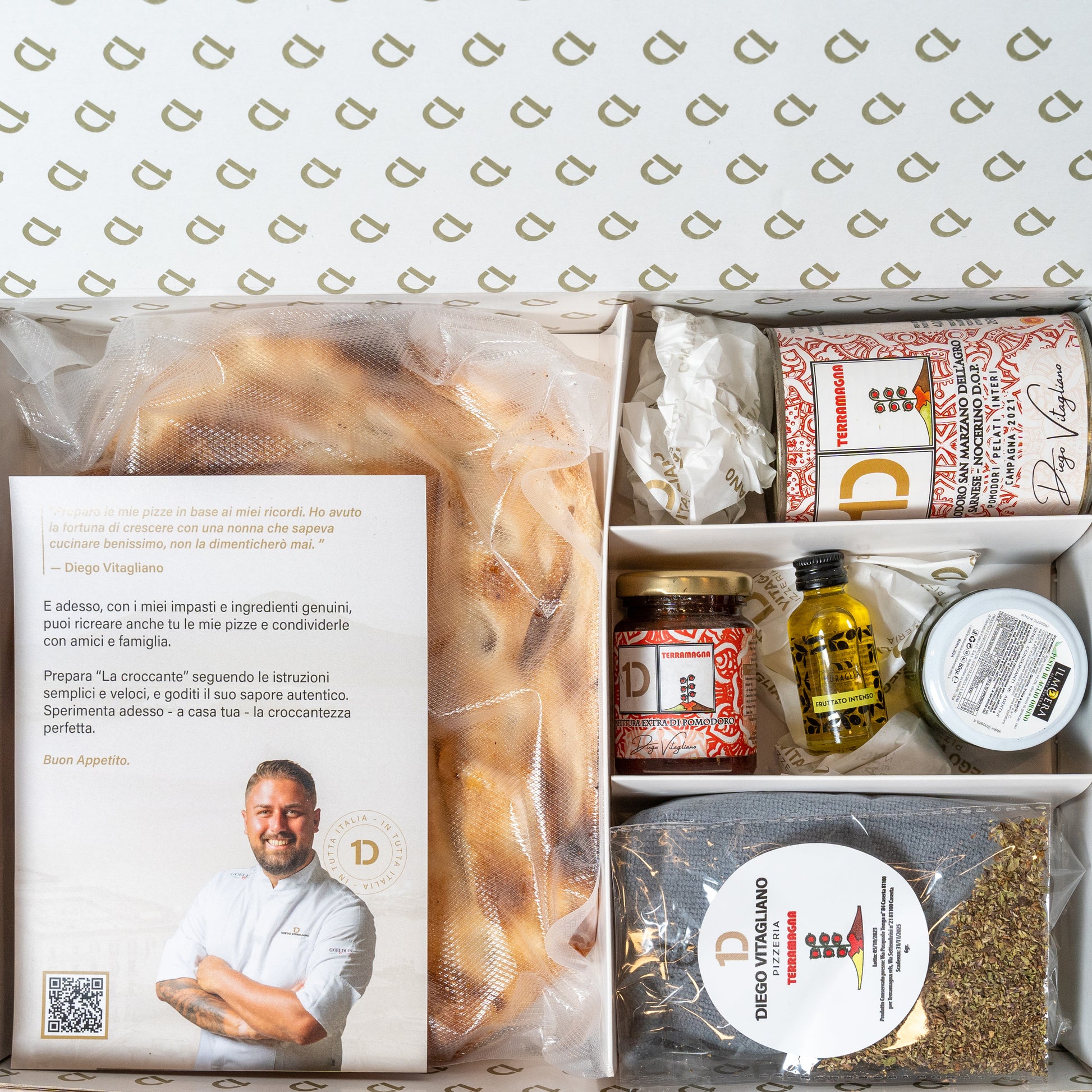 Diego Vitagliano nimmt uns mit auf eine Reise, um seine weltberühmte Pizza, die Crispy Crust , zu entdecken: eine Mischung aus neapolitanischen und römischen Traditionen. Probieren Sie unsere Box und probieren Sie die legendären Pizzen von Maestro Vitagliano , die direkt in seinem Restaurant mit lokalen Zutaten zubereitet werden: Margherita , Carrettiera , Marinara Sbagliata – welche ist Ihre Lieblingspizza?