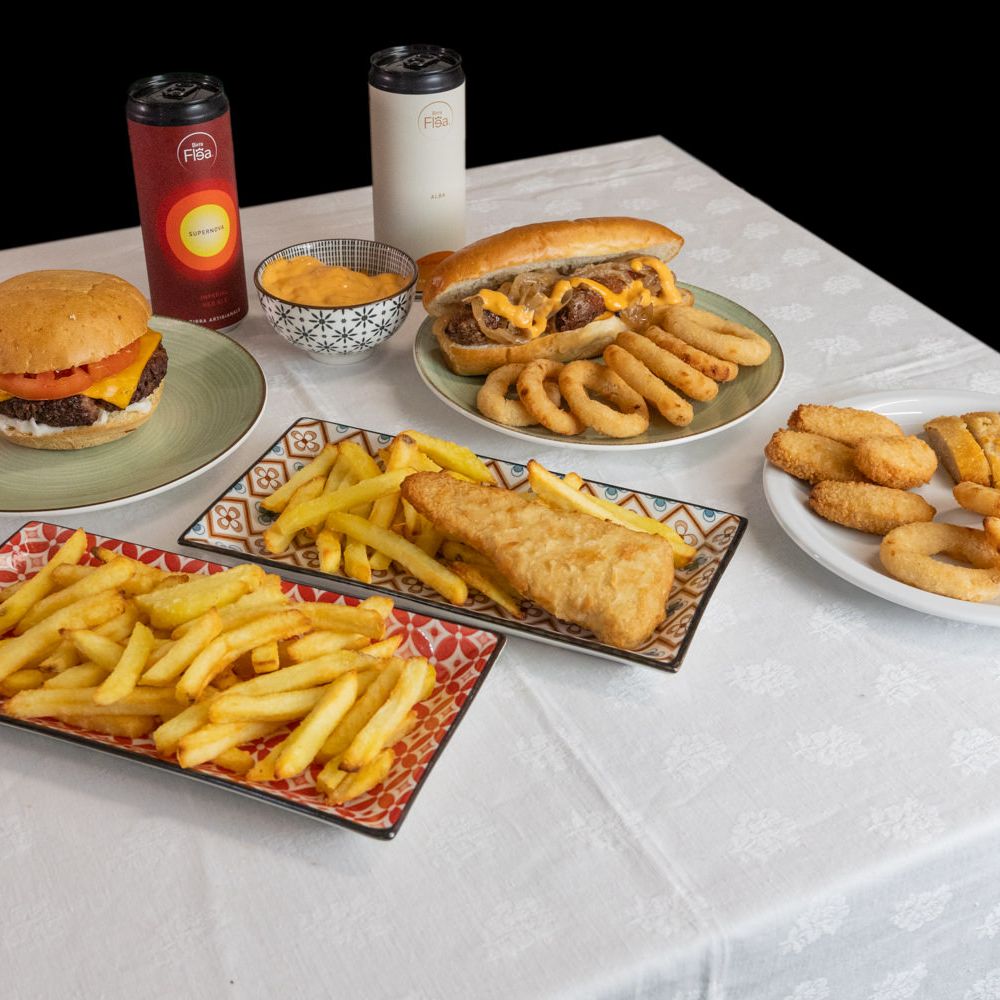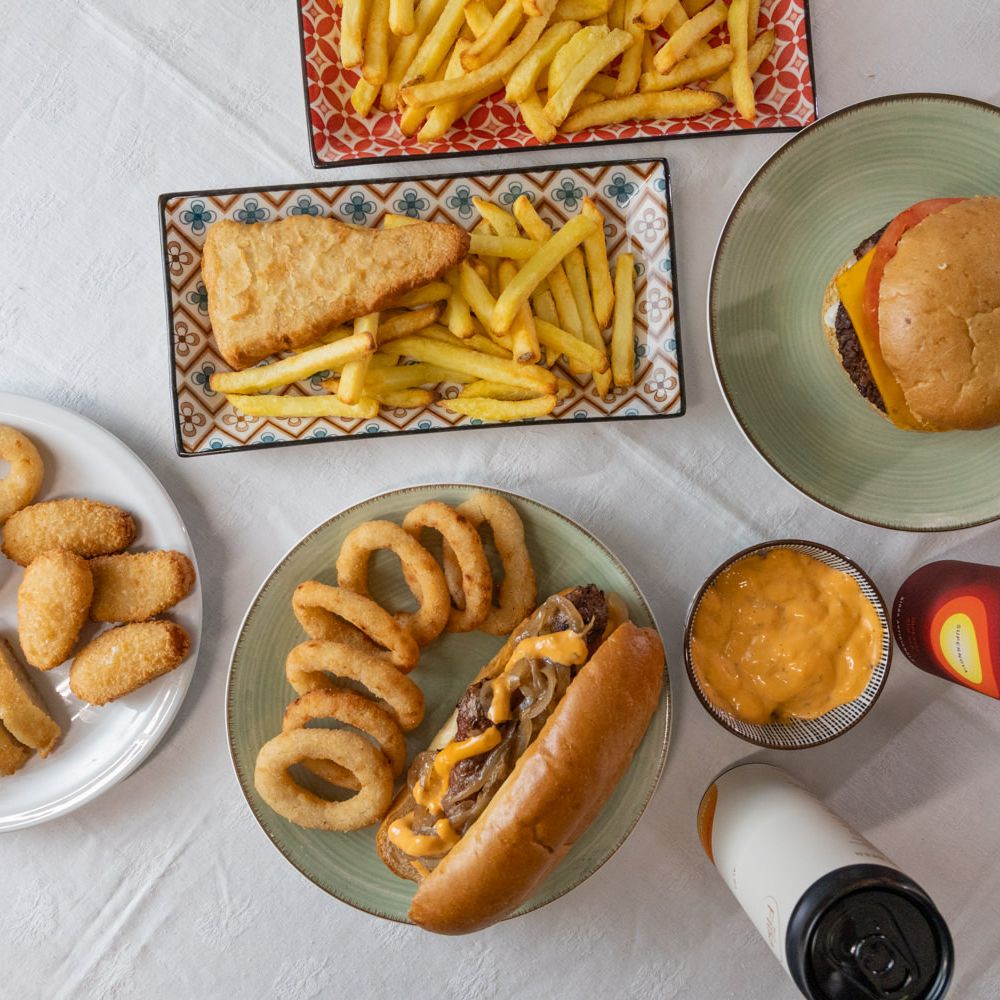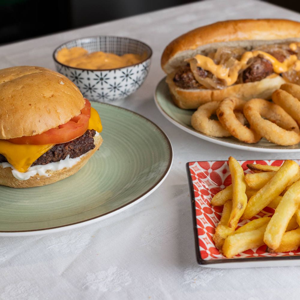 Eine Verkostung von 100 % pflanzlichen Produkten für zwei . Saftige Sandwiches , leckere Frittiertes und leckere, cremige Saucen warten darauf, entdeckt zu werden!