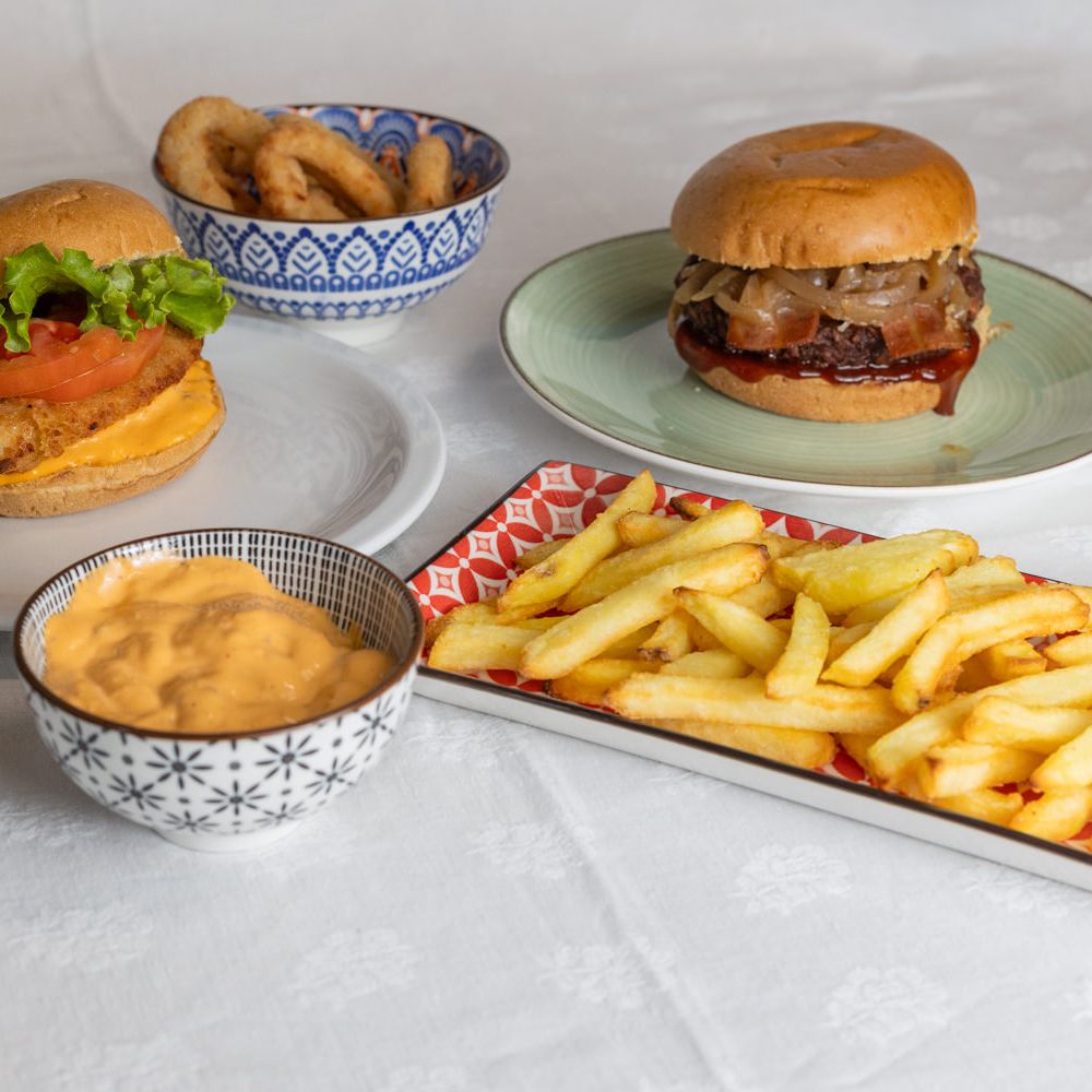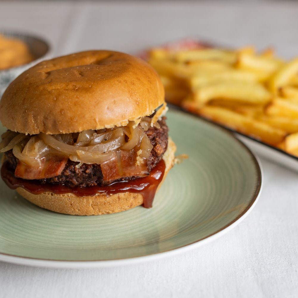 • Bacon Burger: Handwerklich hergestelltes Brötchen, Burger, karamellisierte Zwiebeln, Speck und BBQ-Sauce